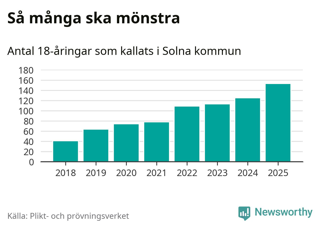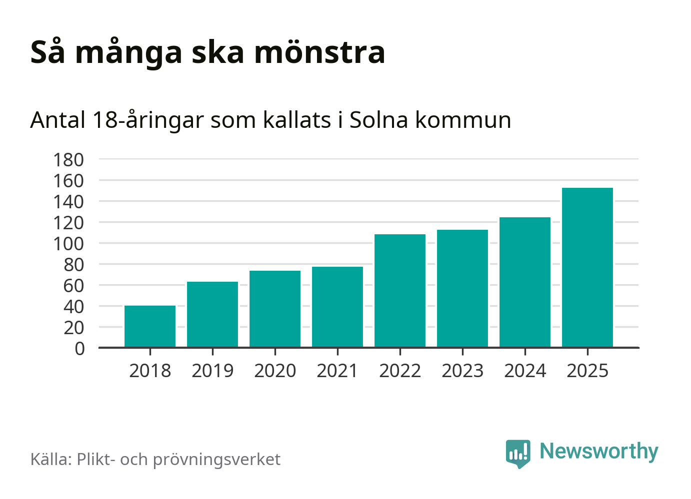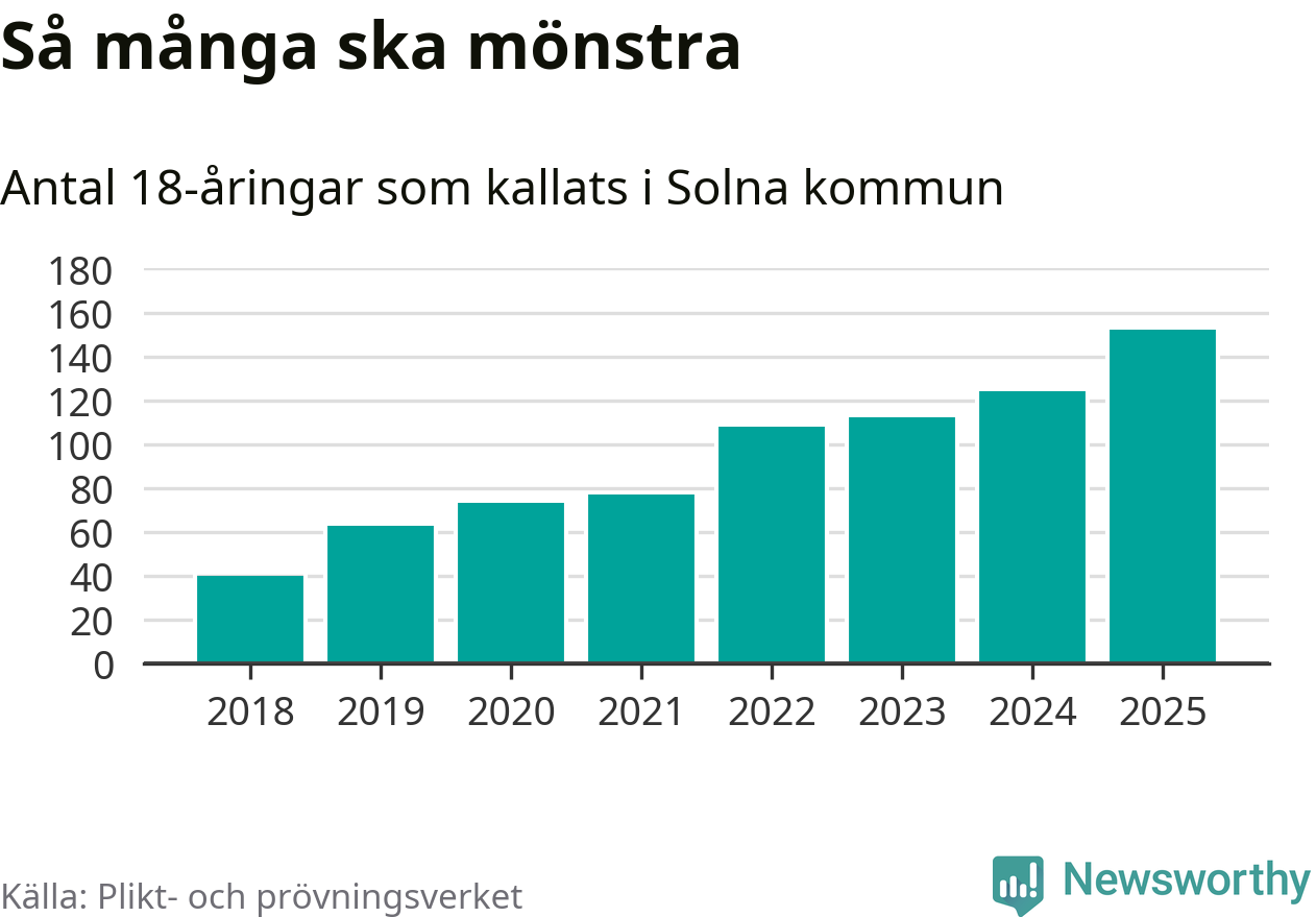 Nu kallas omkring 28 200 svenskar födda 2007 till mönstring. Och 152 av dem kommer från Solna, enligt ny statistik från Plikt- och prövningsverket. Det innebär att nästan var fjärde invånare i åldersgruppen i kommunen kallas till mönstring. Det är ungefär lika stor andel som i Stockholms län totalt. Även i riket som helhet kallas nästan var fjärde person i årskullen.
