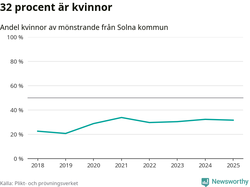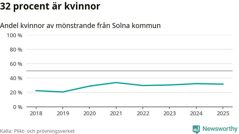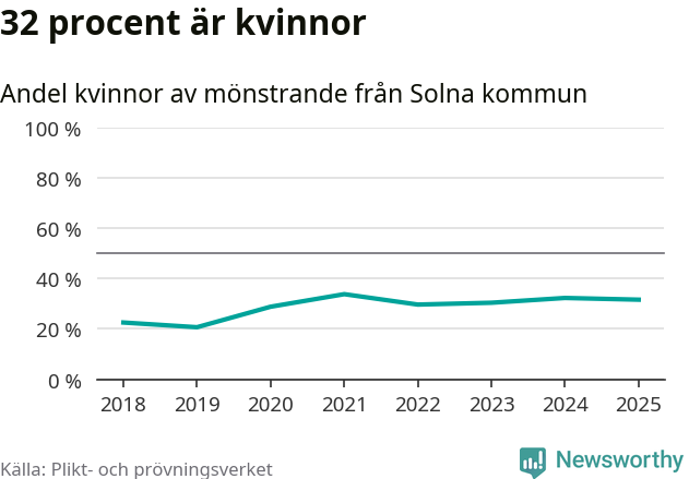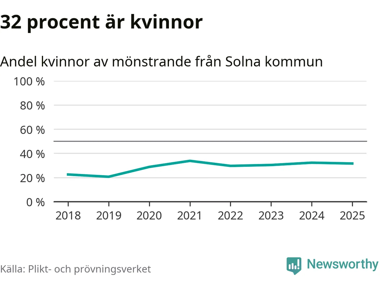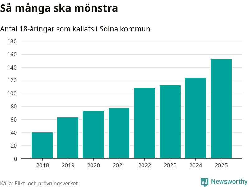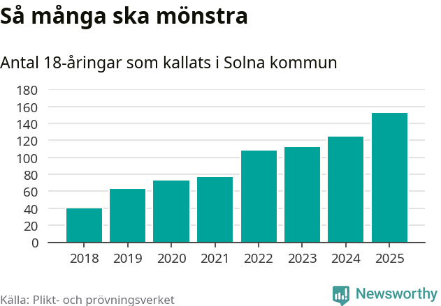 Nu kallas omkring 28 200 svenskar födda 2007 till mönstring. Och 152 av dem kommer från Solna, enligt ny statistik från Plikt- och prövningsverket. Det innebär att nästan var fjärde invånare i åldersgruppen i kommunen kallas till mönstring. Det är ungefär lika stor andel som i Stockholms län totalt. Även i riket som helhet kallas nästan var fjärde person i årskullen.