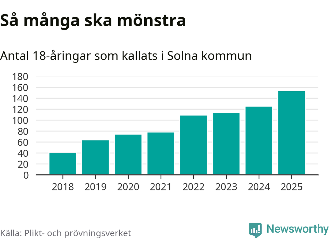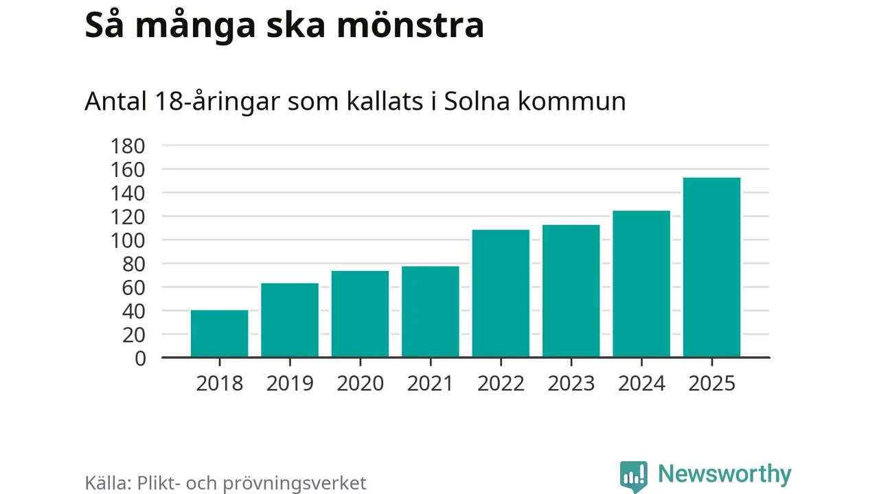 Antalet kallade i Solna har ökat varje år sedan 2018, som är första året med statistik på kommunnivå (värnplikten återinfördes 2017), och jämfört med 2024 är det 28 fler i år. Totalt från Stockholms län kallas 6 801 personer i år.