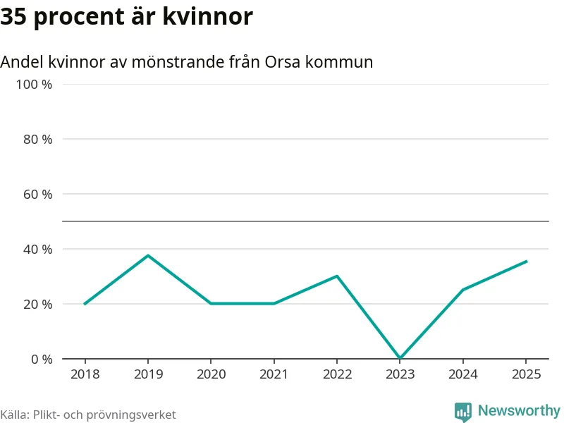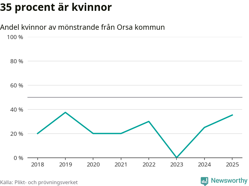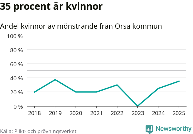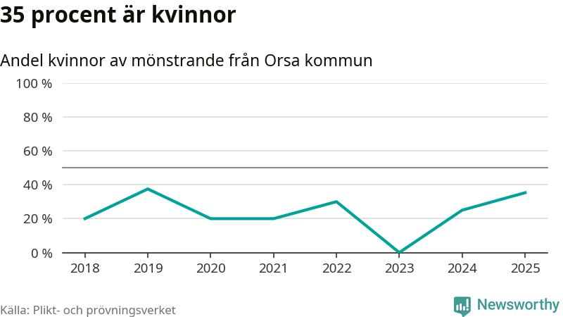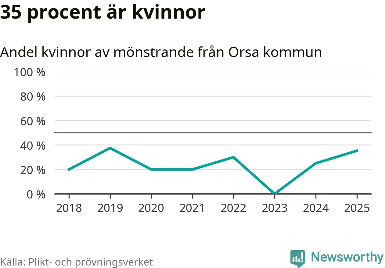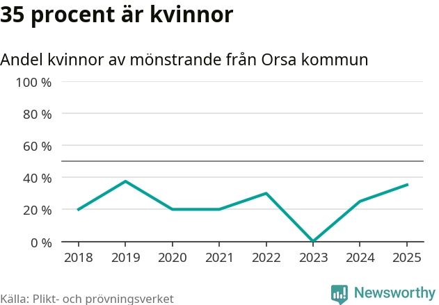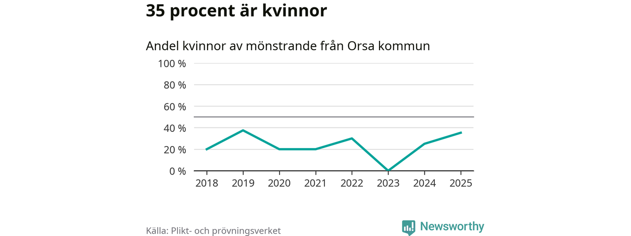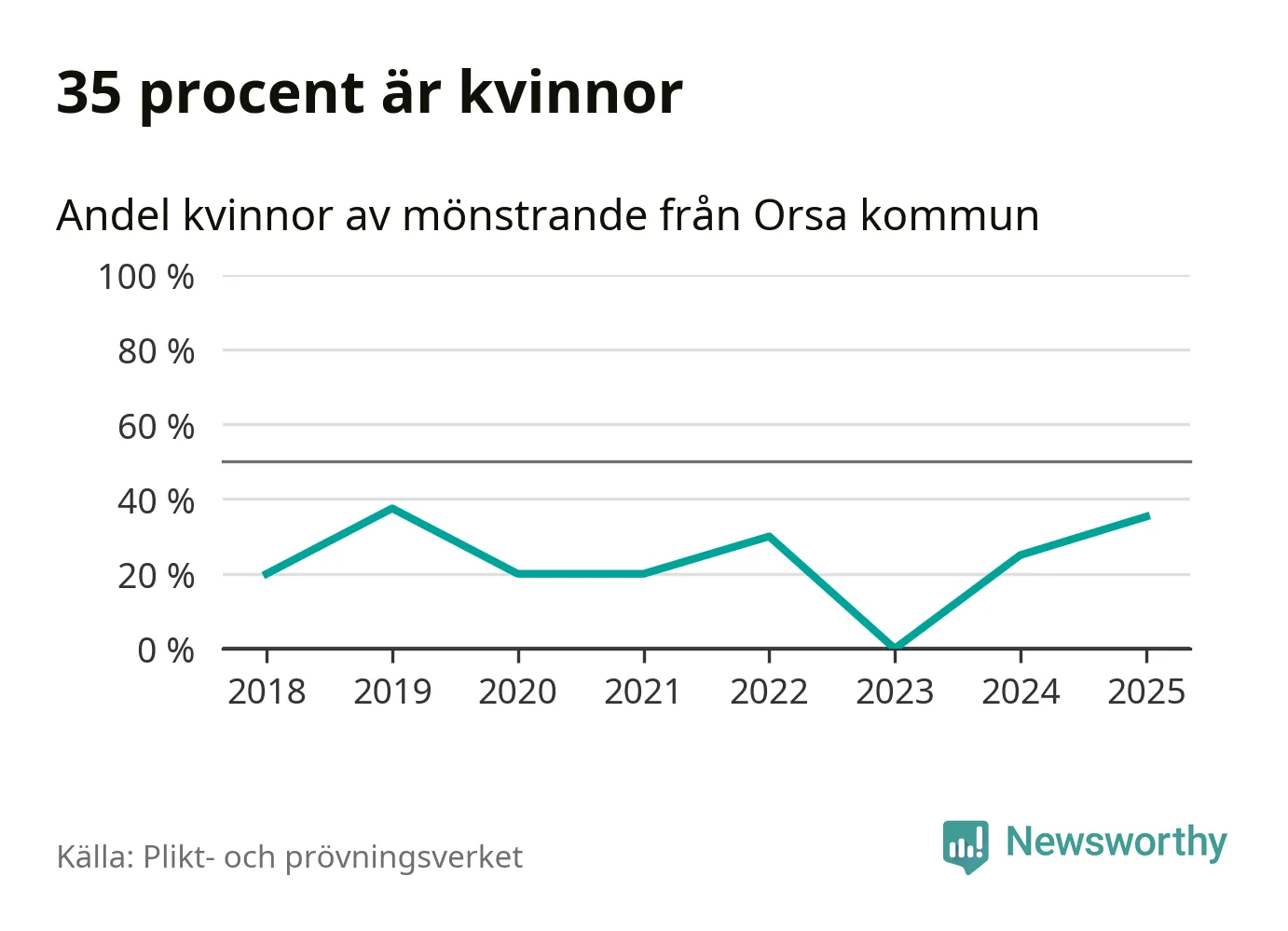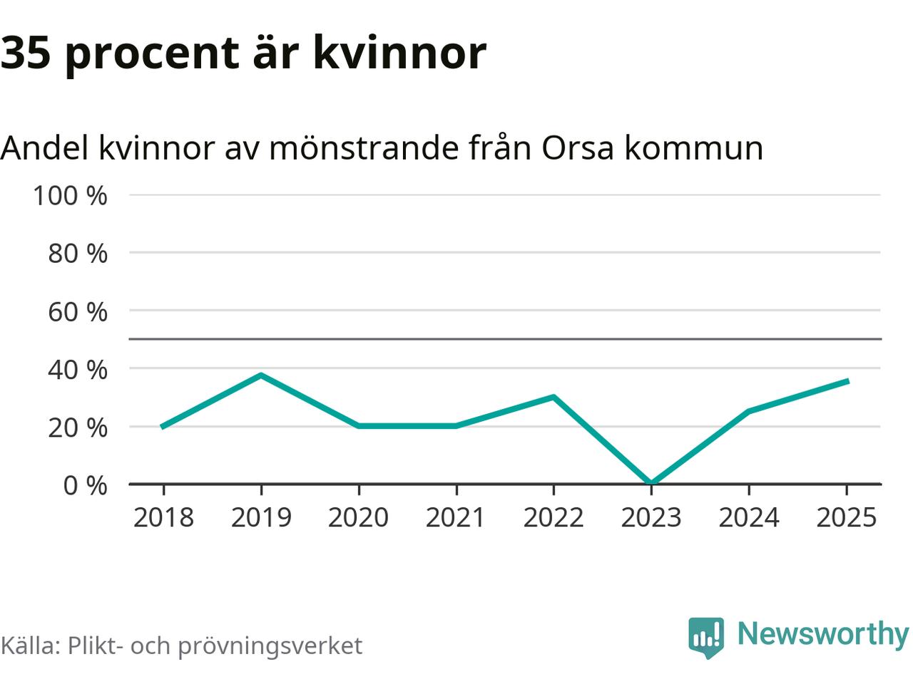 Sex av de som kallats till mönstring från Orsa är kvinnor, vilket motsvarar 35 procent av de mönstrande. I absoluta tal är det fler kvinnor än något år sedan värnplikten återinfördes, men 2019 var en större andel av de mönstrande från kommunen kvinnor (38 procent). I riket som helhet är 28 procent av de mönstrande tjejer.