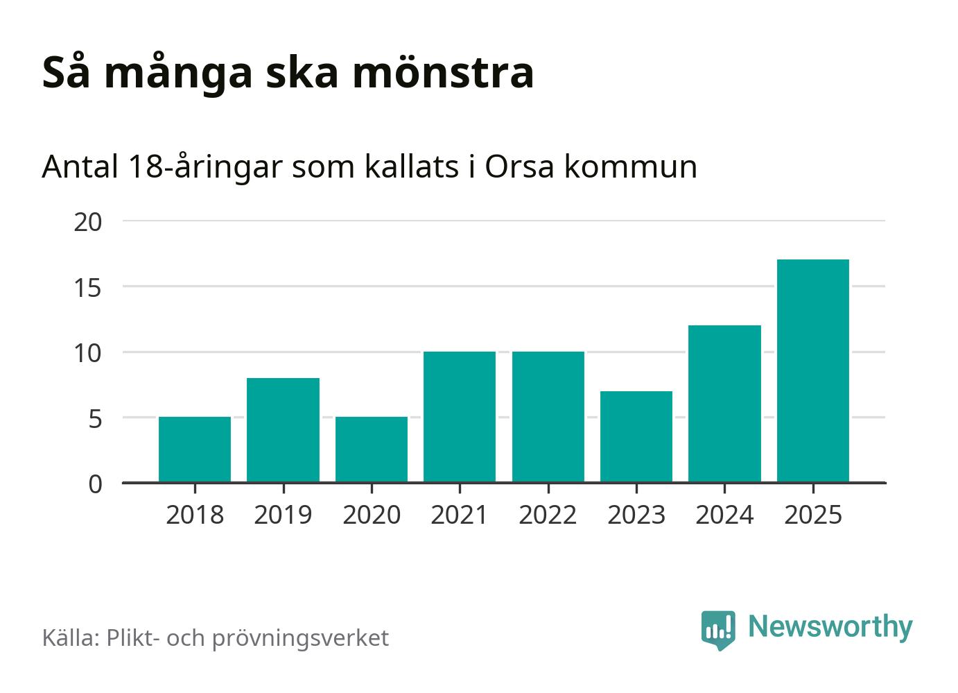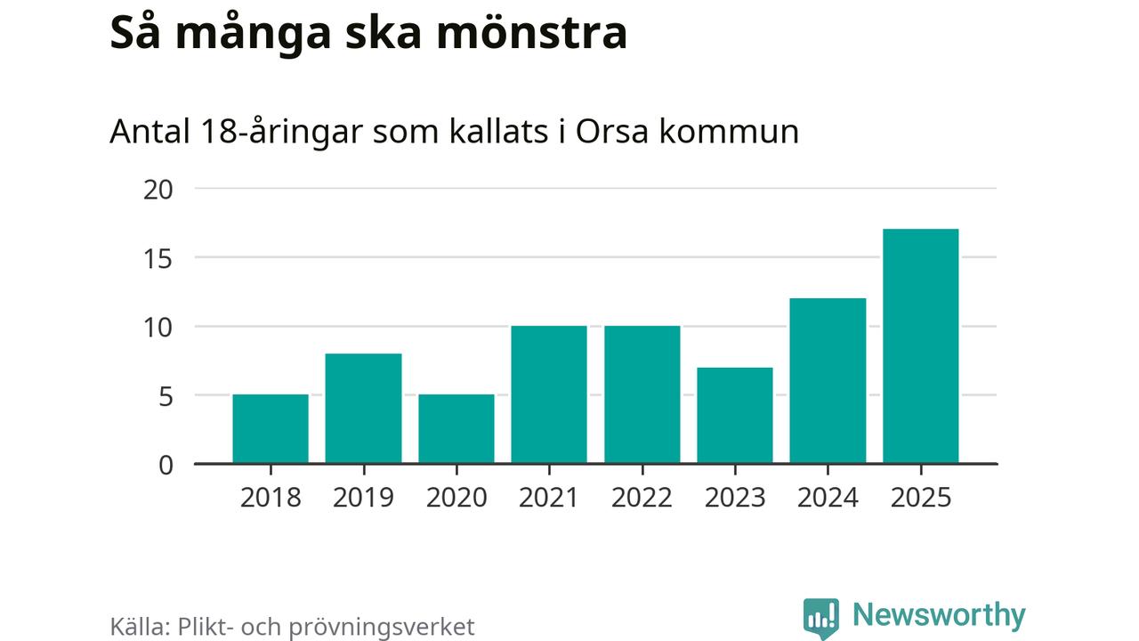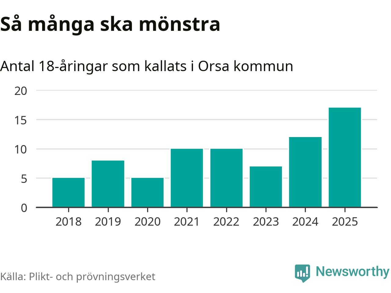 17 personer är det högsta antalet kallade i Orsa sedan 2018, som är första året med statistik på kommunnivå (värnplikten återinfördes 2017), och fem mönstrande fler än 2024. Totalt från Dalarnas län kallas 693 personer i år.