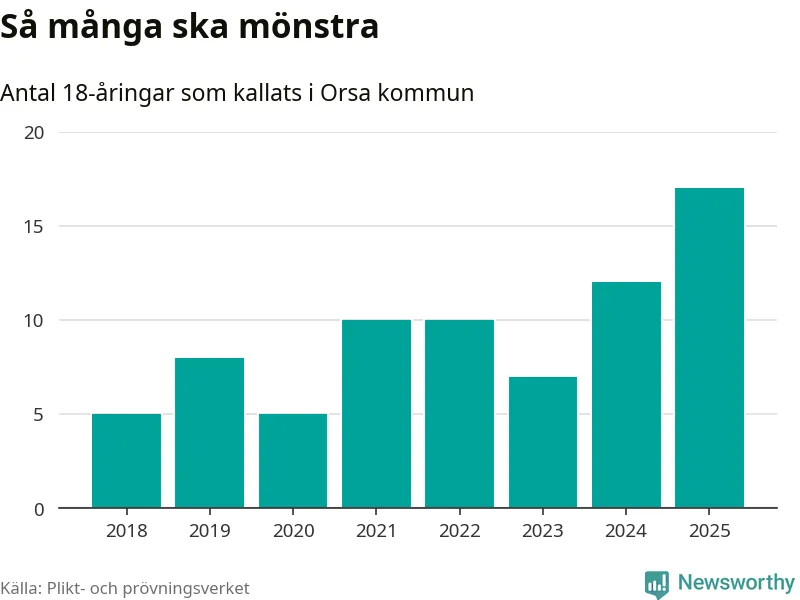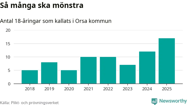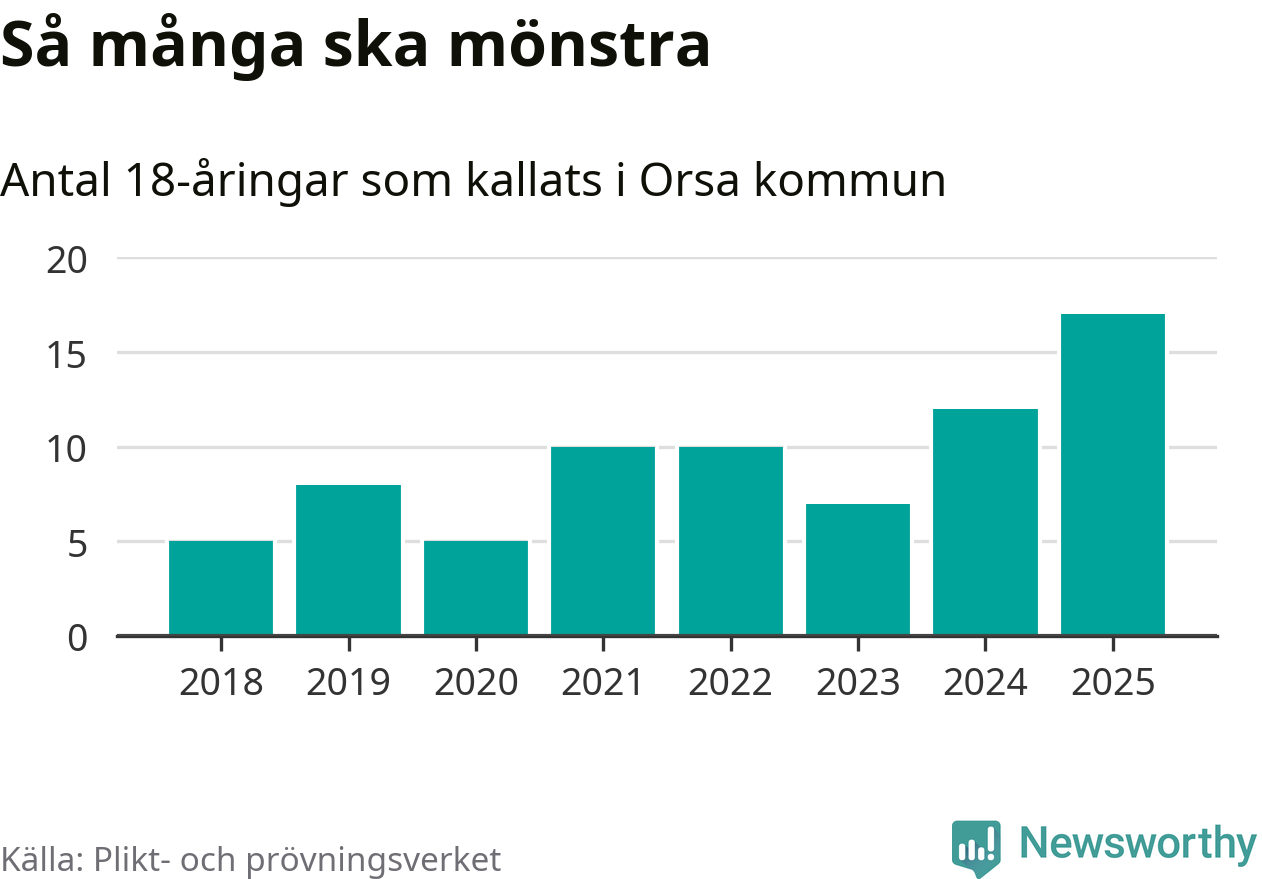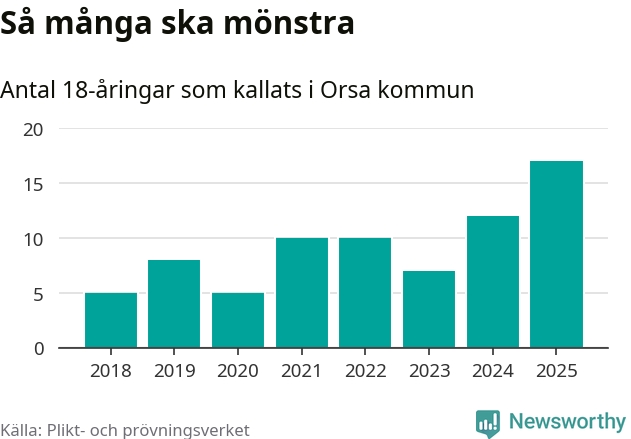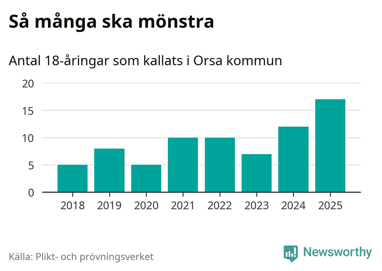 17 personer är det högsta antalet kallade i Orsa sedan 2018, som är första året med statistik på kommunnivå (värnplikten återinfördes 2017), och fem mönstrande fler än 2024. Totalt från Dalarnas län kallas 693 personer i år.