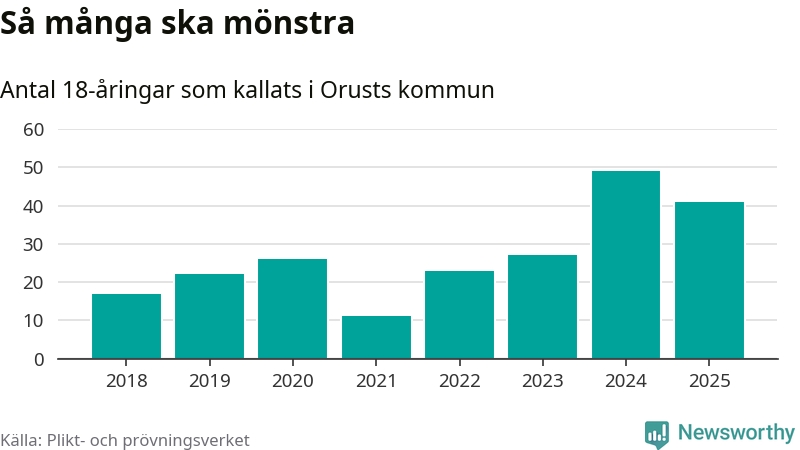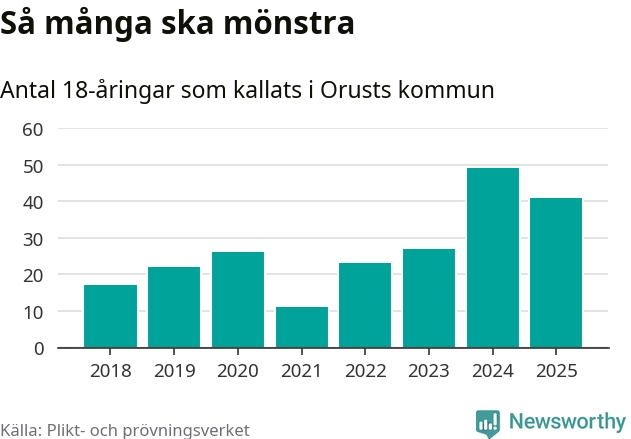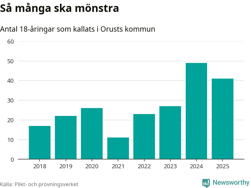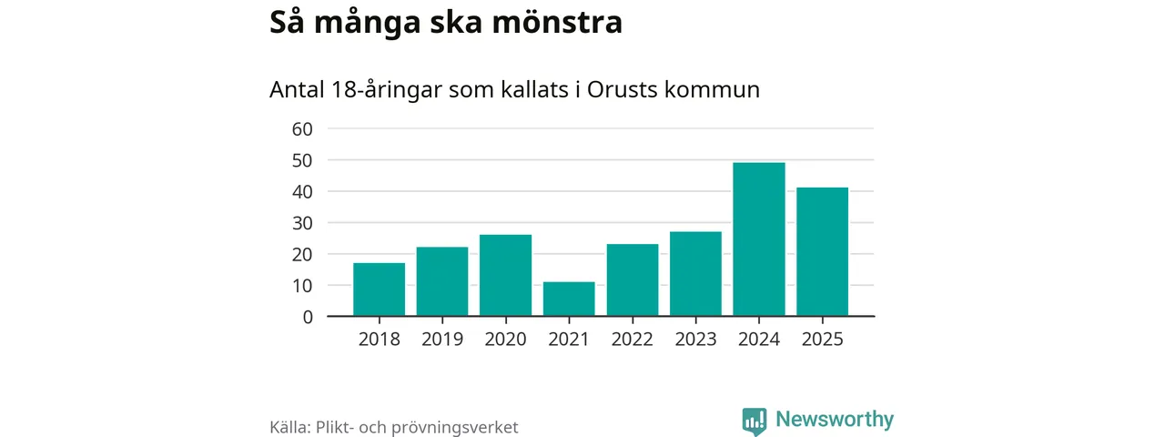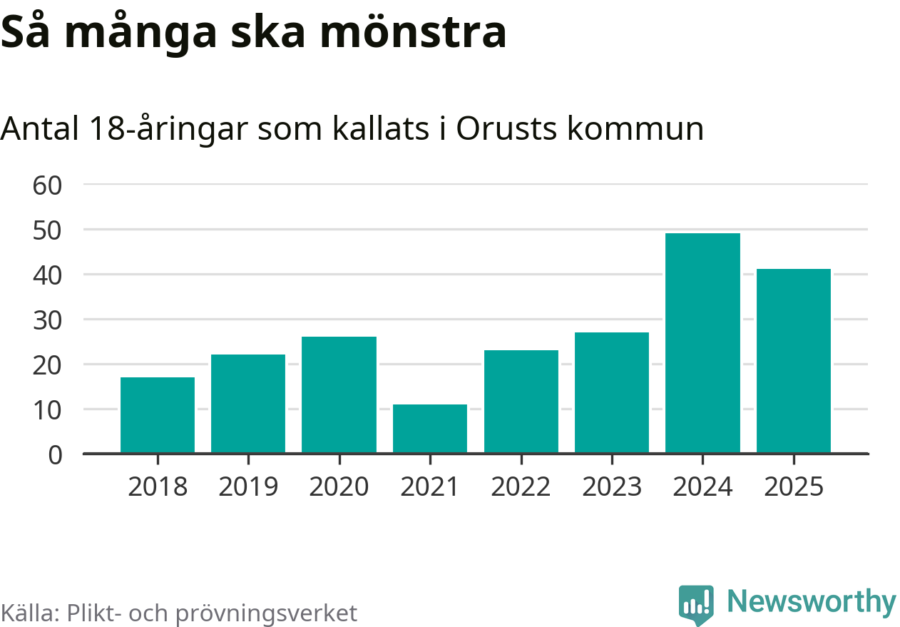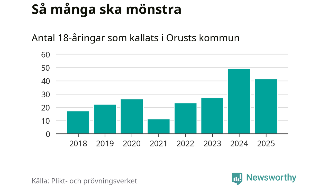 Nu kallas omkring 28 200 svenskar födda 2007 till mönstring. Och 41 av dem kommer från Orust, enligt ny statistik från Plikt- och prövningsverket. Det innebär att var fjärde invånare i åldersgruppen i kommunen kallas till mönstring. Det är en högre andel än i Västra Götaland totalt. I riket som helhet kallas nästan var fjärde person i årskullen.