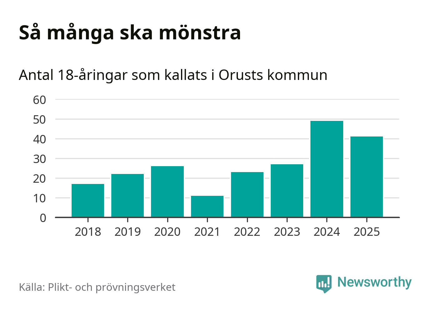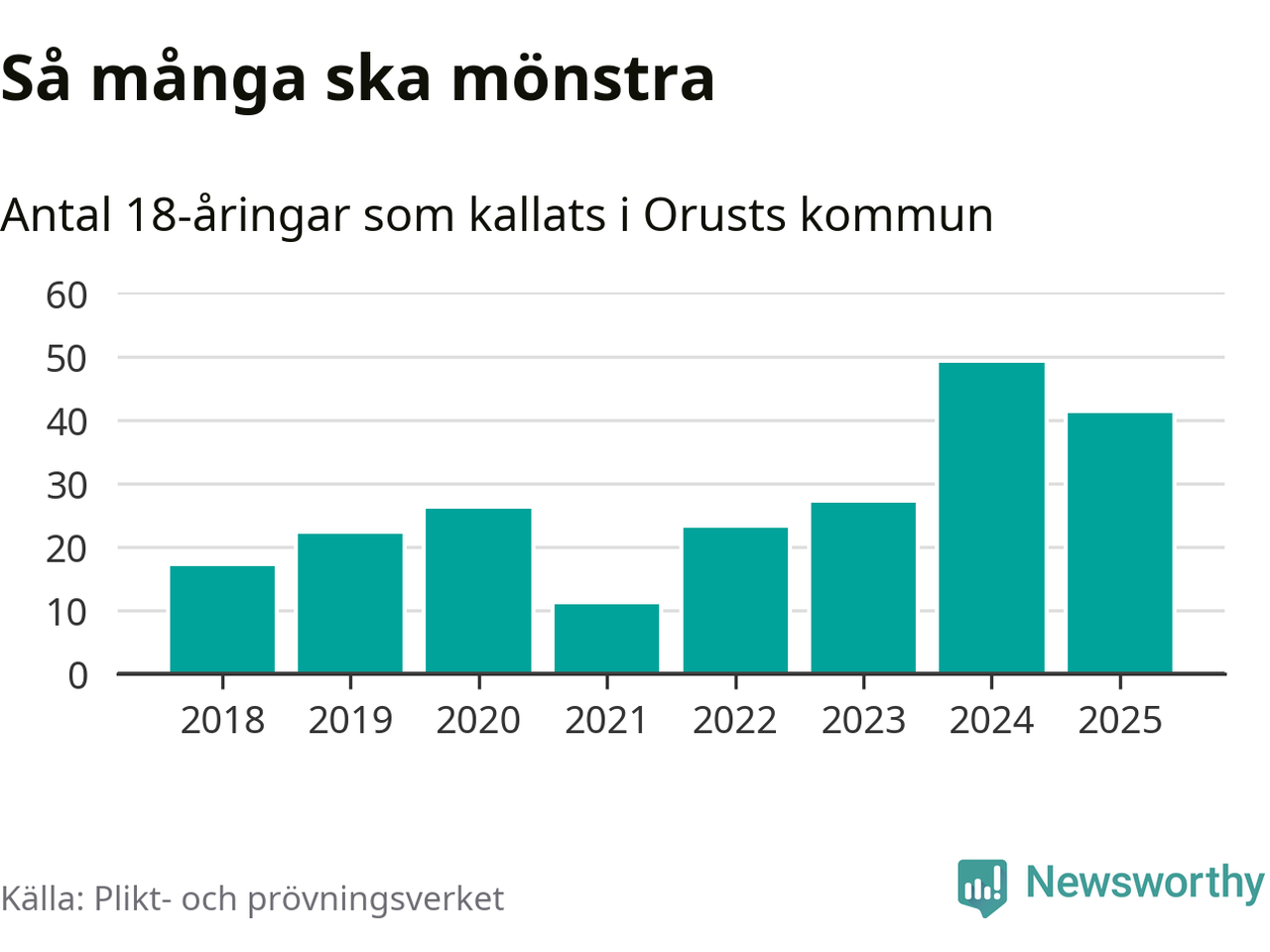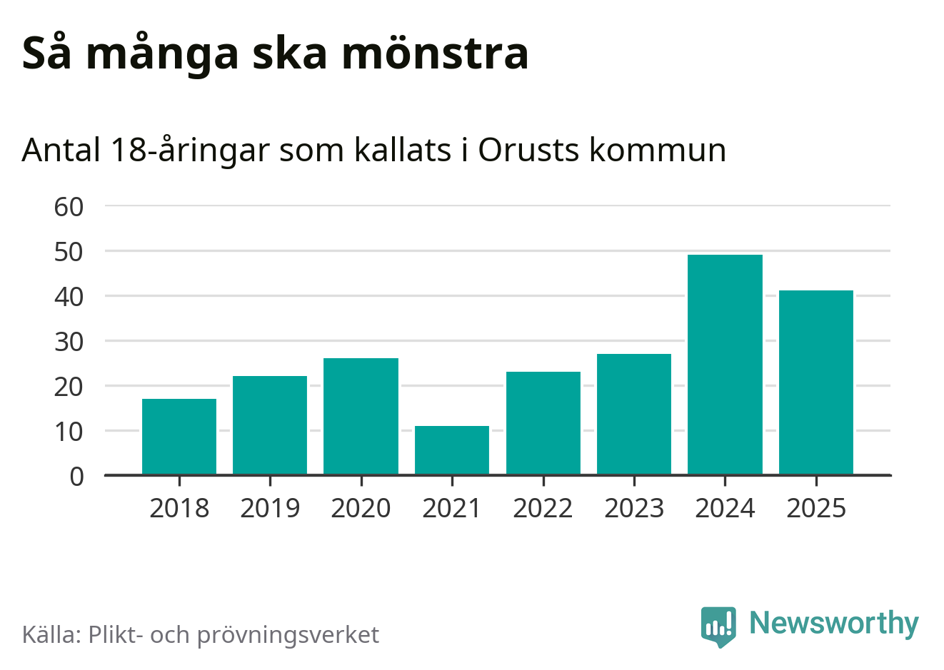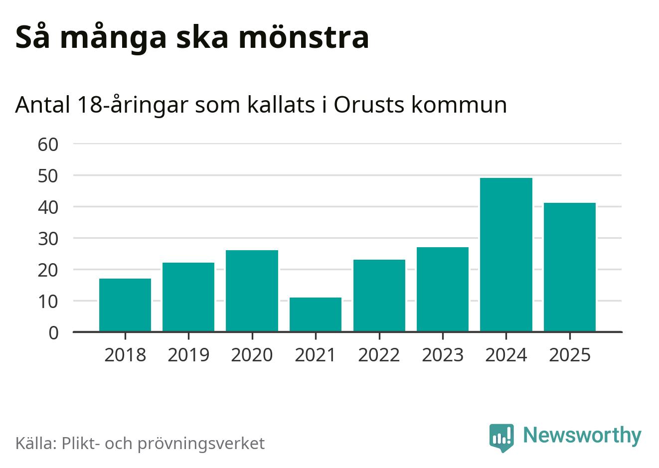 Nu kallas omkring 28 200 svenskar födda 2007 till mönstring. Och 41 av dem kommer från Orust, enligt ny statistik från Plikt- och prövningsverket. Det innebär att var fjärde invånare i åldersgruppen i kommunen kallas till mönstring. Det är en högre andel än i Västra Götaland totalt. I riket som helhet kallas nästan var fjärde person i årskullen.