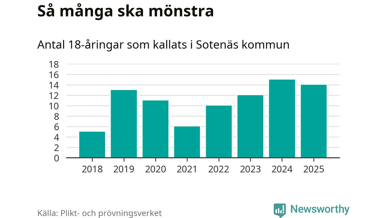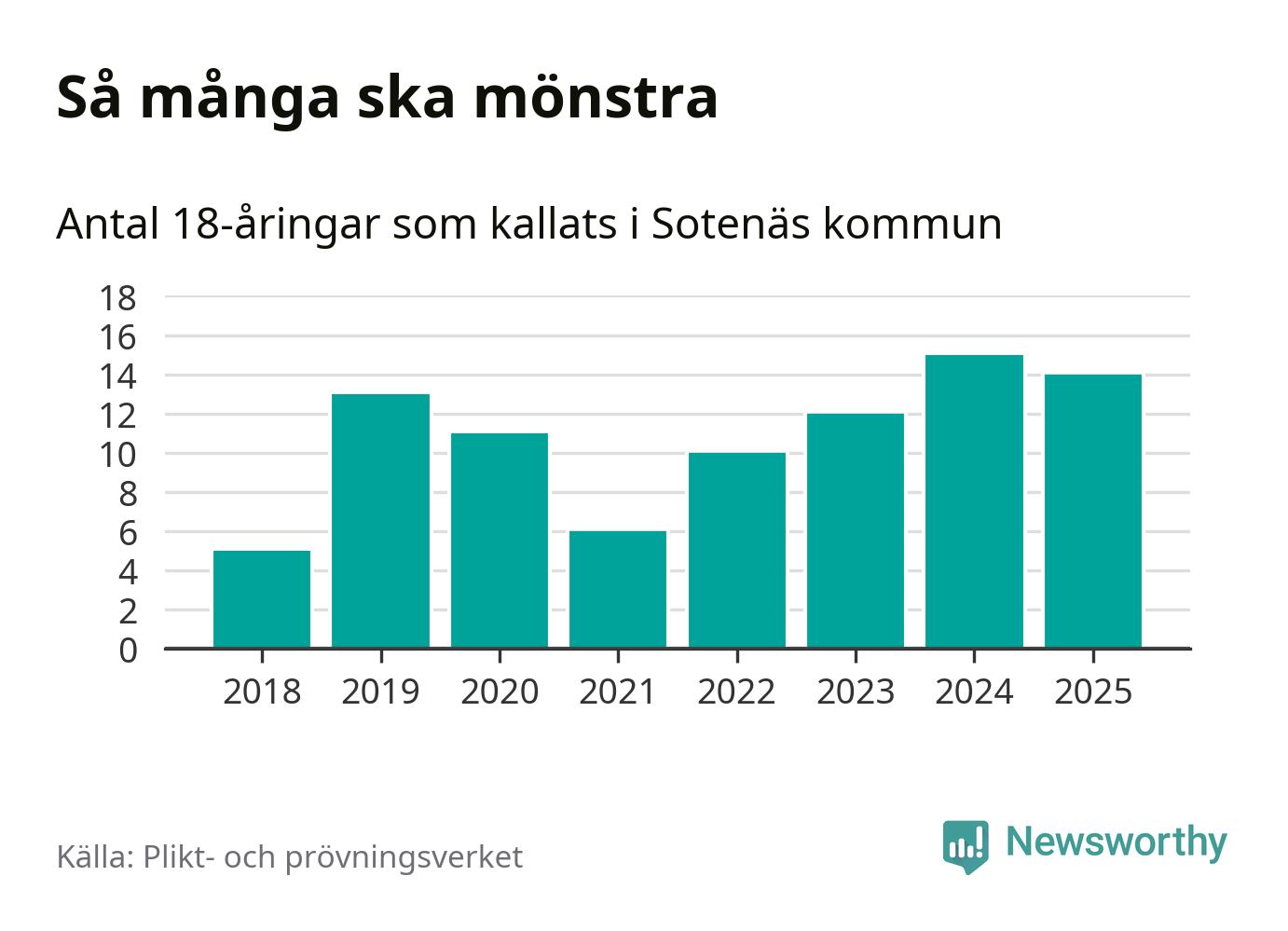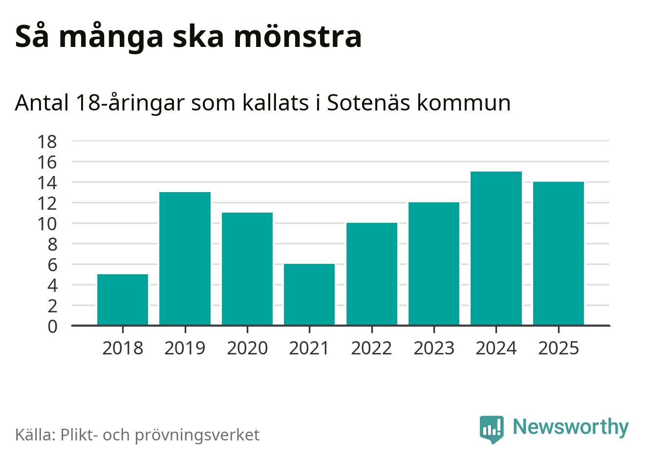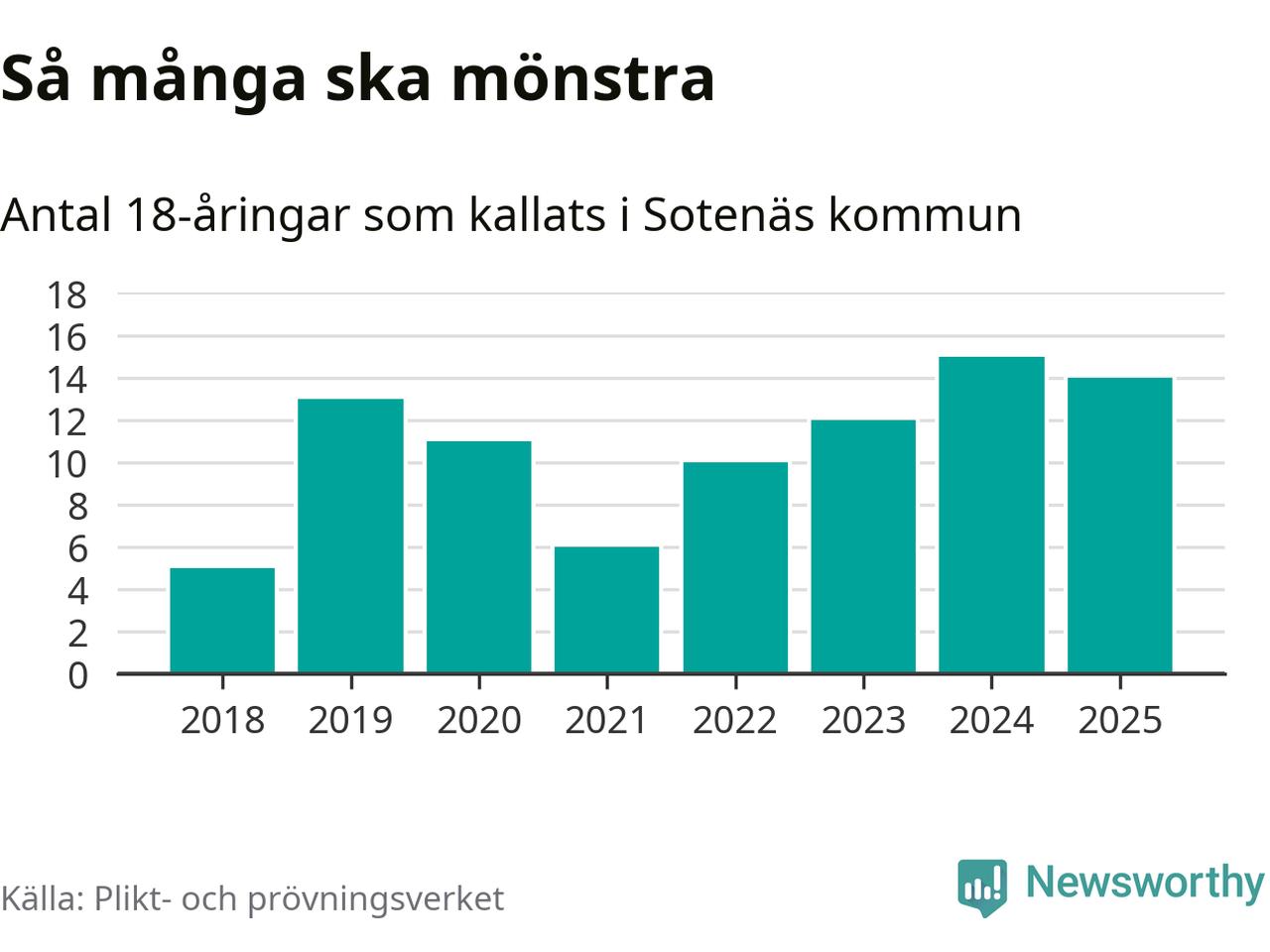 Nu kallas omkring 28 200 svenskar födda 2007 till mönstring. Och 14 av dem kommer från Sotenäs, enligt ny statistik från Plikt- och prövningsverket. Det innebär att var sjätte invånare i åldersgruppen i kommunen kallas till mönstring. Det är en lägre andel än i Västra Götaland totalt. I riket som helhet kallas nästan var fjärde person i årskullen.