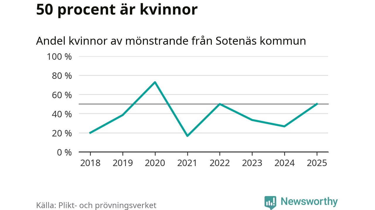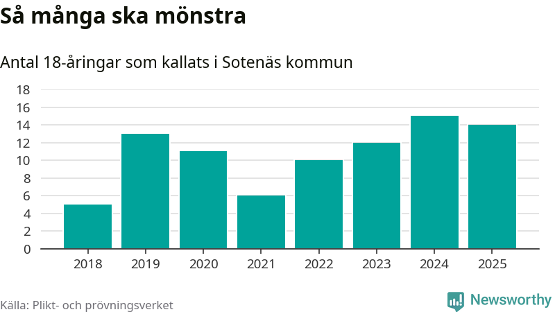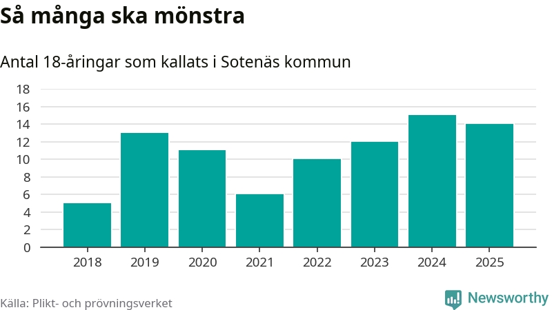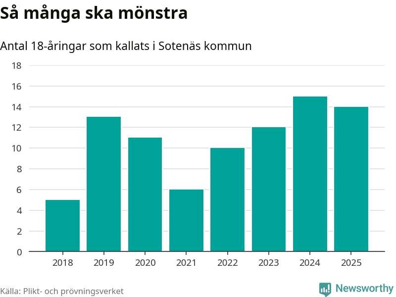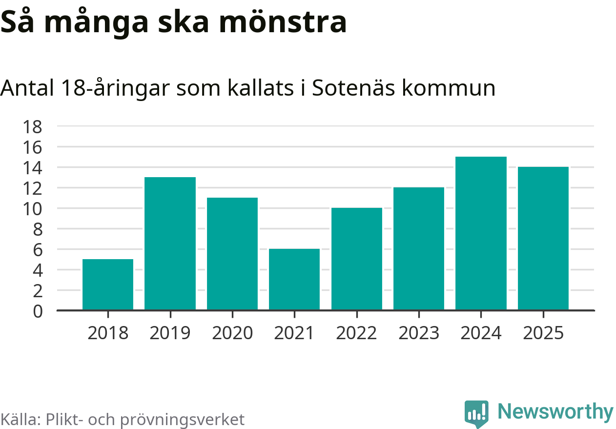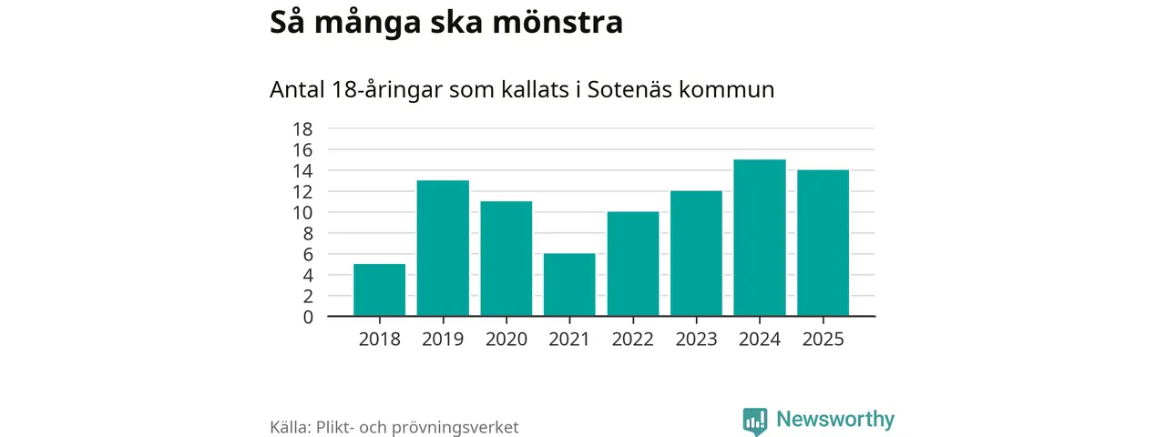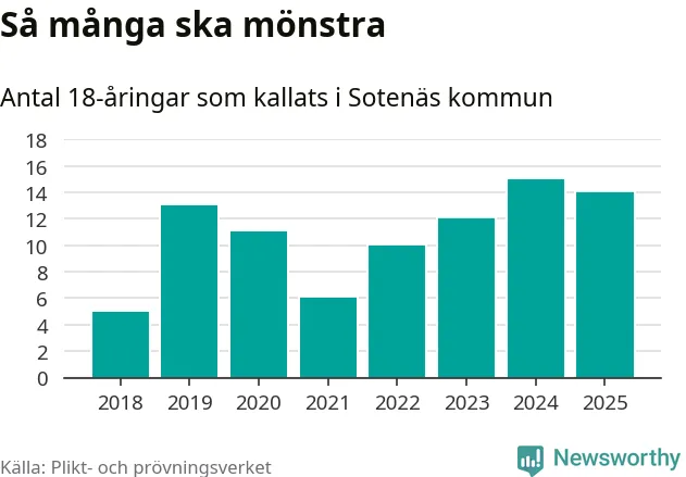 Nu kallas omkring 28 200 svenskar födda 2007 till mönstring. Och 14 av dem kommer från Sotenäs, enligt ny statistik från Plikt- och prövningsverket. Det innebär att var sjätte invånare i åldersgruppen i kommunen kallas till mönstring. Det är en lägre andel än i Västra Götaland totalt. I riket som helhet kallas nästan var fjärde person i årskullen.