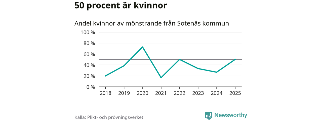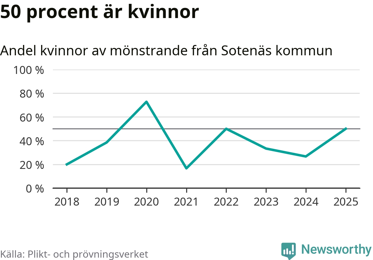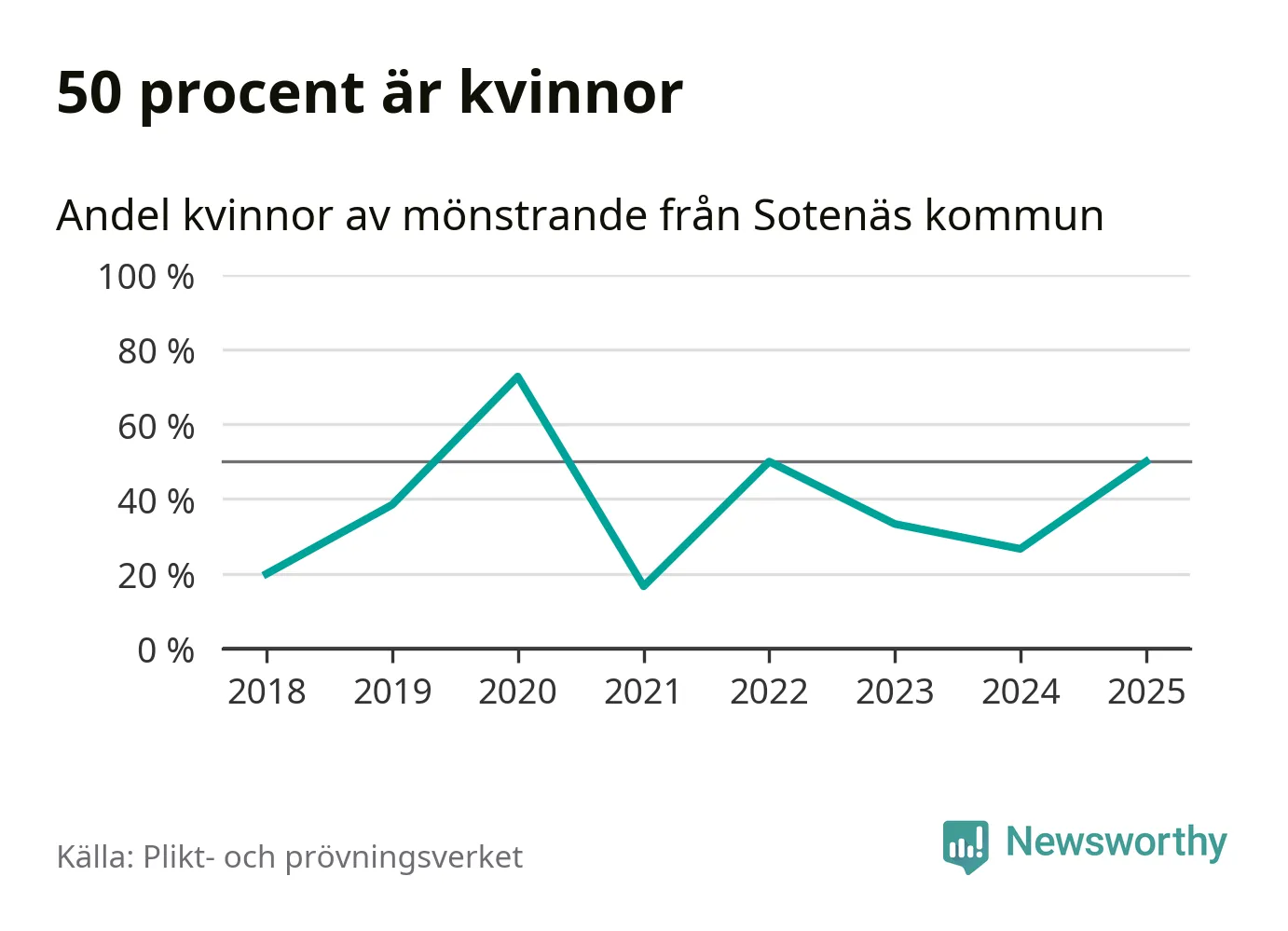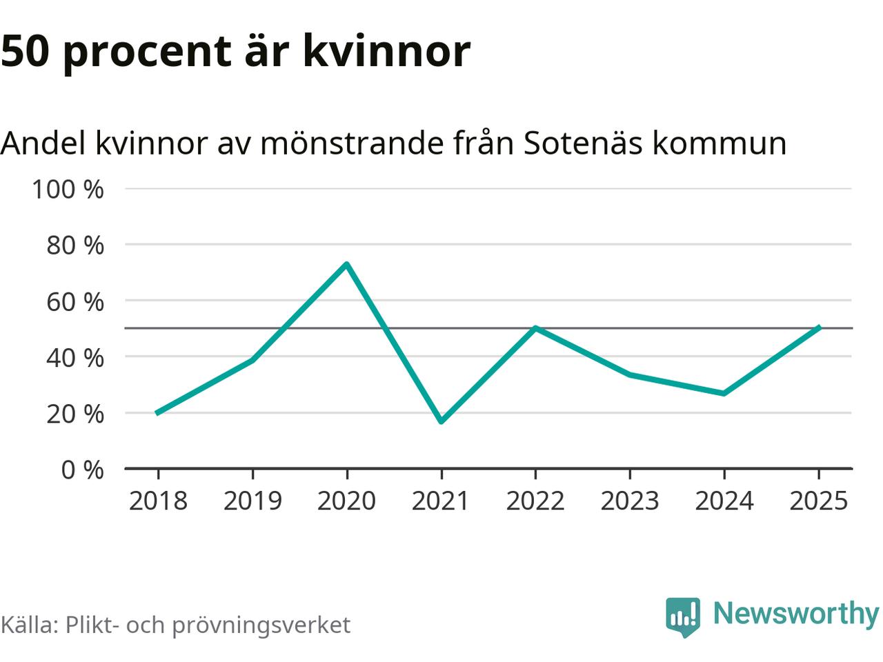 Sju av de som kallats till mönstring från Sotenäs är kvinnor, vilket motsvarar 50 procent av de mönstrande. Som mest har åtta kvinnor kallats från kommunen (2020). I riket som helhet är 28 procent av de mönstrande tjejer.