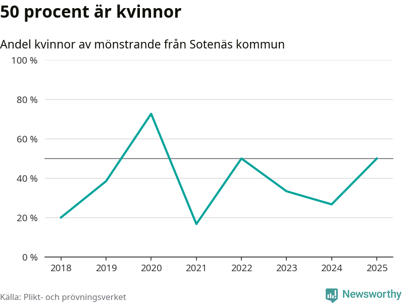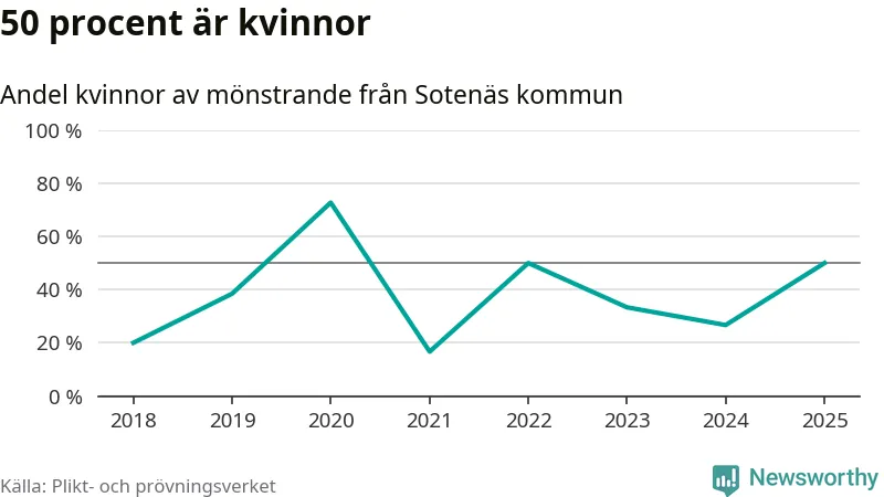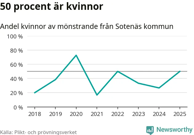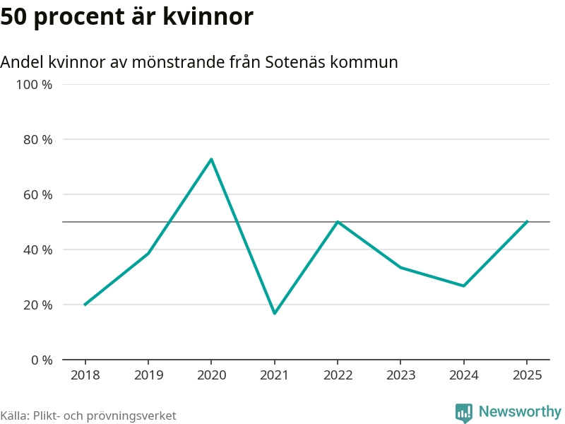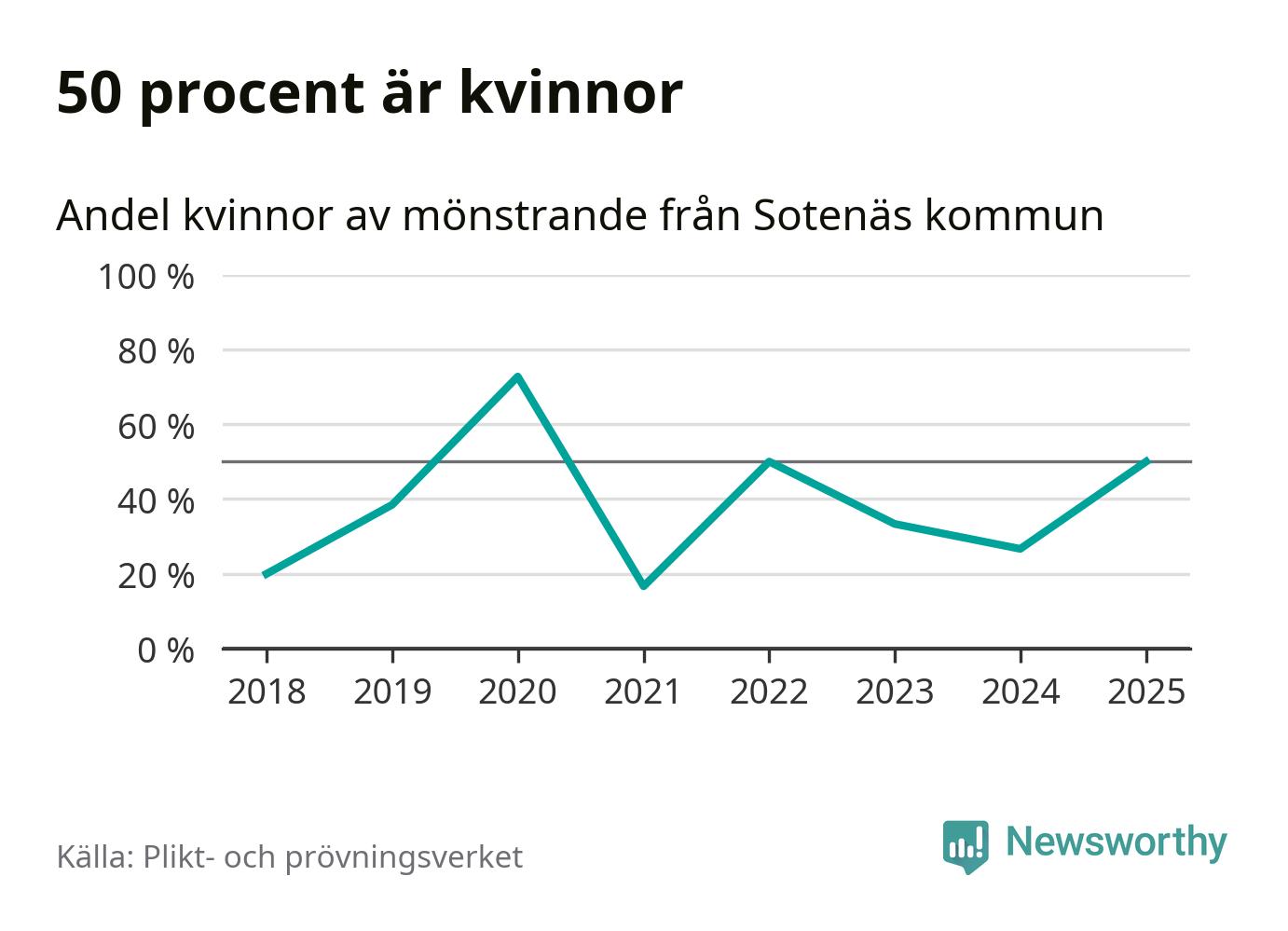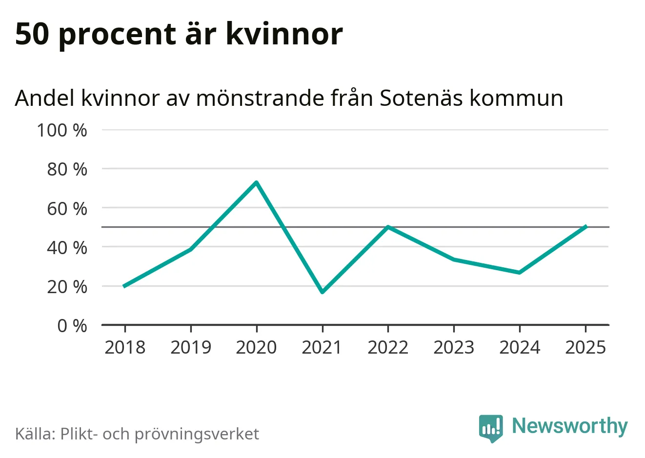 Sju av de som kallats till mönstring från Sotenäs är kvinnor, vilket motsvarar 50 procent av de mönstrande. Som mest har åtta kvinnor kallats från kommunen (2020). I riket som helhet är 28 procent av de mönstrande tjejer.