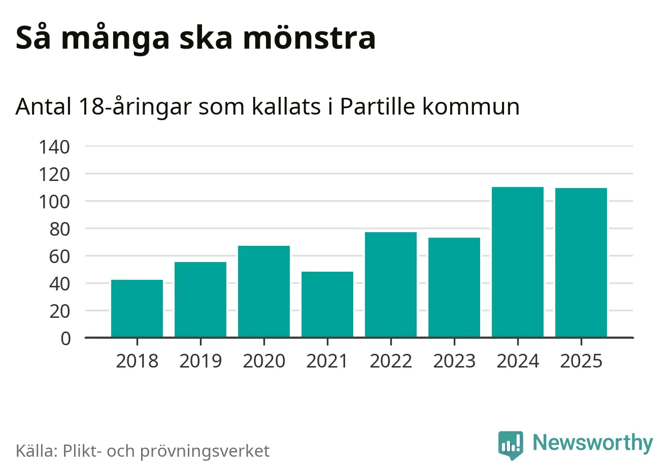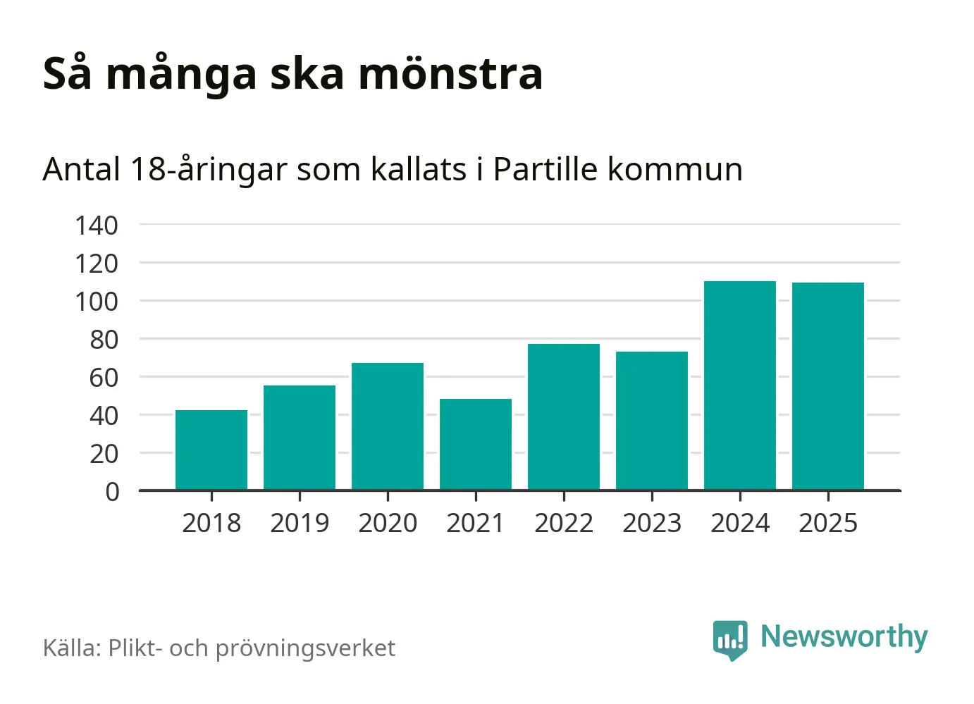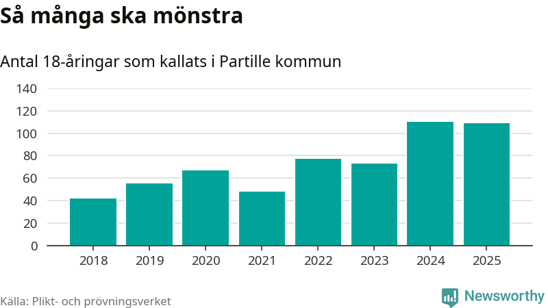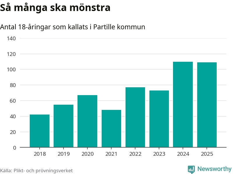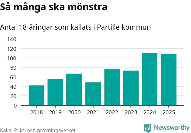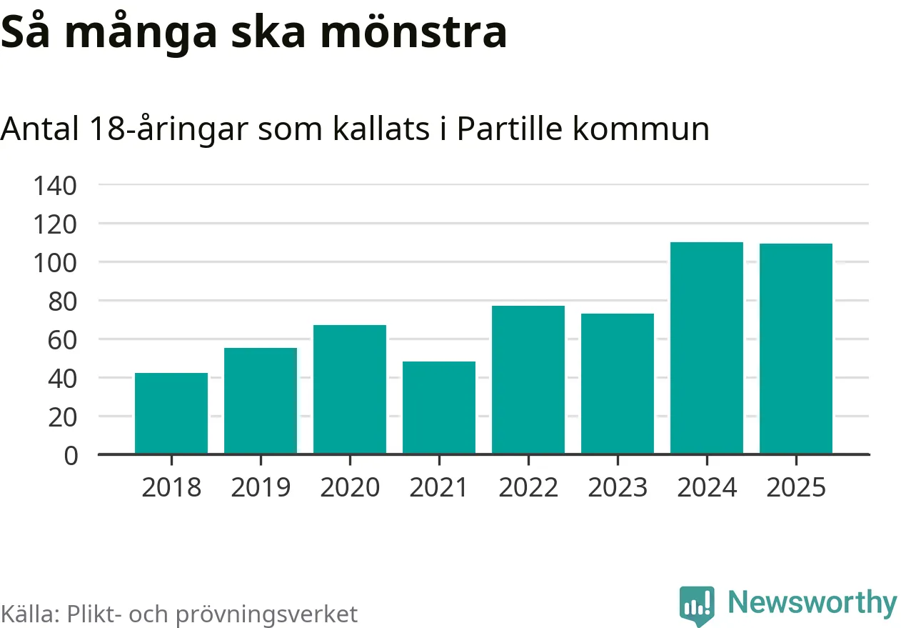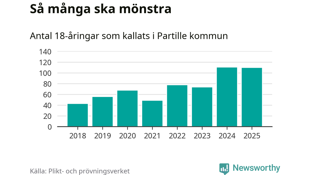 Nu kallas omkring 28 200 svenskar födda 2007 till mönstring. Och 109 av dem kommer från Partille, enligt ny statistik från Plikt- och prövningsverket. Det innebär att var femte invånare i åldersgruppen i kommunen kallas till mönstring. Det är ungefär lika stor andel som i Västra Götaland totalt. I riket som helhet kallas nästan var fjärde person i årskullen.