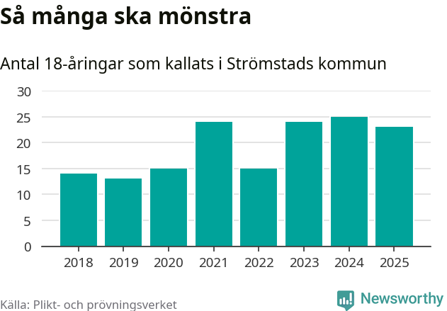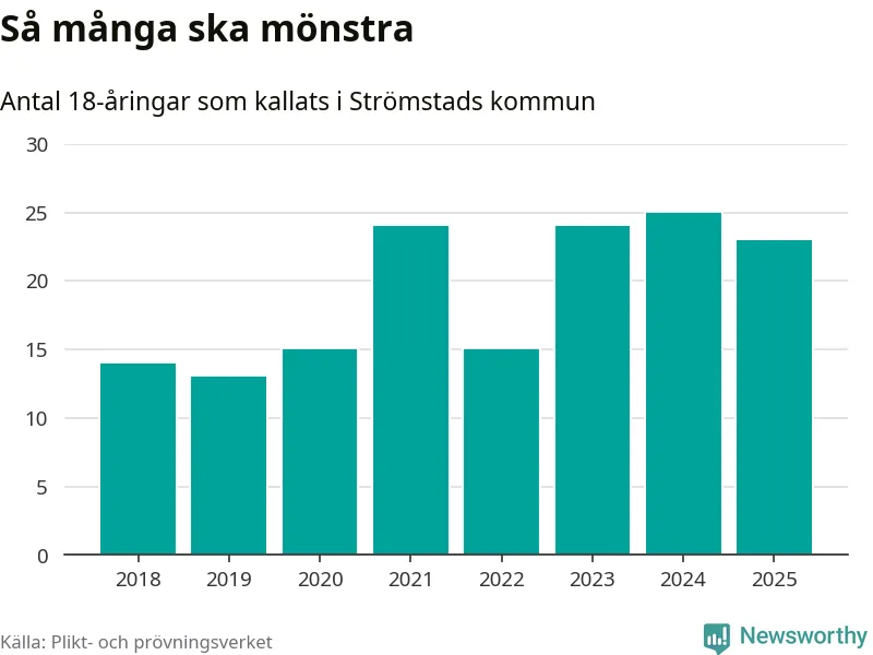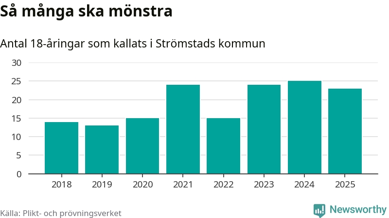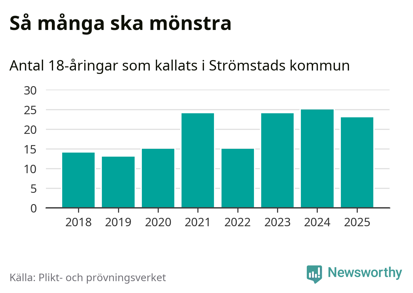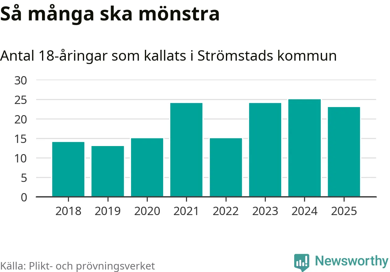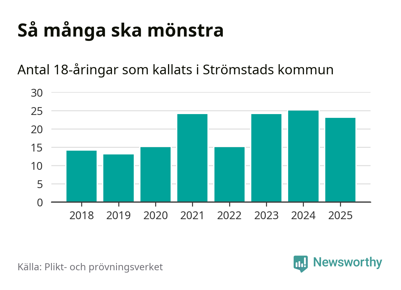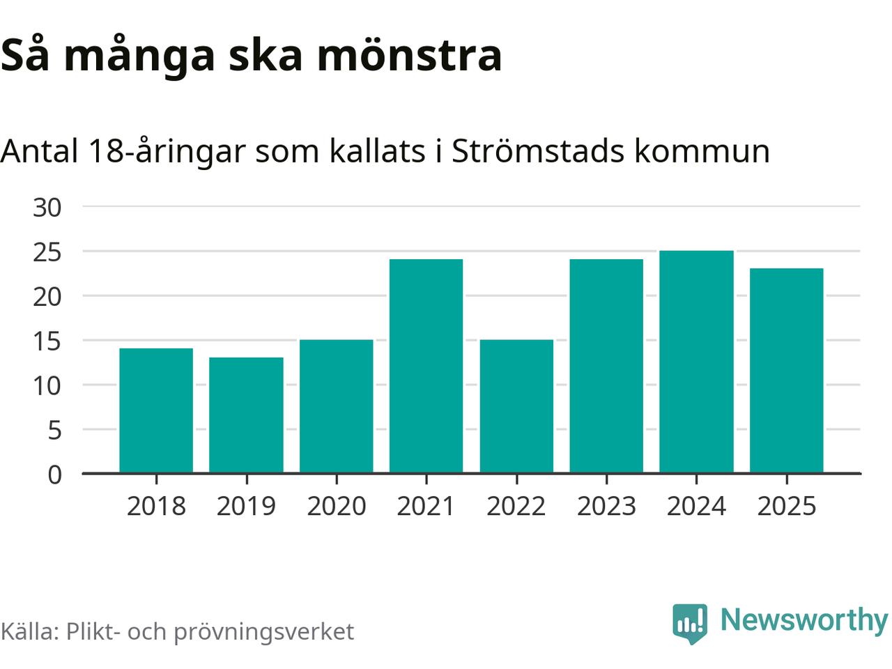Nu kallas omkring 28 200 svenskar födda 2007 till mönstring. Och 23 av dem kommer från Strömstad, enligt ny statistik från Plikt- och prövningsverket. Det innebär att var femte invånare i åldersgruppen i kommunen kallas till mönstring. Det är en lägre andel än i Västra Götaland totalt. I riket som helhet kallas nästan var fjärde person i årskullen.