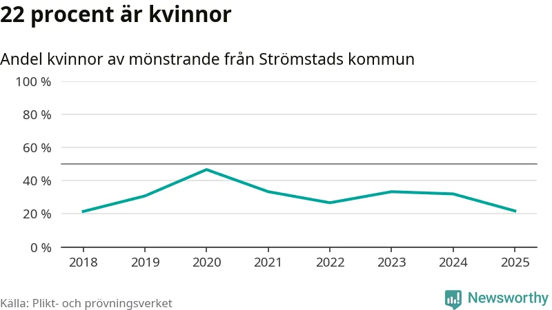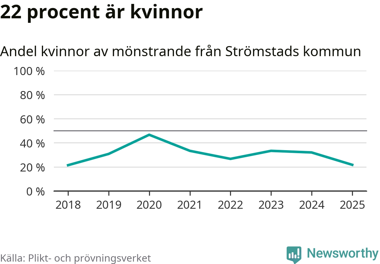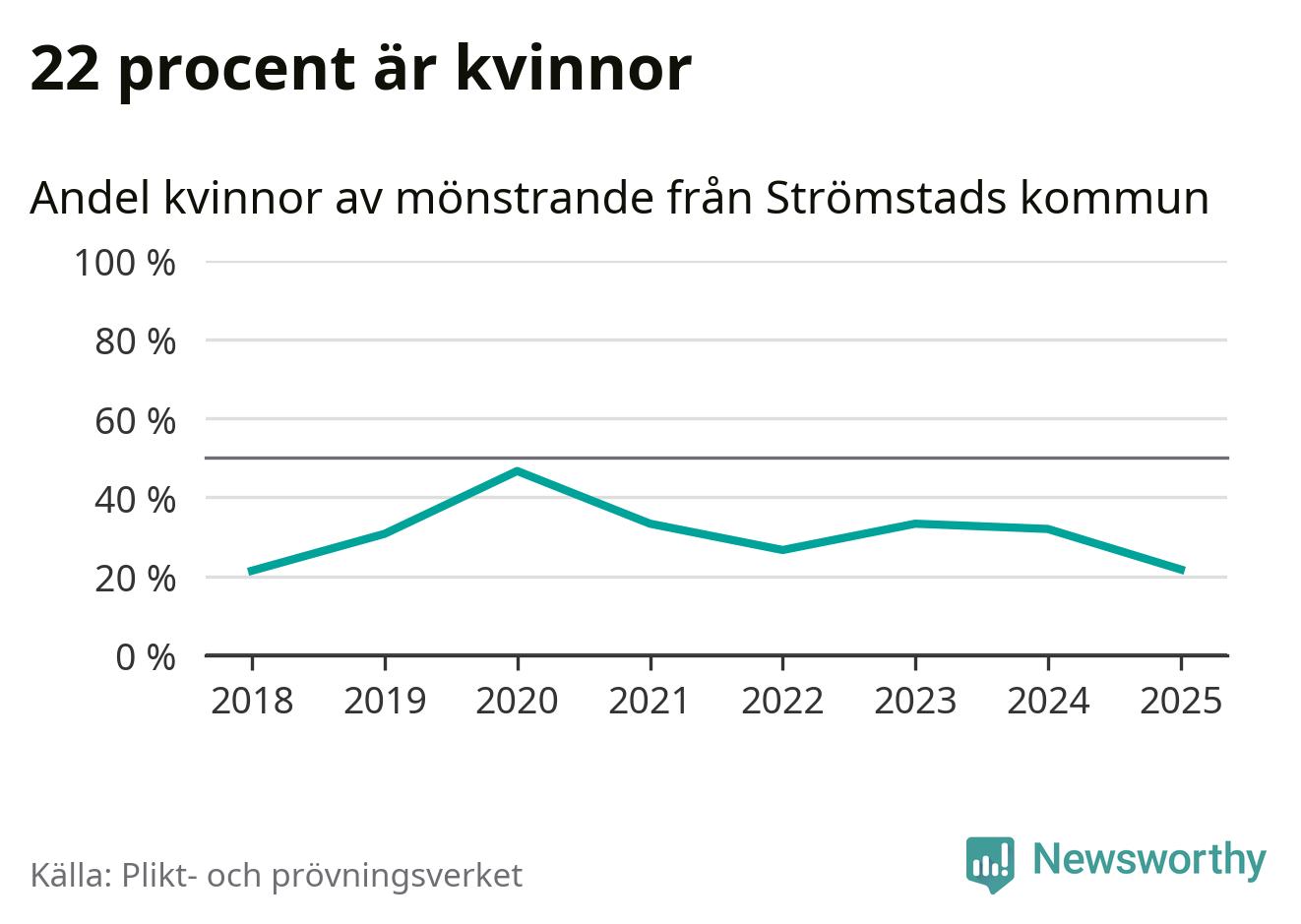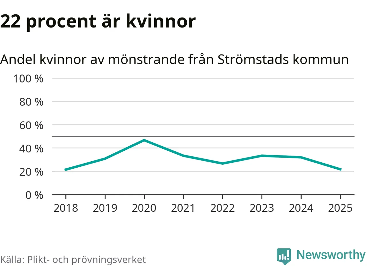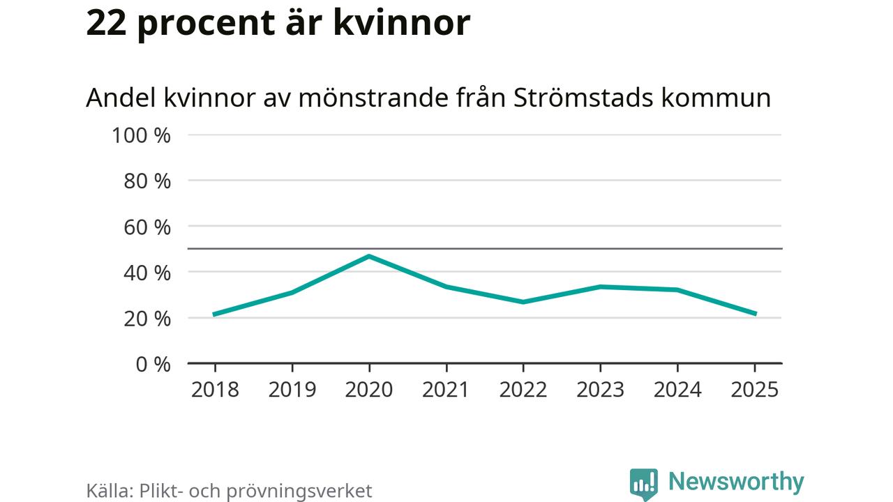 Fem av de som kallats till mönstring från Strömstad är kvinnor, vilket motsvarar 22 procent av de mönstrande. Som mest har åtta kvinnor kallats från kommunen (2024, 2023 och 2021). I riket som helhet är 28 procent av de mönstrande tjejer.