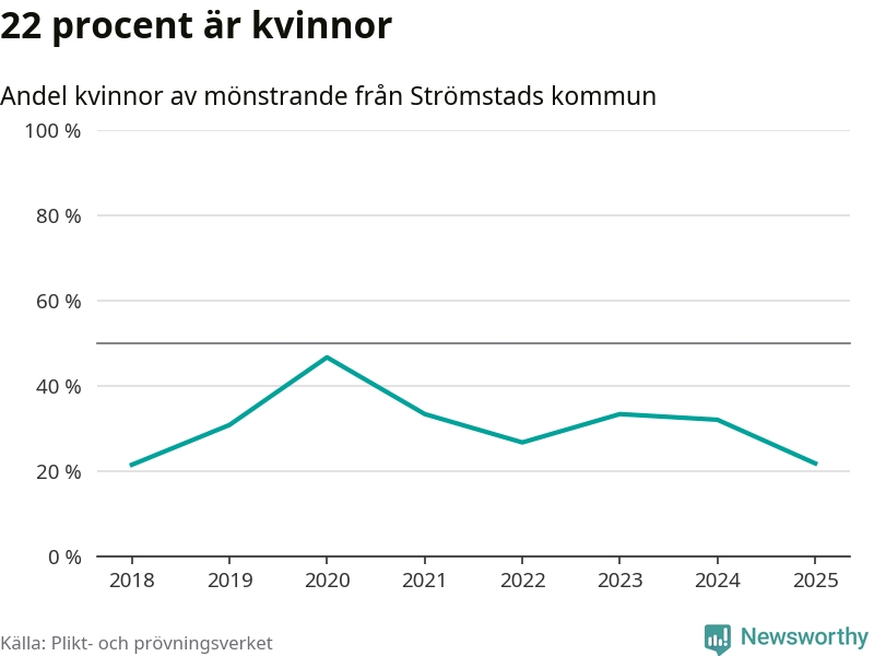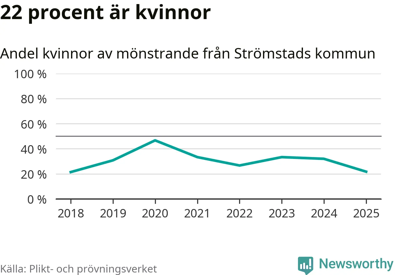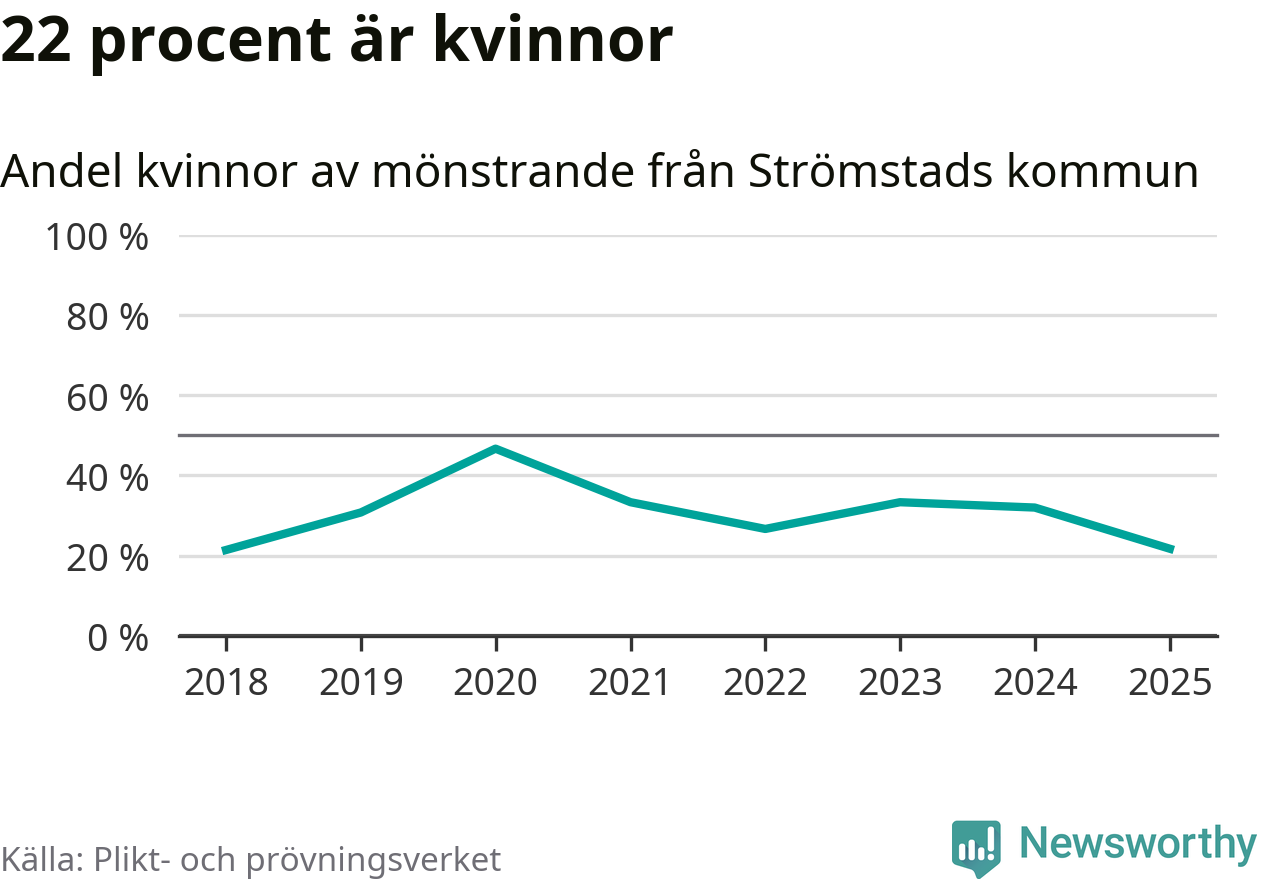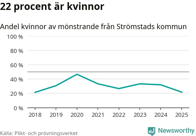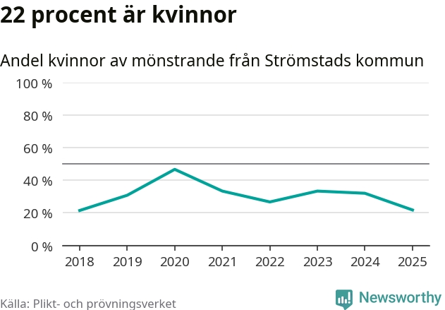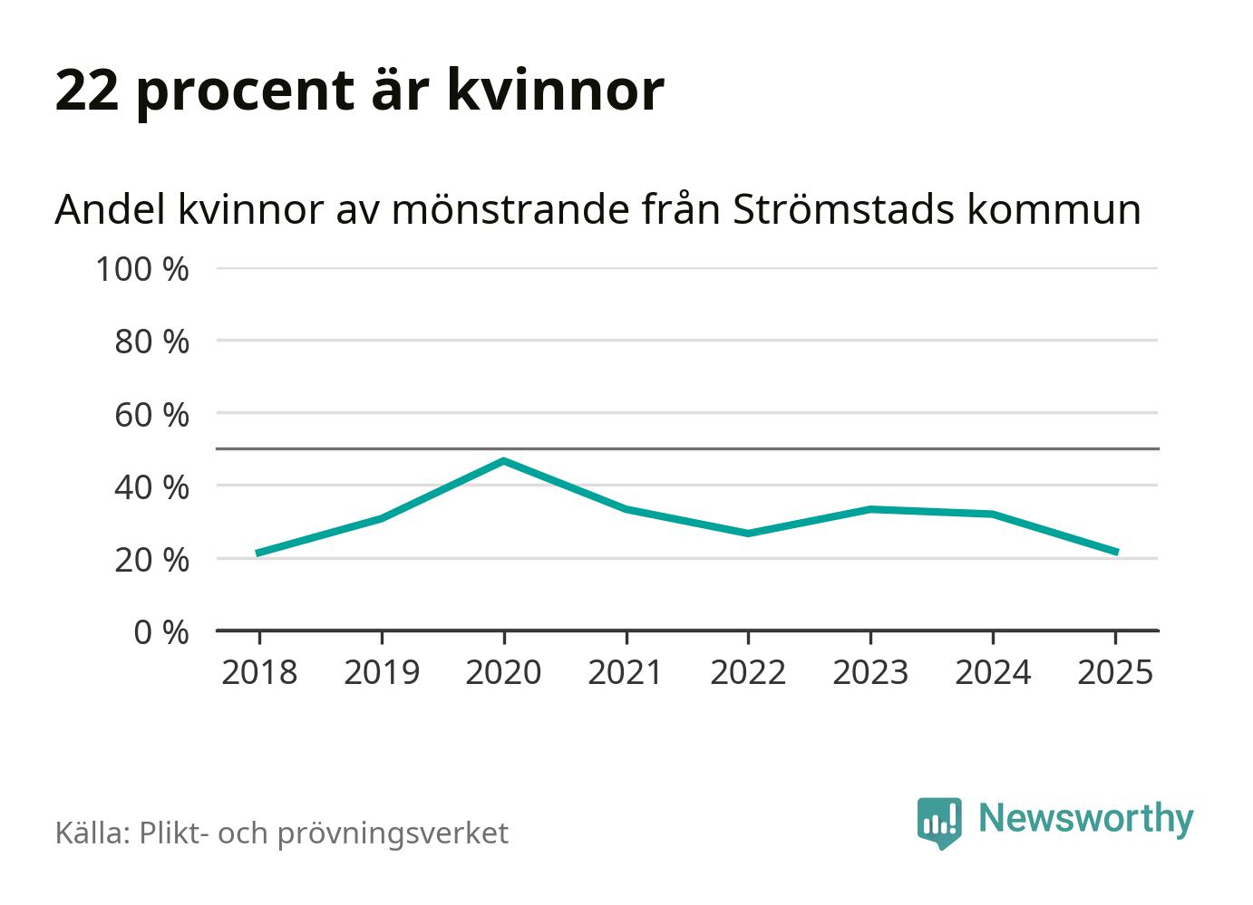Fem av de som kallats till mönstring från Strömstad är kvinnor, vilket motsvarar 22 procent av de mönstrande. Som mest har åtta kvinnor kallats från kommunen (2024, 2023 och 2021). I riket som helhet är 28 procent av de mönstrande tjejer.