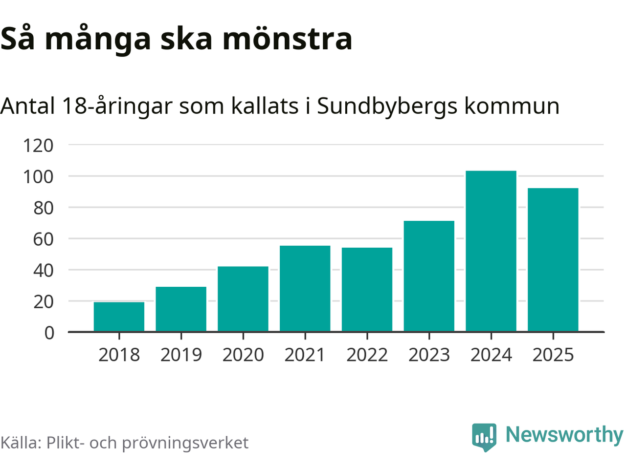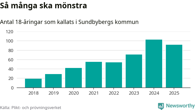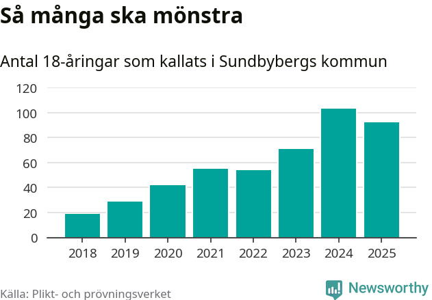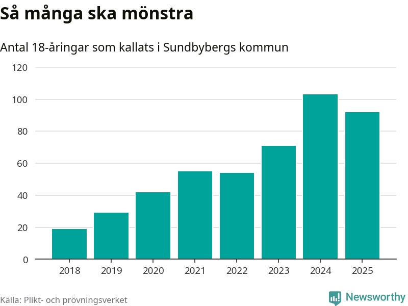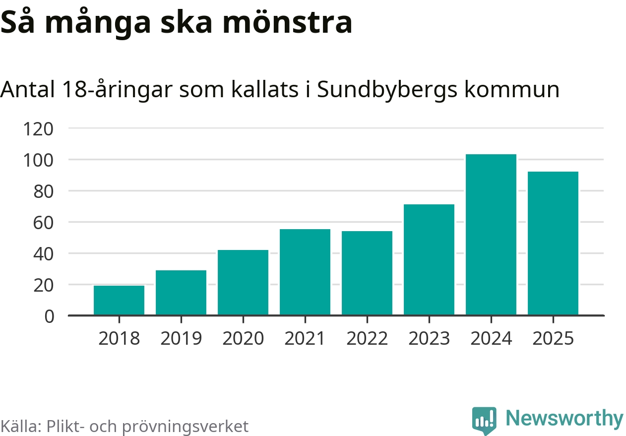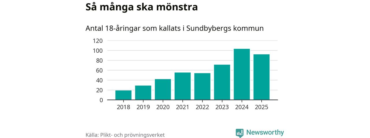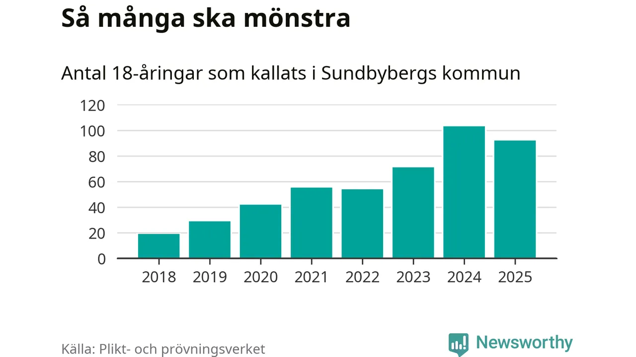 Nu kallas omkring 28 200 svenskar födda 2007 till mönstring. Och 92 av dem kommer från Sundbyberg, enligt ny statistik från Plikt- och prövningsverket. Det innebär att var femte invånare i åldersgruppen i kommunen kallas till mönstring. Det är en lägre andel än i Stockholms län totalt. I riket som helhet kallas nästan var fjärde person i årskullen.