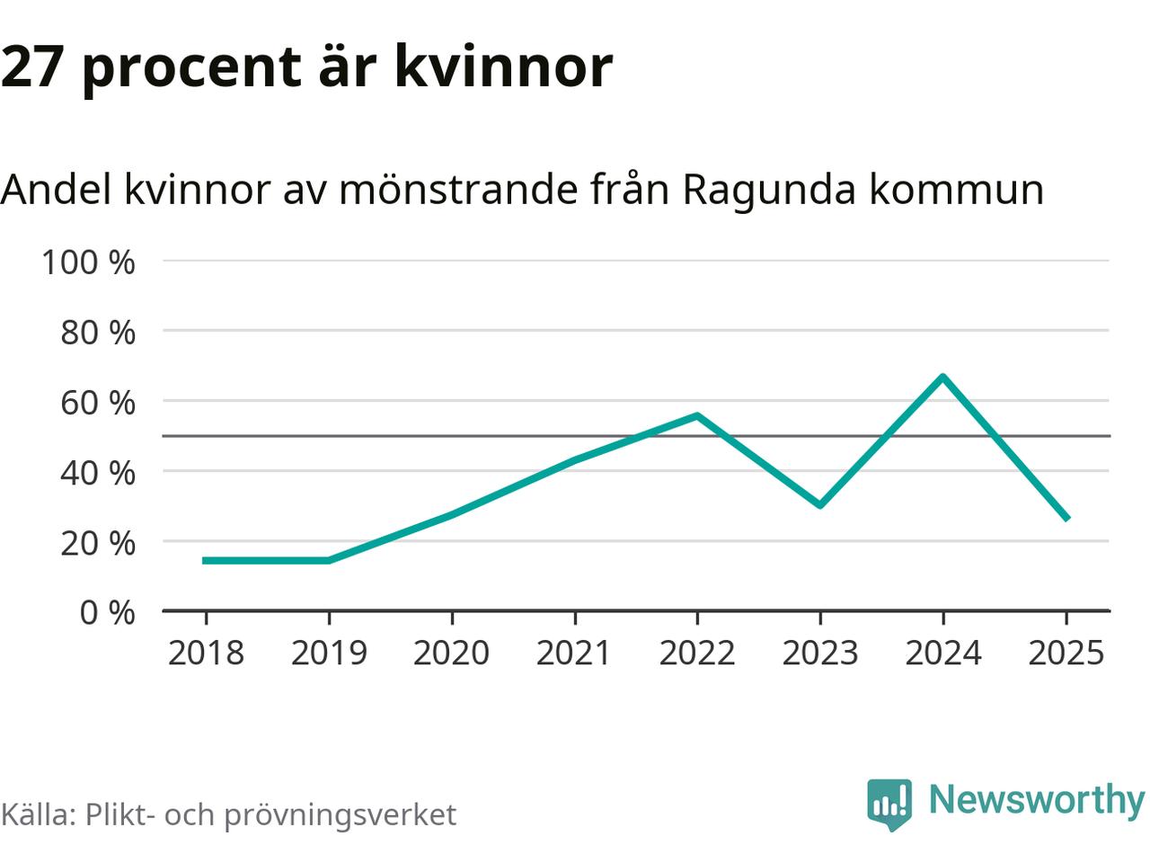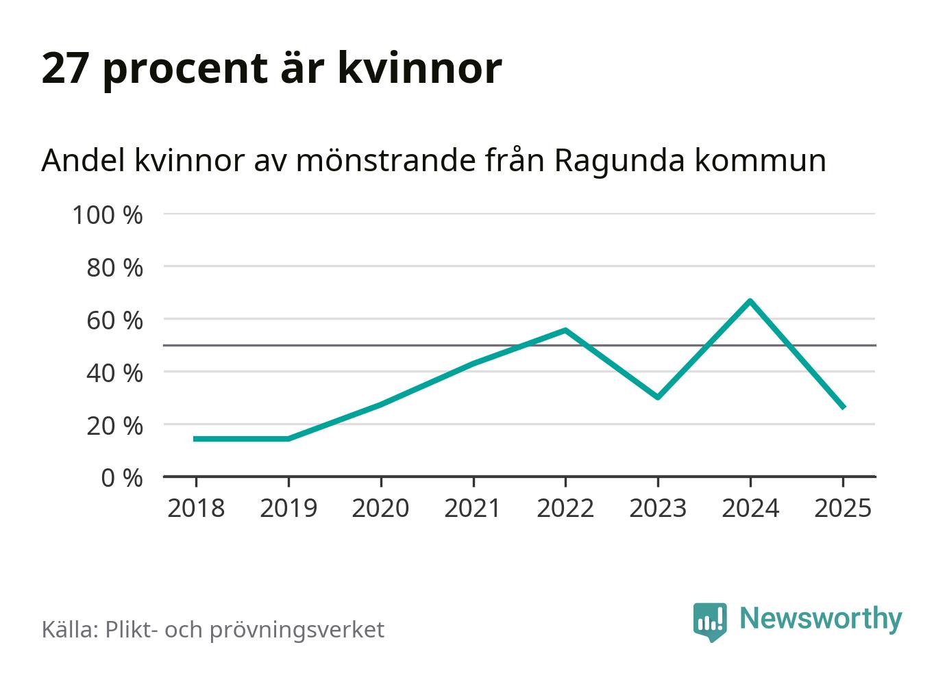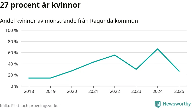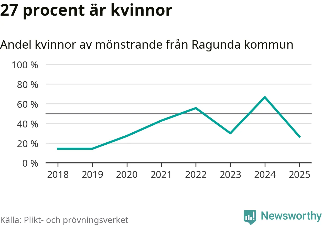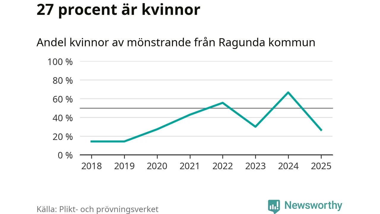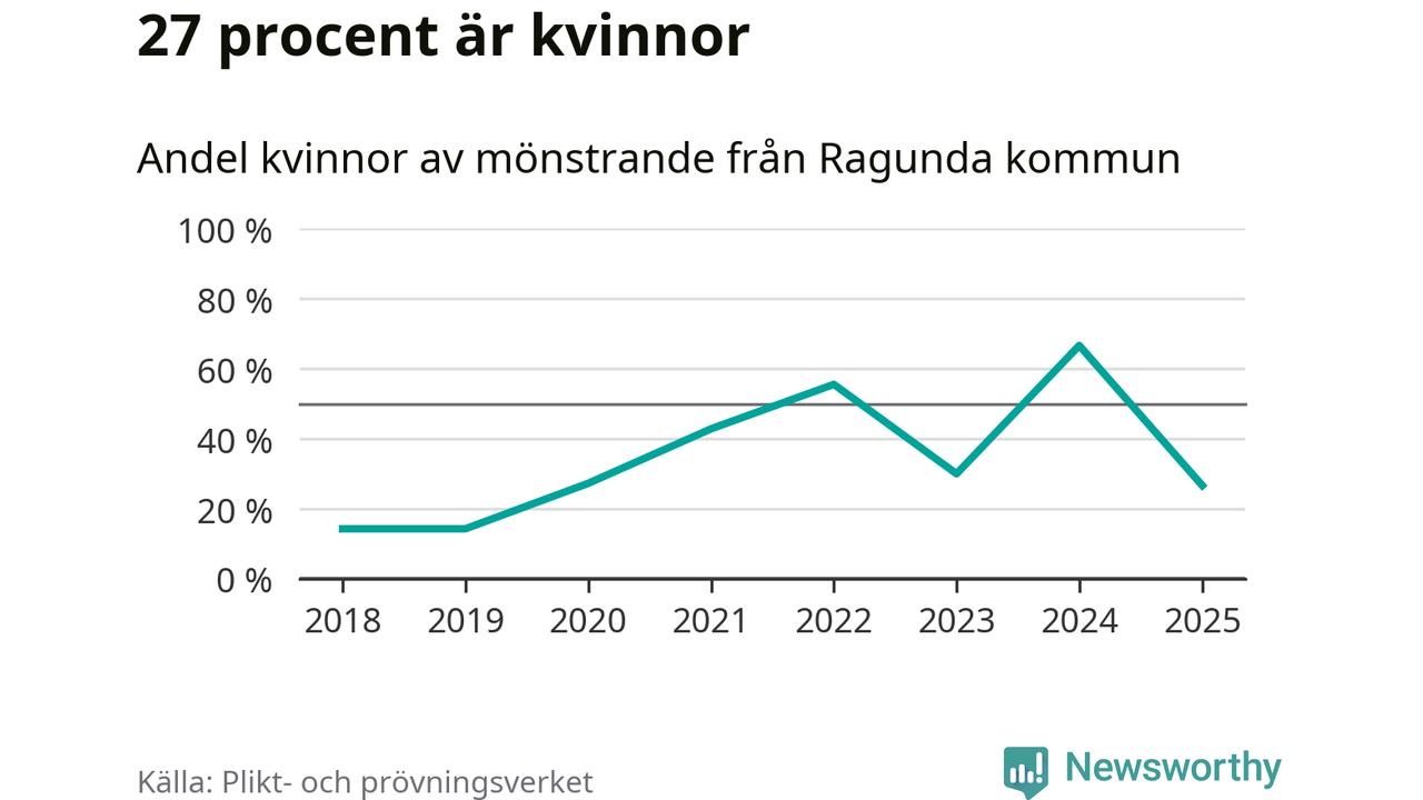 Nu kallas omkring 28 200 svenskar födda 2007 till mönstring. Och 15 av dem kommer från Ragunda, enligt ny statistik från Plikt- och prövningsverket. Det innebär att var fjärde invånare i åldersgruppen i kommunen kallas till mönstring. Det är ungefär lika stor andel som i Jämtland totalt. I riket som helhet kallas nästan var fjärde person i årskullen.