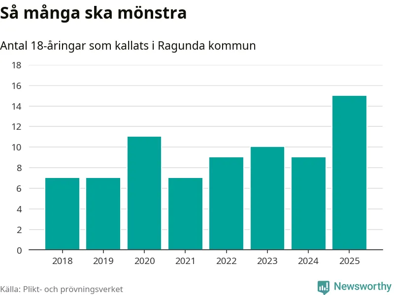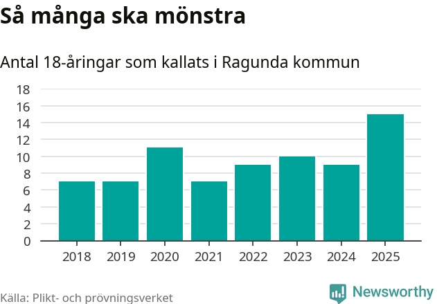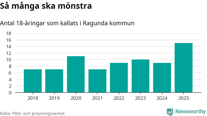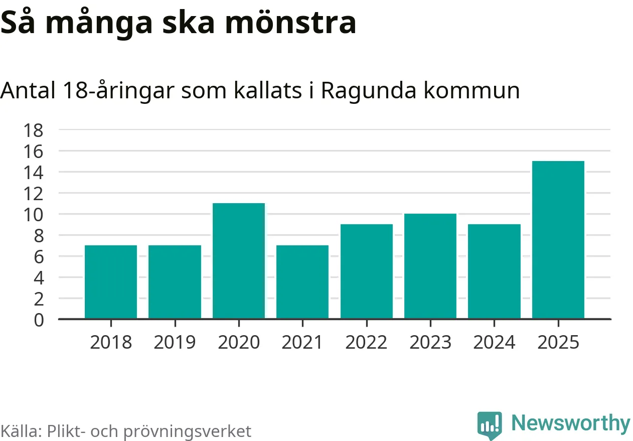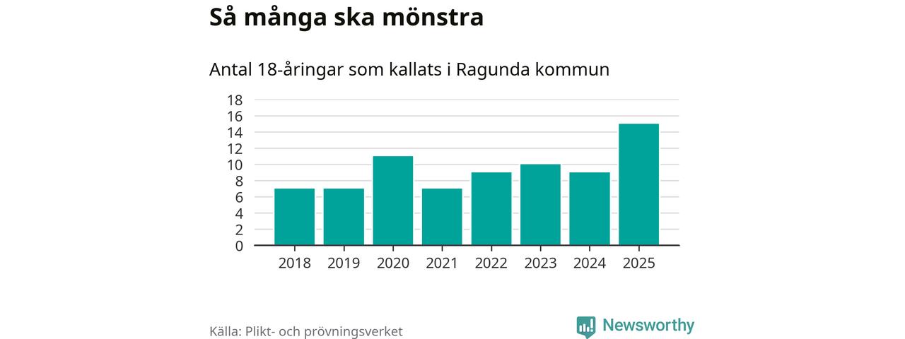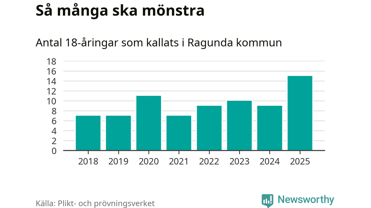 15 personer är det högsta antalet kallade i Ragunda sedan 2018, som är första året med statistik på kommunnivå (värnplikten återinfördes 2017), och sex mönstrande fler än 2024. Totalt från Jämtlands län kallas 422 personer i år.