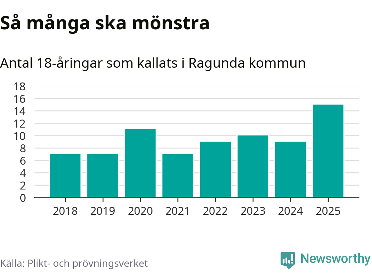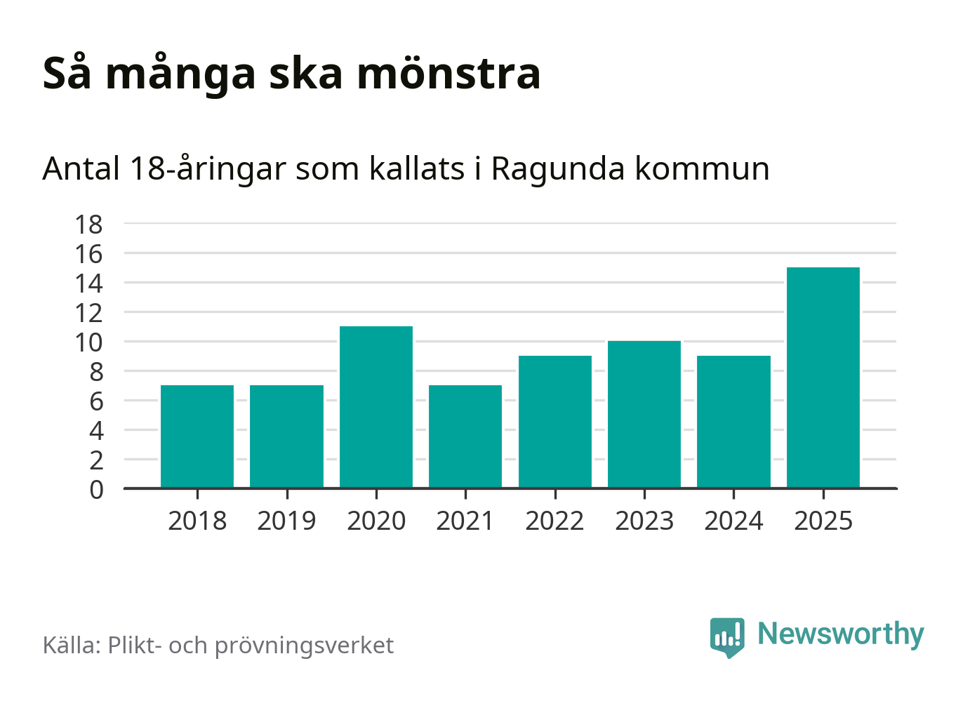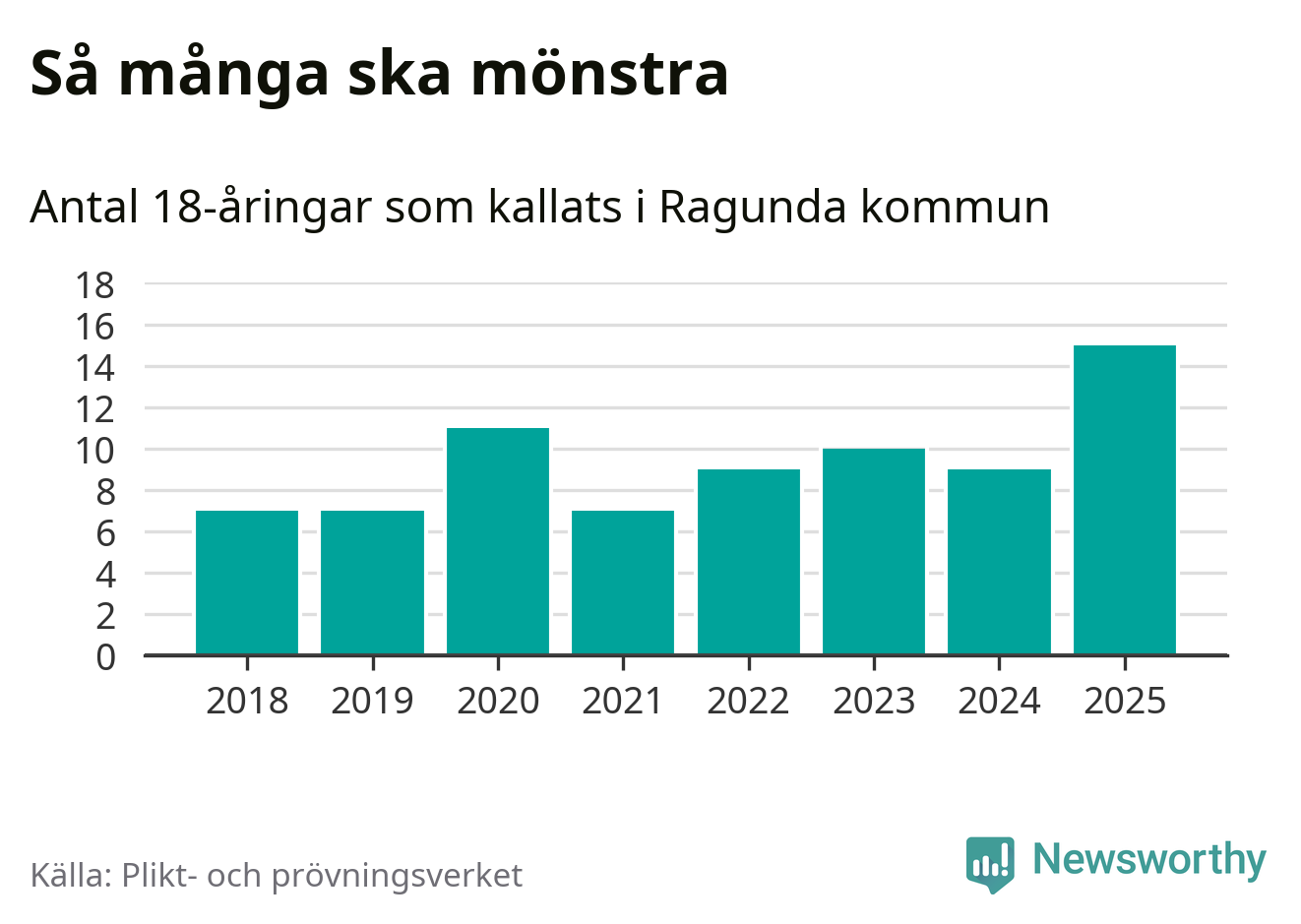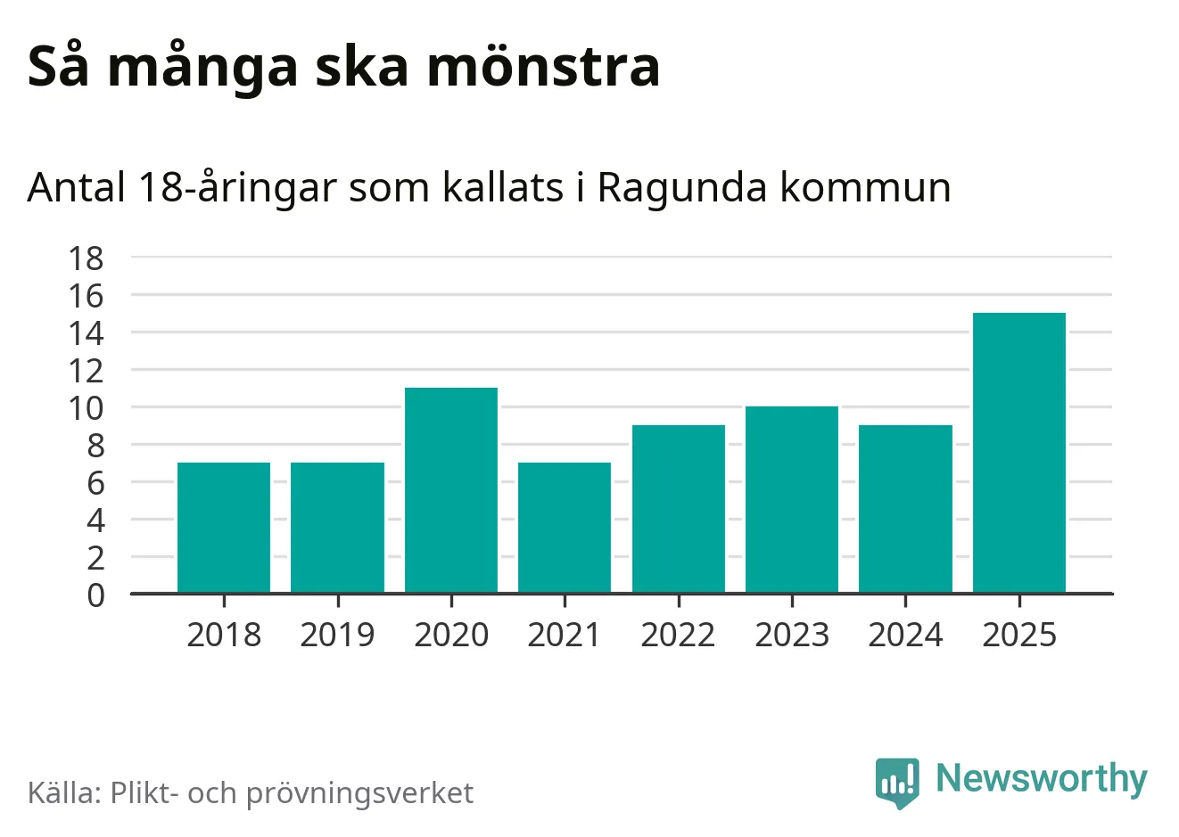 15 personer är det högsta antalet kallade i Ragunda sedan 2018, som är första året med statistik på kommunnivå (värnplikten återinfördes 2017), och sex mönstrande fler än 2024. Totalt från Jämtlands län kallas 422 personer i år.