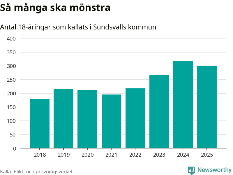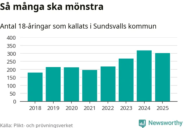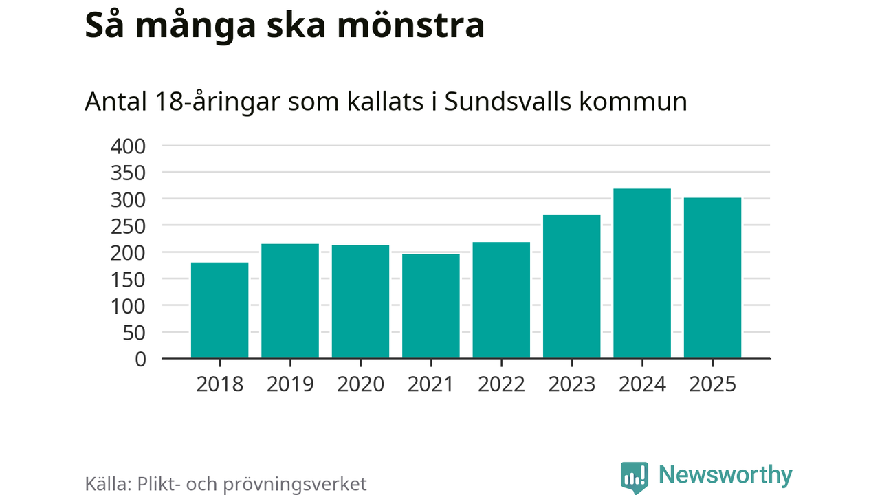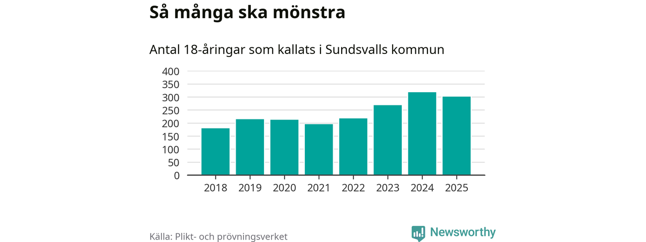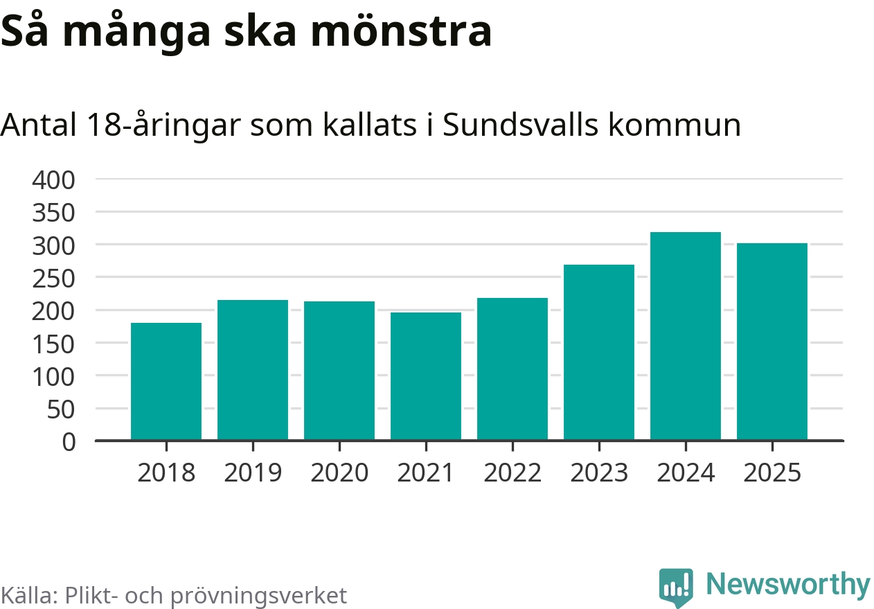 Nu kallas omkring 28 200 svenskar födda 2007 till mönstring. Och 301 av dem kommer från Sundsvall, enligt ny statistik från Plikt- och prövningsverket. Det innebär att var fjärde invånare i åldersgruppen i kommunen kallas till mönstring. Det är ungefär lika stor andel som i Västernorrland totalt. I riket som helhet kallas nästan var fjärde person i årskullen.