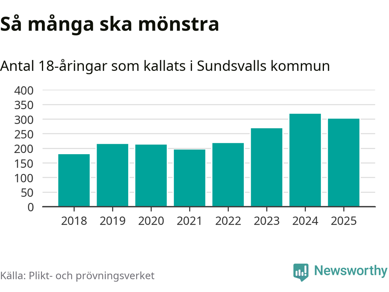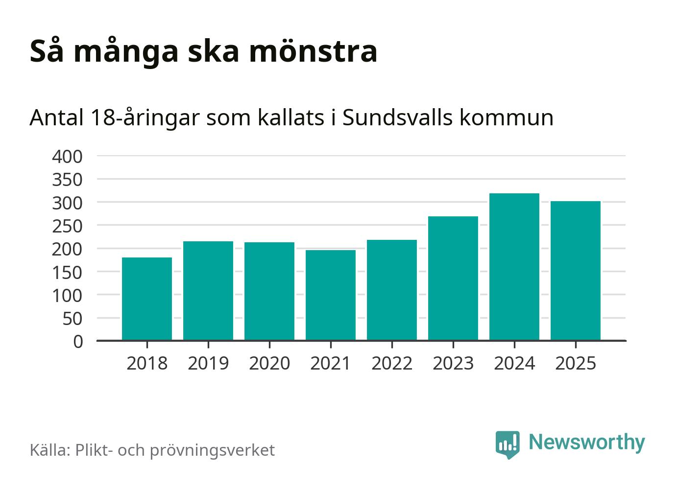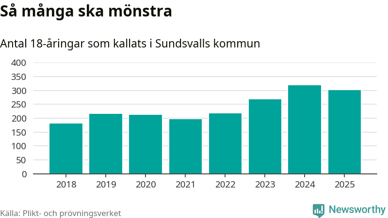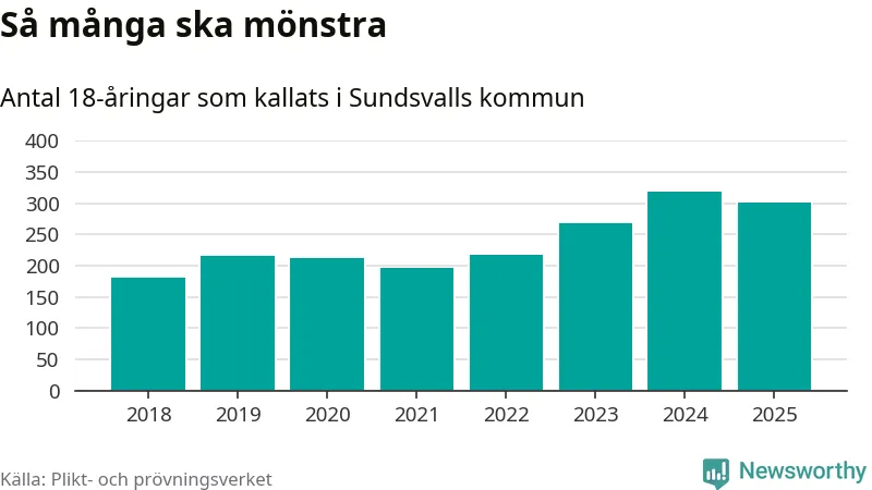 Nu kallas omkring 28 200 svenskar födda 2007 till mönstring. Och 301 av dem kommer från Sundsvall, enligt ny statistik från Plikt- och prövningsverket. Det innebär att var fjärde invånare i åldersgruppen i kommunen kallas till mönstring. Det är ungefär lika stor andel som i Västernorrland totalt. I riket som helhet kallas nästan var fjärde person i årskullen.