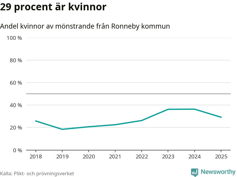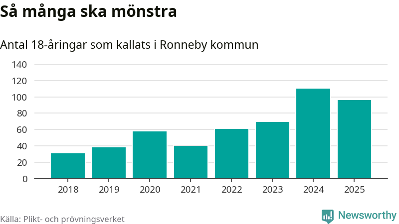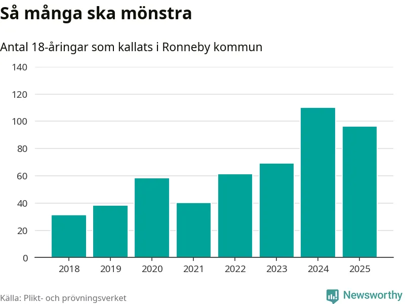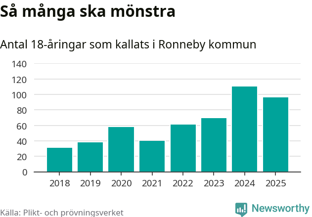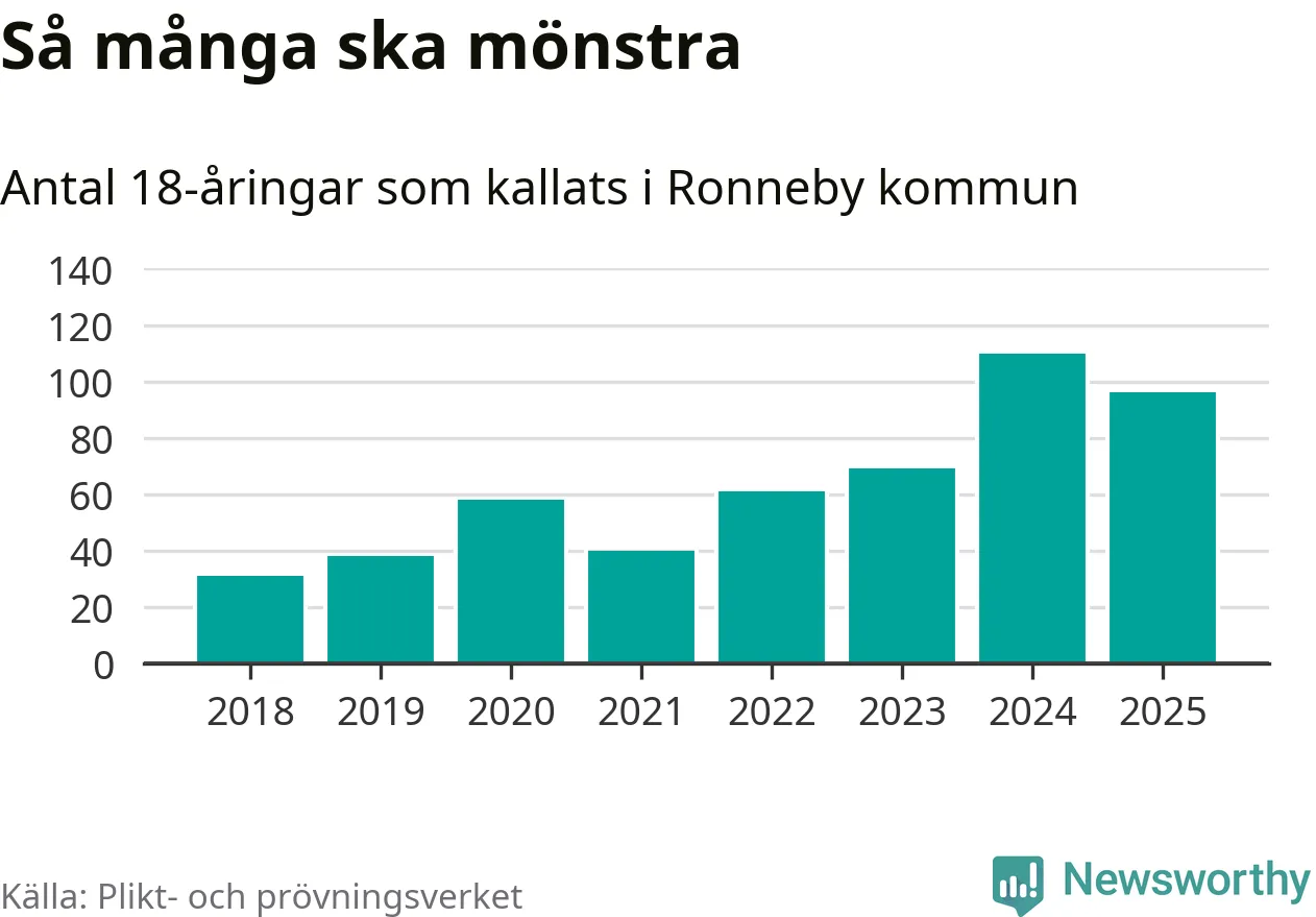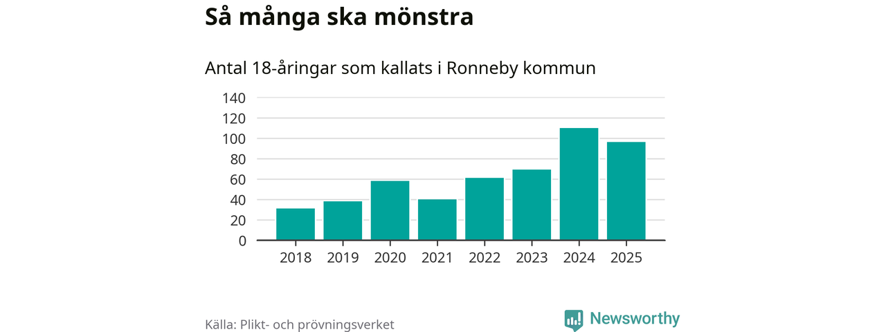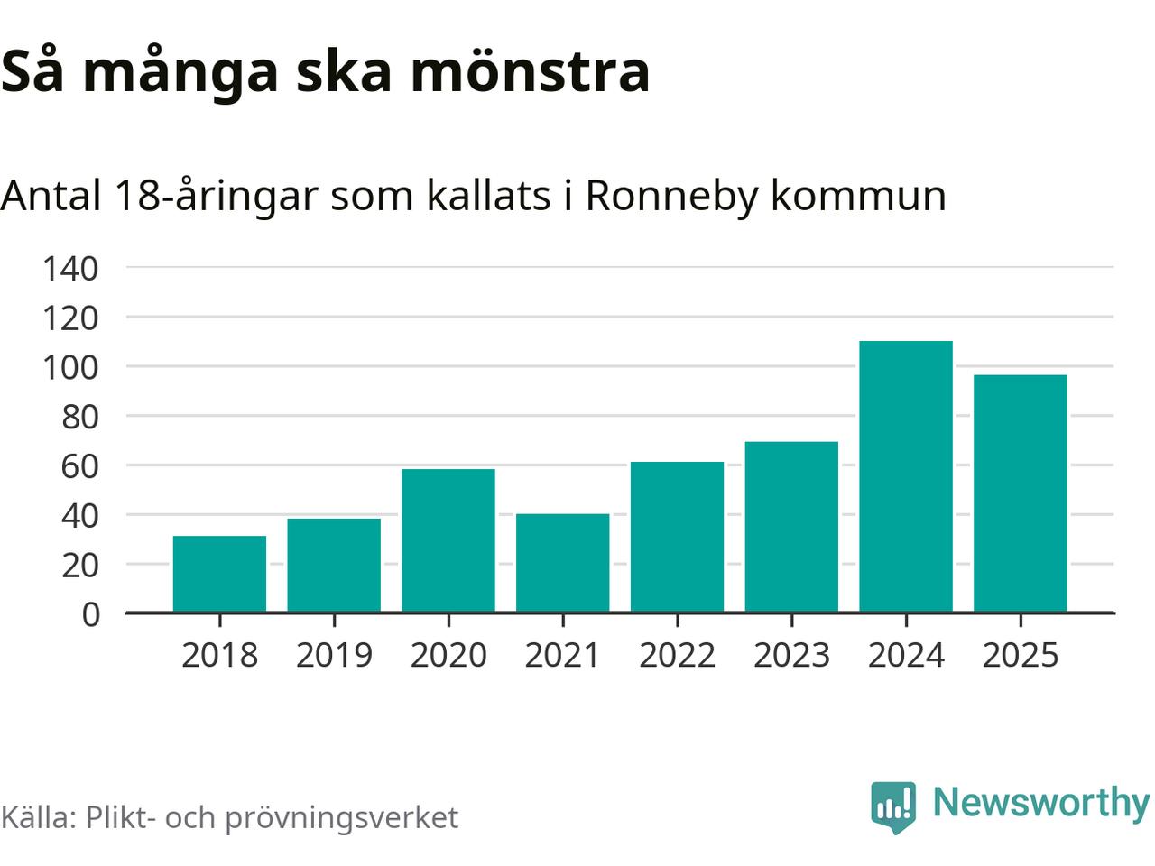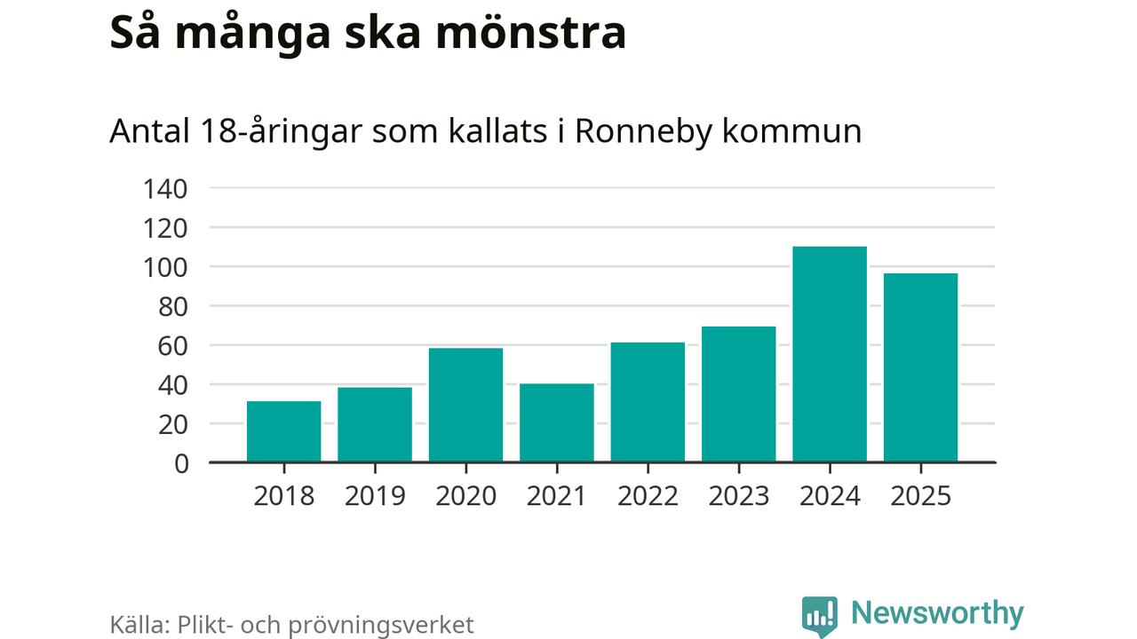 Nu kallas omkring 28 200 svenskar födda 2007 till mönstring. Och 96 av dem kommer från Ronneby, enligt ny statistik från Plikt- och prövningsverket. Det innebär att mer än var fjärde invånare i åldersgruppen i kommunen kallas till mönstring. Det är ungefär lika stor andel som i Blekinge totalt. I riket som helhet kallas nästan var fjärde person i årskullen.