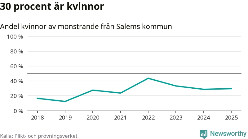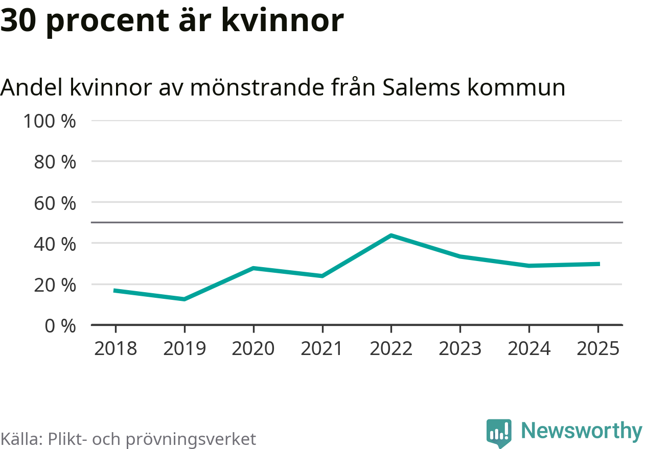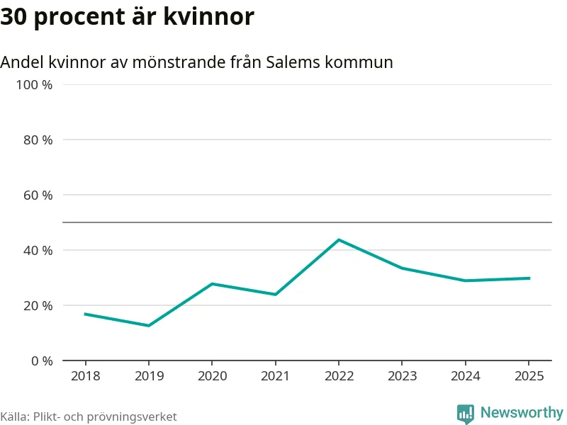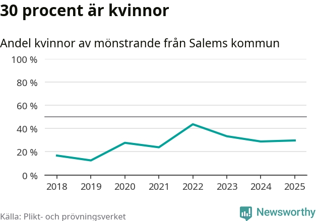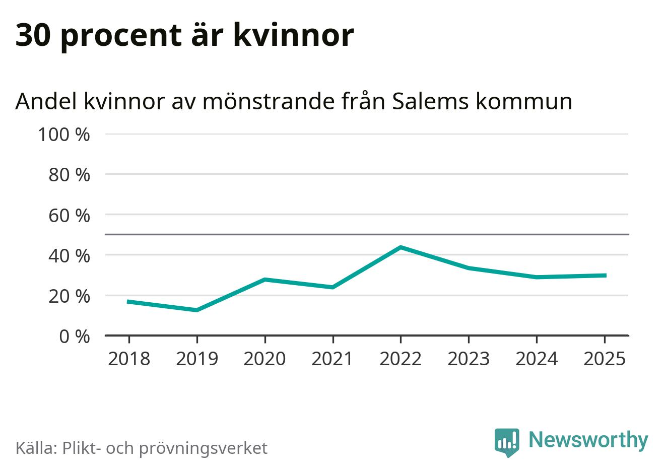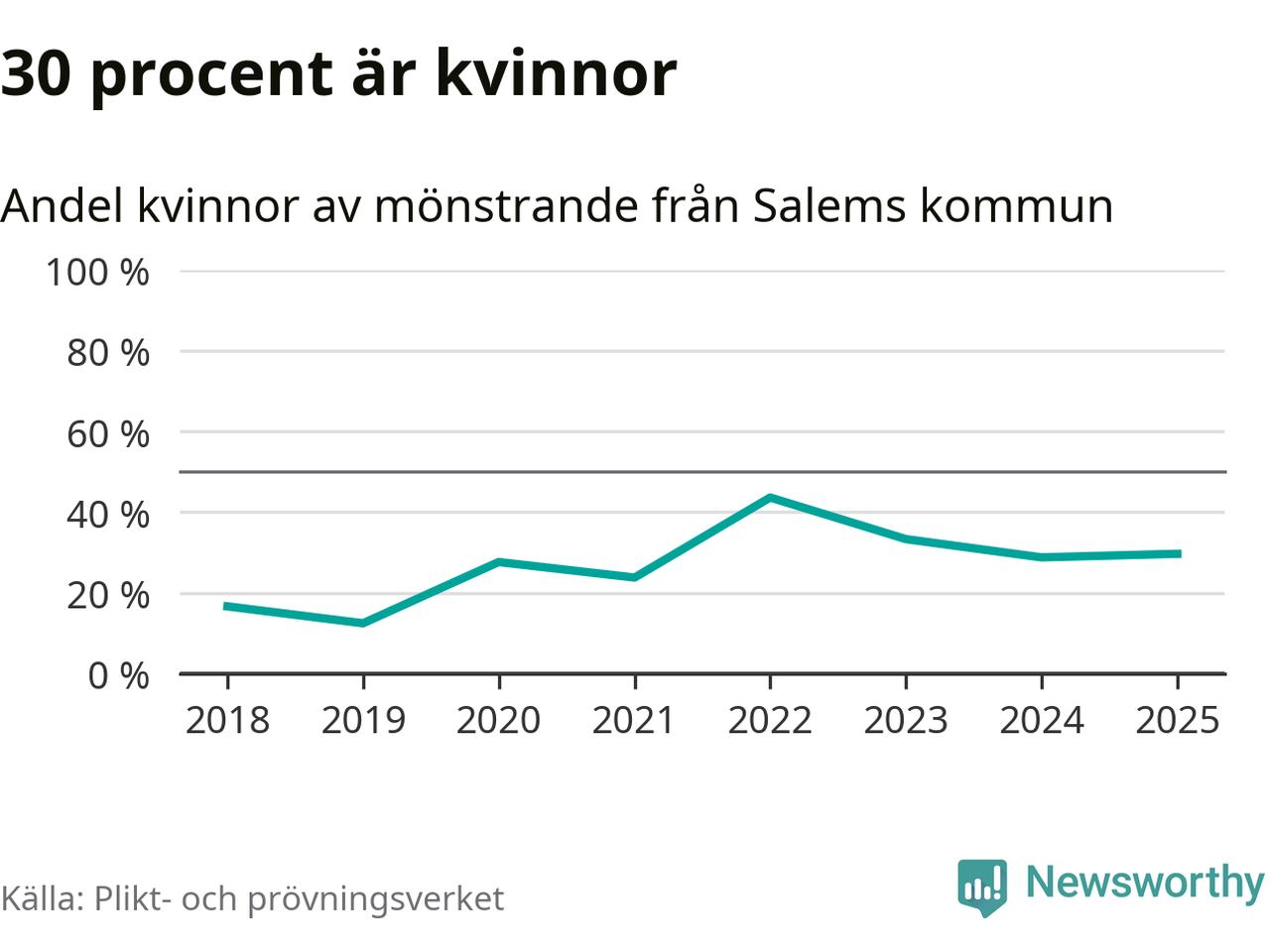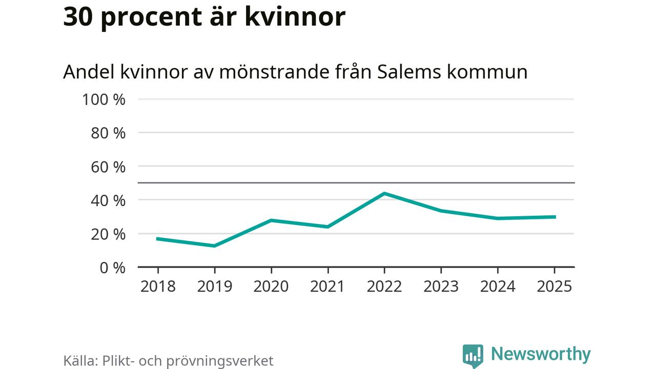 Nu kallas omkring 28 200 svenskar födda 2007 till mönstring. Och 64 av dem kommer från Salem, enligt ny statistik från Plikt- och prövningsverket. Det innebär att nästan var fjärde invånare i åldersgruppen i kommunen kallas till mönstring. Det är ungefär lika stor andel som i Stockholms län totalt. Även i riket som helhet kallas nästan var fjärde person i årskullen.