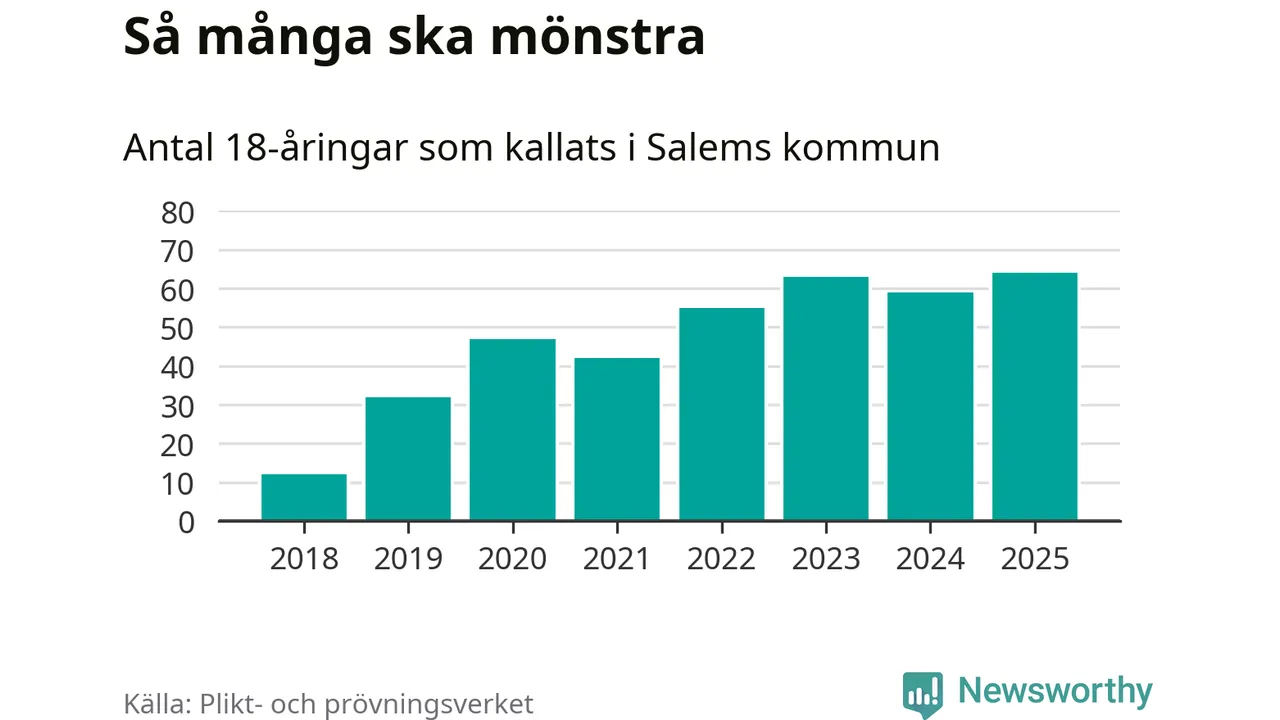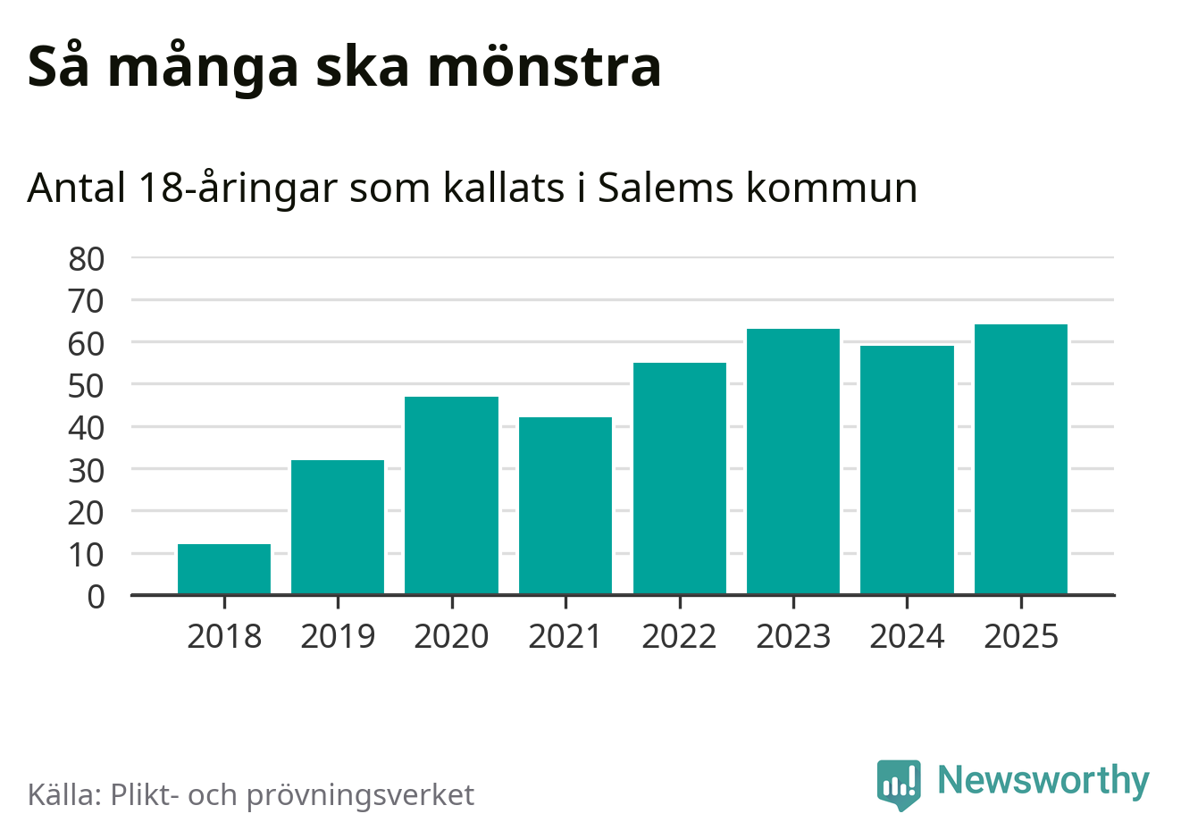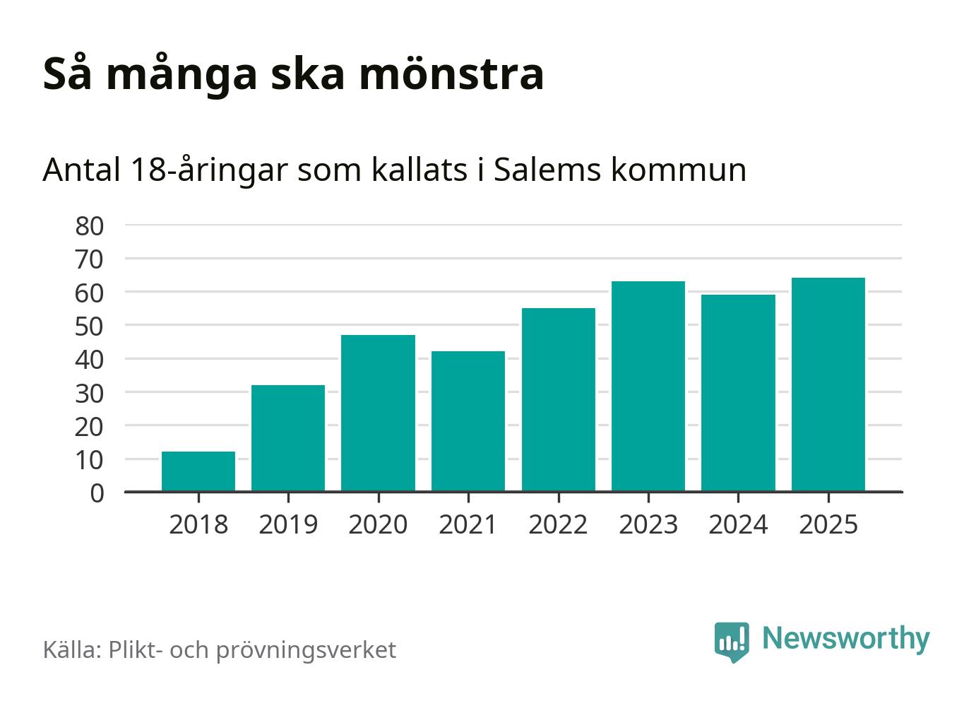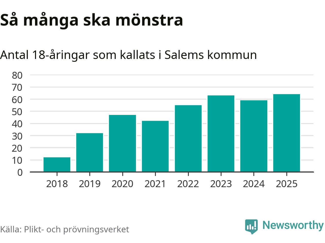 64 personer är det högsta antalet kallade i Salem sedan 2018, som är första året med statistik på kommunnivå (värnplikten återinfördes 2017), och fem mönstrande fler än 2024. Totalt från Stockholms län kallas 6 801 personer i år.