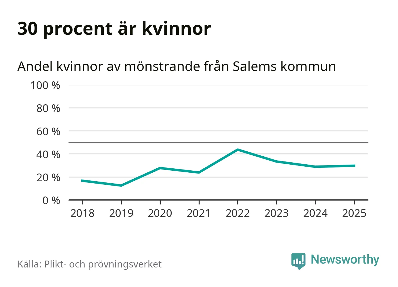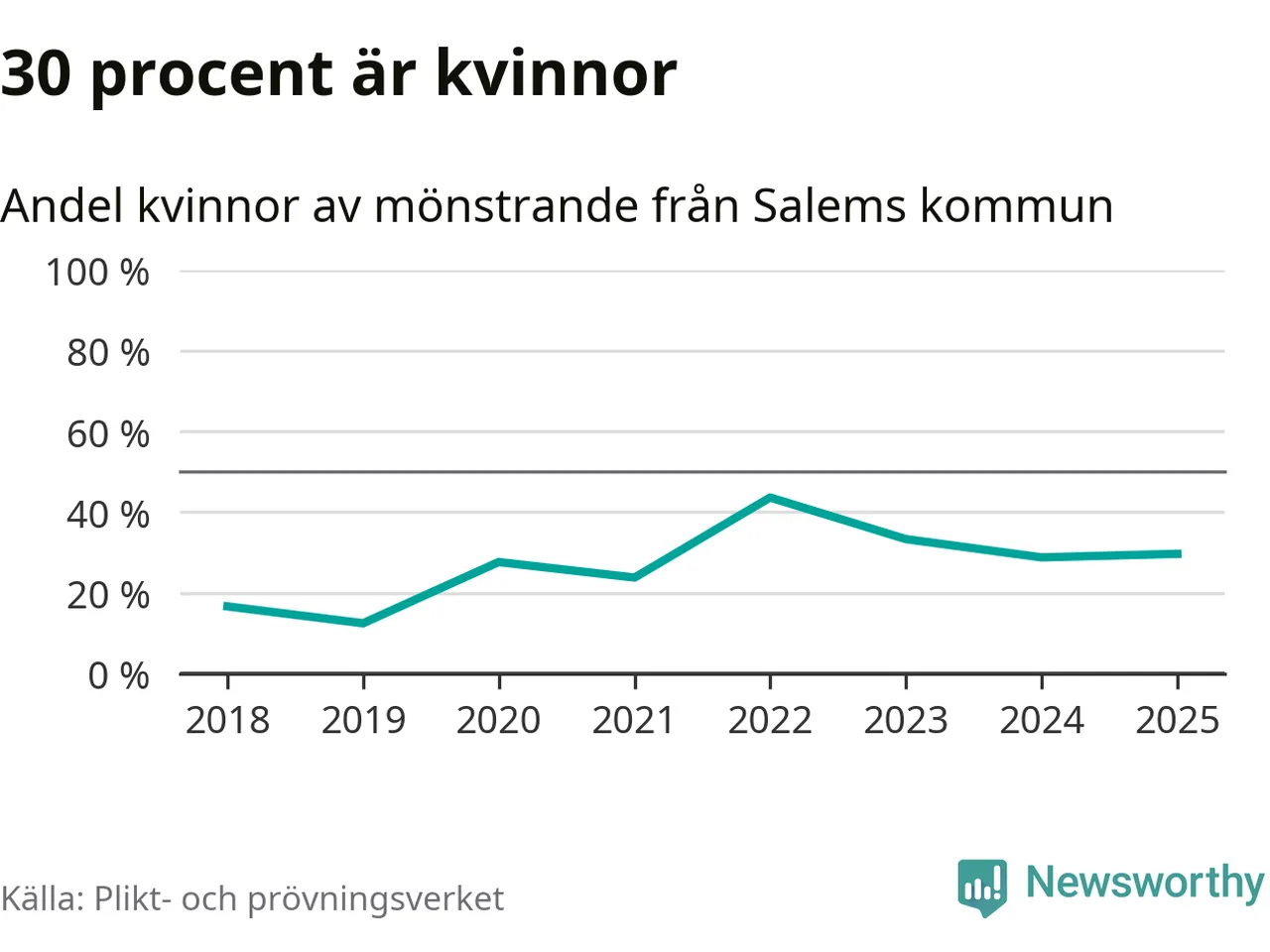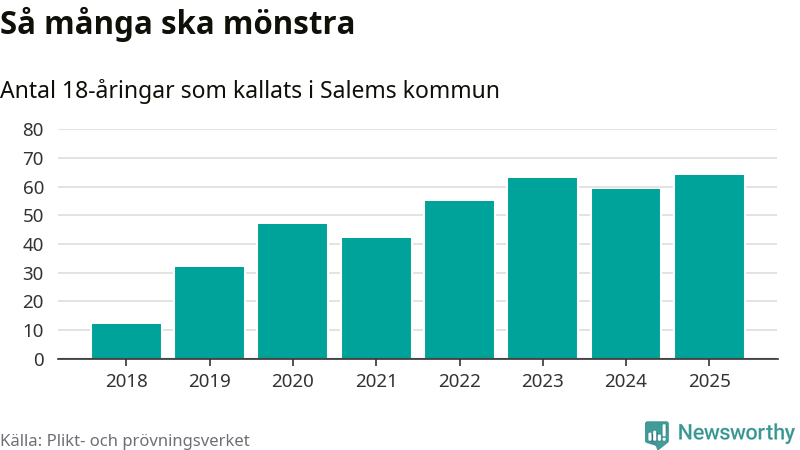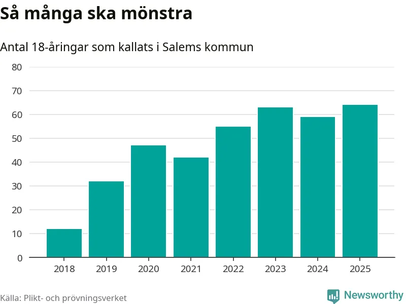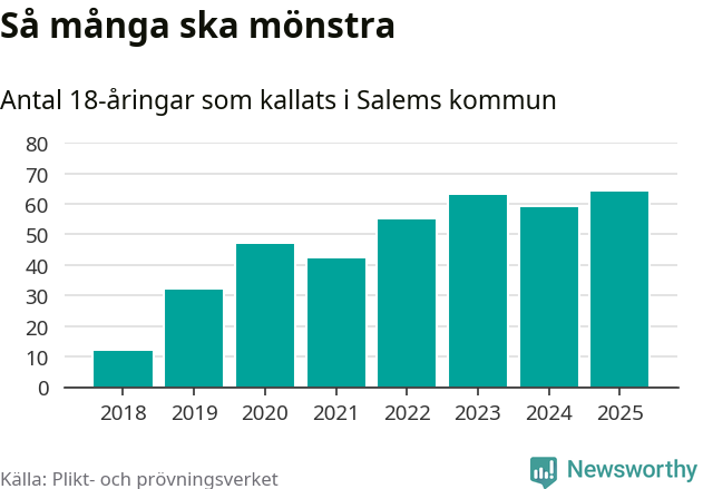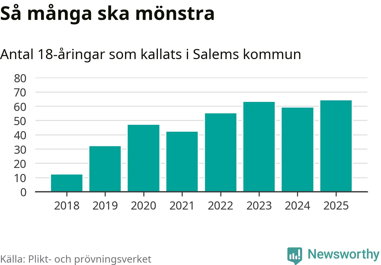 64 personer är det högsta antalet kallade i Salem sedan 2018, som är första året med statistik på kommunnivå (värnplikten återinfördes 2017), och fem mönstrande fler än 2024. Totalt från Stockholms län kallas 6 801 personer i år.