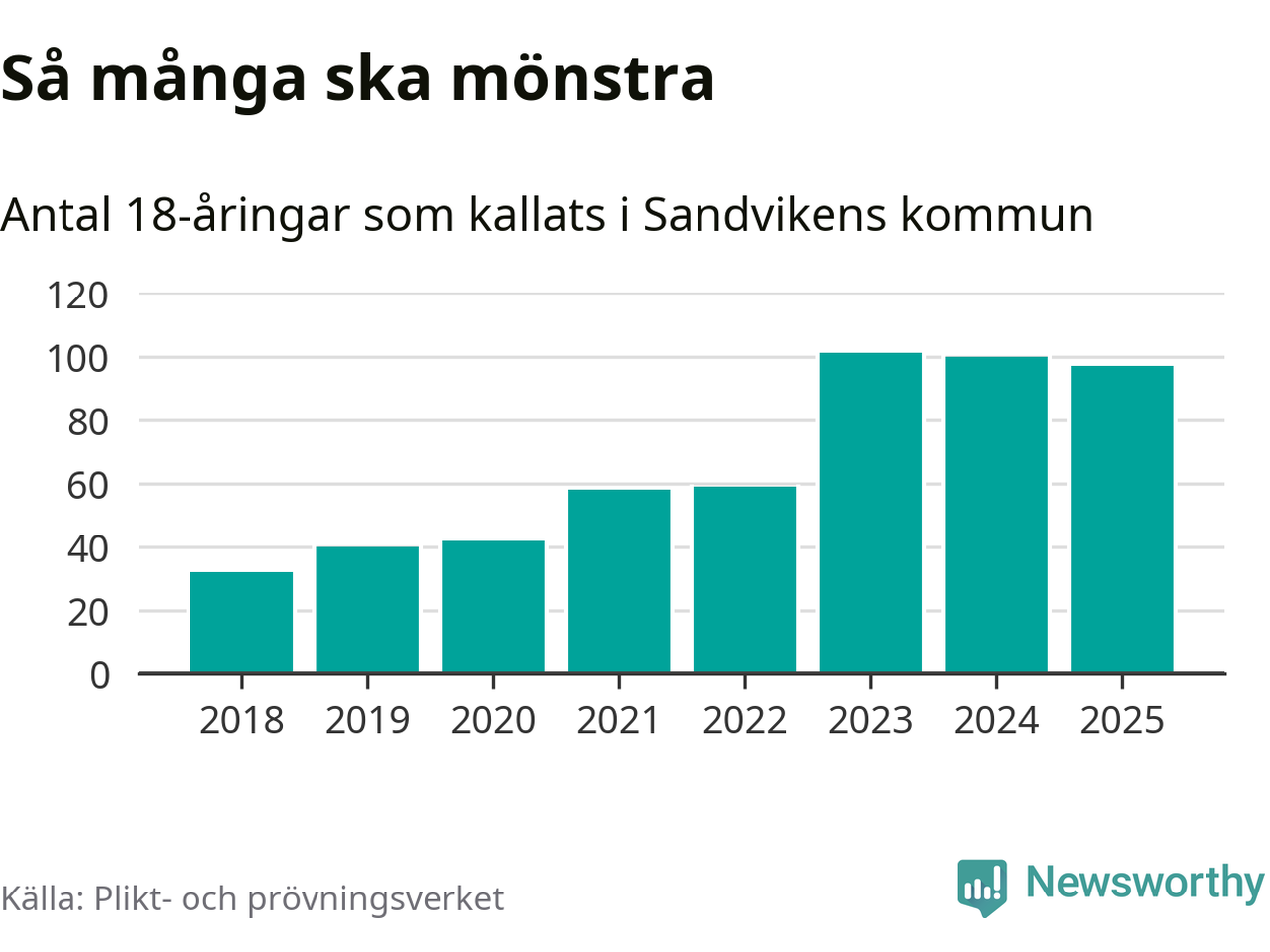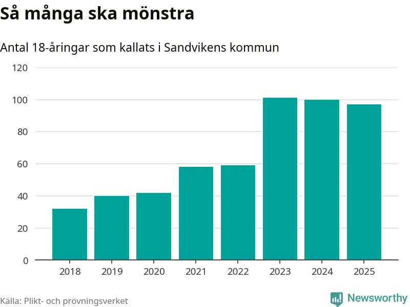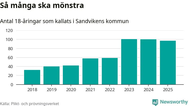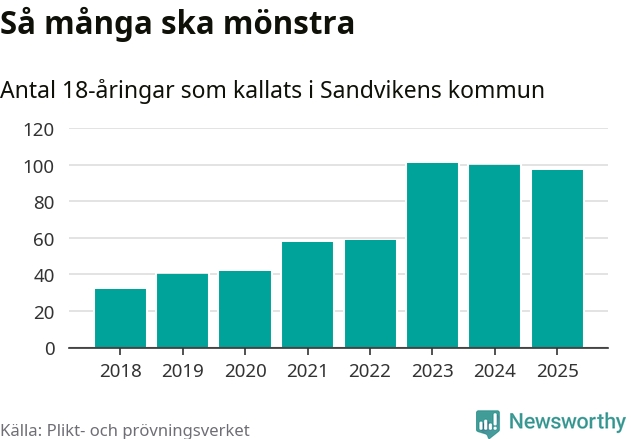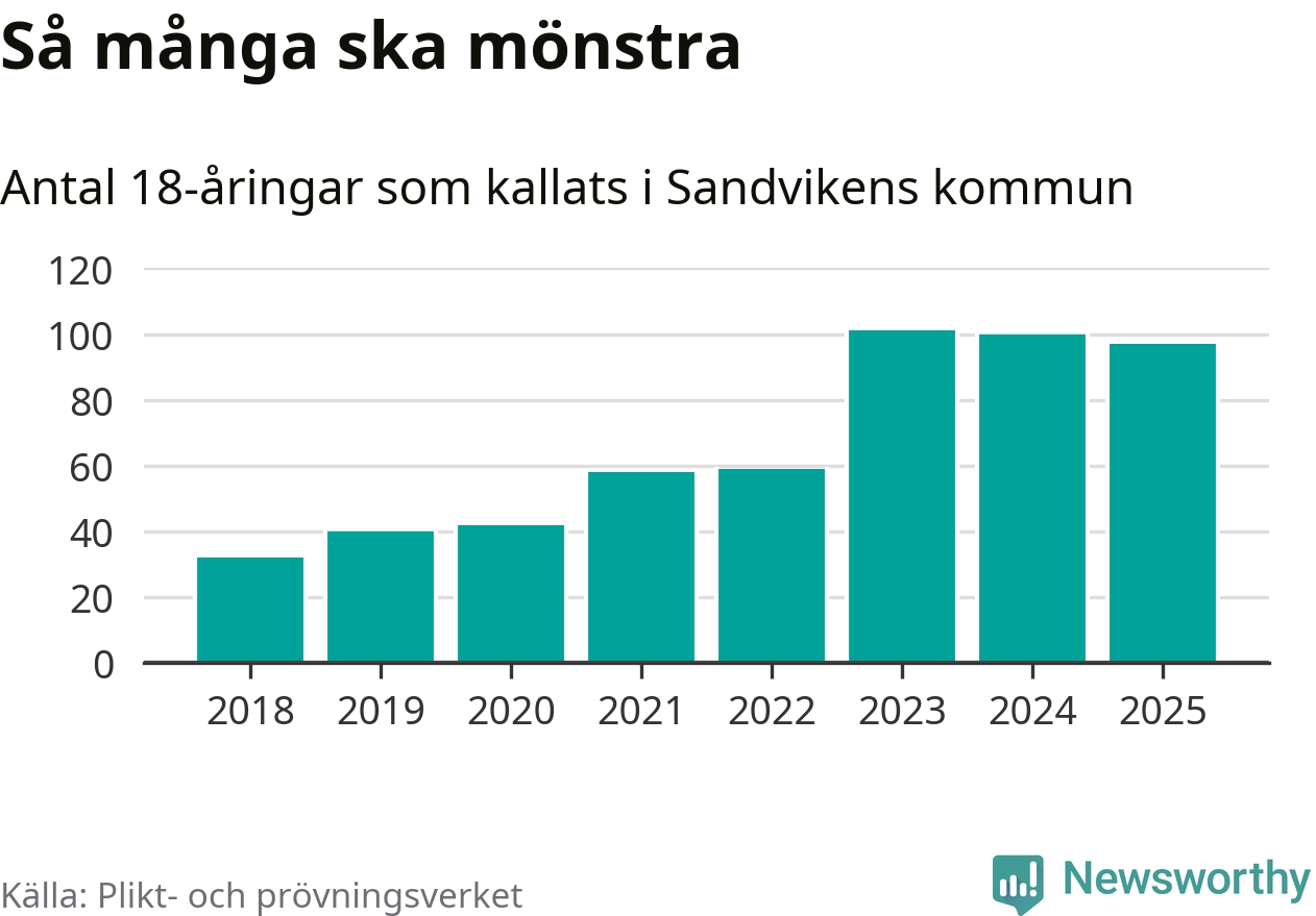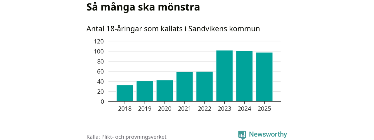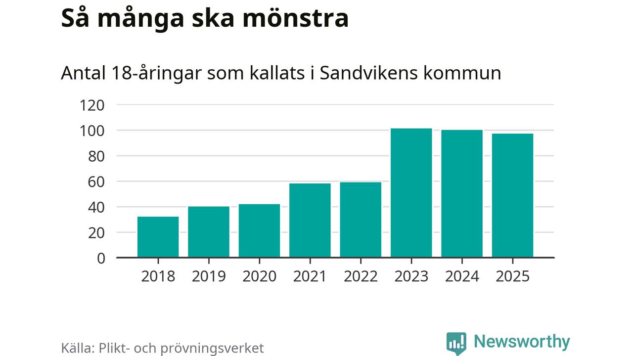 Nu kallas omkring 28 200 svenskar födda 2007 till mönstring. Och 97 av dem kommer från Sandviken, enligt ny statistik från Plikt- och prövningsverket. Det innebär att var femte invånare i åldersgruppen i kommunen kallas till mönstring. Det är ungefär lika stor andel som i Gävleborg totalt. I riket som helhet kallas nästan var fjärde person i årskullen.