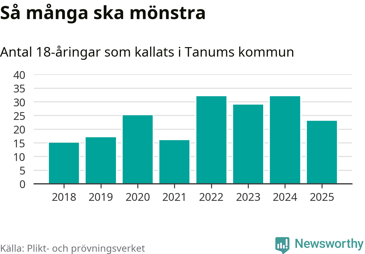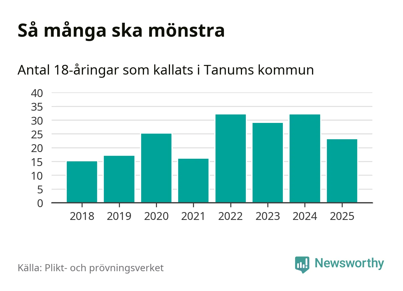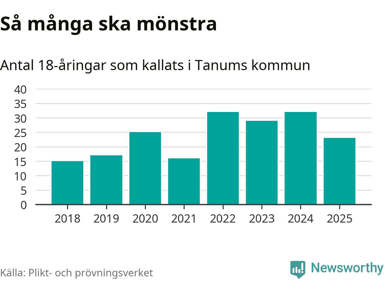 Nu kallas omkring 28 200 svenskar födda 2007 till mönstring. Och 23 av dem kommer från Tanum, enligt ny statistik från Plikt- och prövningsverket. Det innebär att var femte invånare i åldersgruppen i kommunen kallas till mönstring. Det är en lägre andel än i Västra Götaland totalt. I riket som helhet kallas nästan var fjärde person i årskullen.
