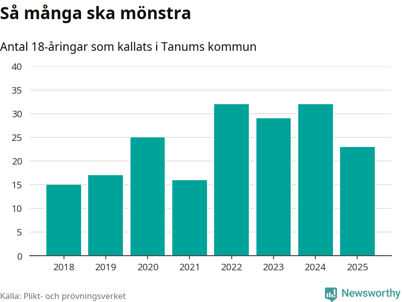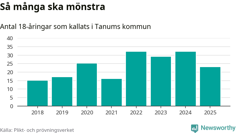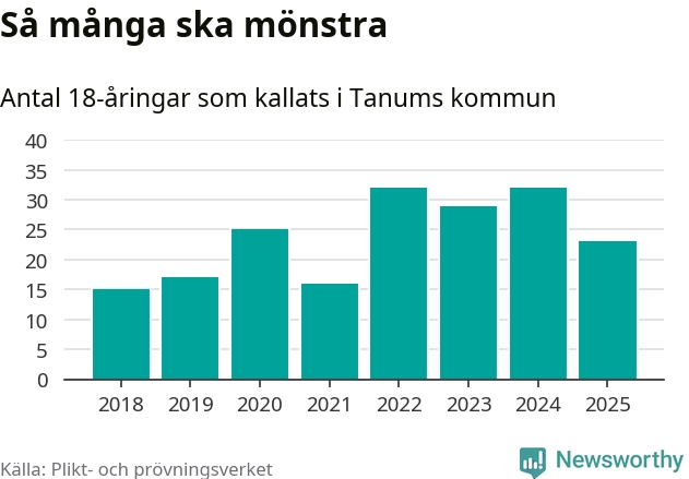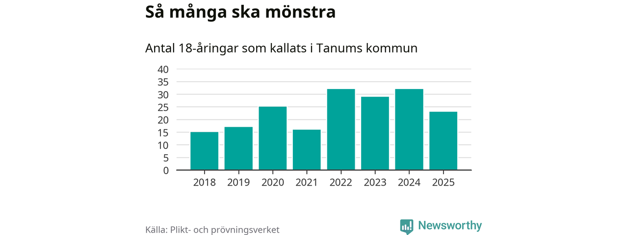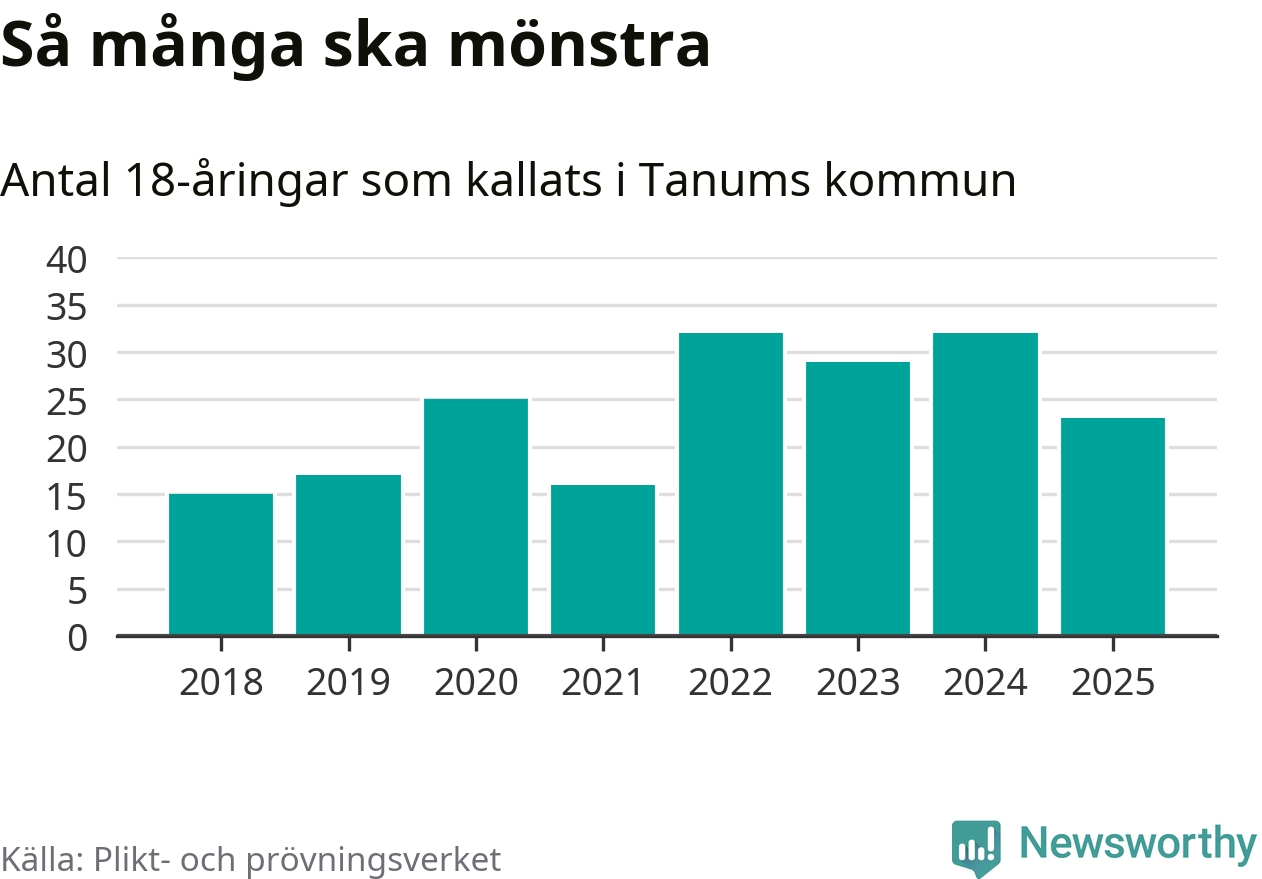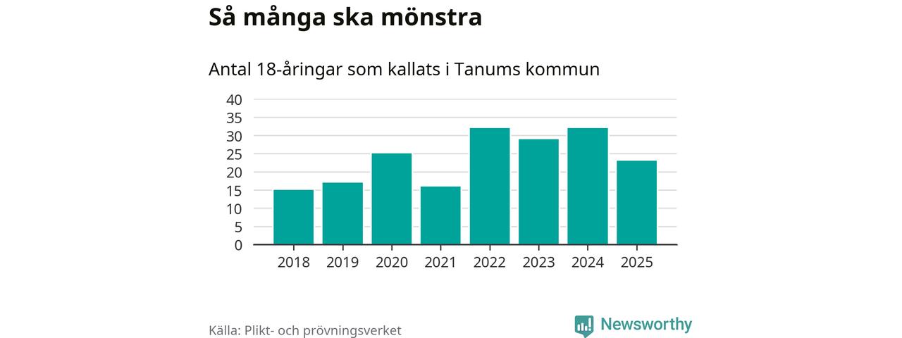 Nu kallas omkring 28 200 svenskar födda 2007 till mönstring. Och 23 av dem kommer från Tanum, enligt ny statistik från Plikt- och prövningsverket. Det innebär att var femte invånare i åldersgruppen i kommunen kallas till mönstring. Det är en lägre andel än i Västra Götaland totalt. I riket som helhet kallas nästan var fjärde person i årskullen.
