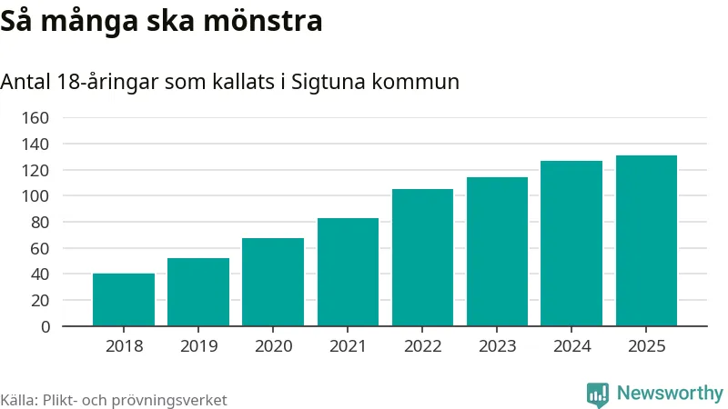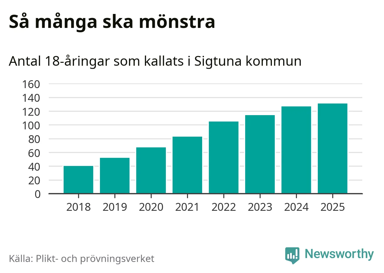 Antalet kallade i Sigtuna har ökat varje år sedan 2018, som är första året med statistik på kommunnivå (värnplikten återinfördes 2017), och jämfört med 2024 är det fyra fler i år. Totalt från Stockholms län kallas 6 801 personer i år.