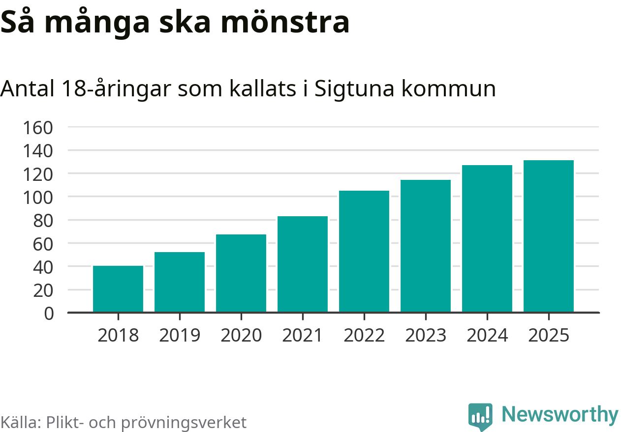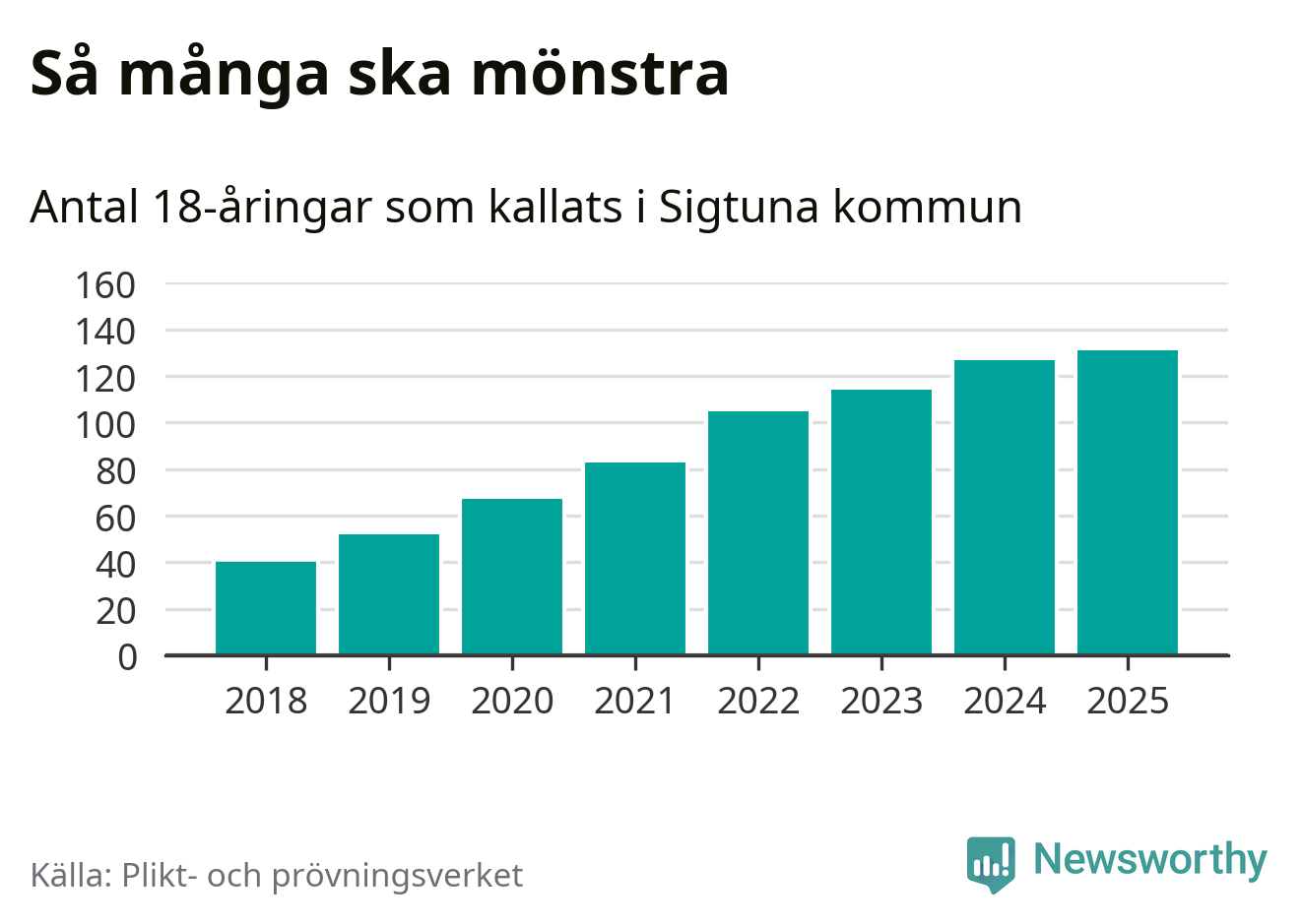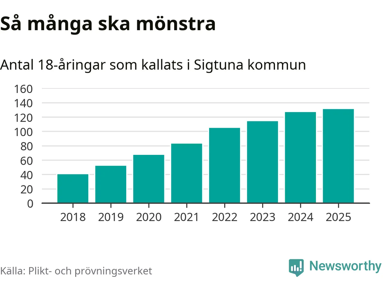Nu kallas omkring 28 200 svenskar födda 2007 till mönstring. Och 131 av dem kommer från Sigtuna, enligt ny statistik från Plikt- och prövningsverket. Det innebär att var sjätte invånare i åldersgruppen i kommunen kallas till mönstring. Det är en lägre andel än i Stockholms län totalt. I riket som helhet kallas nästan var fjärde person i årskullen.