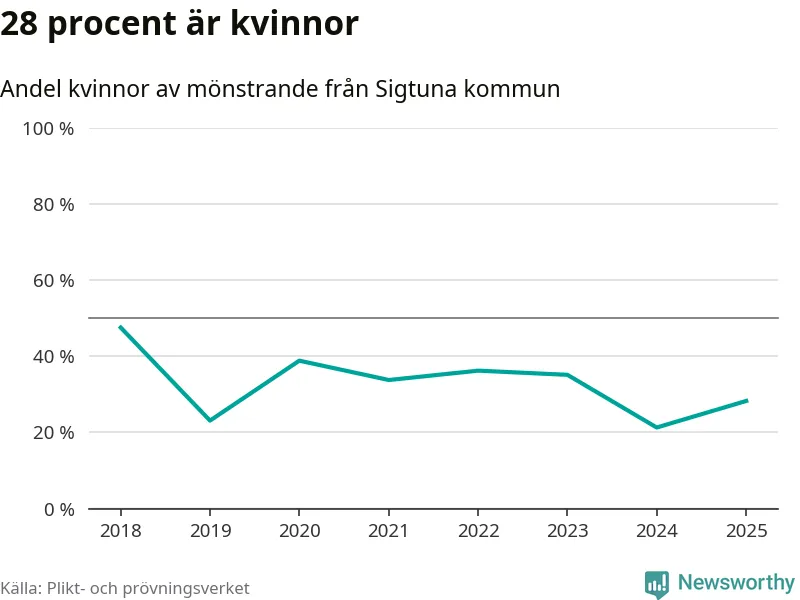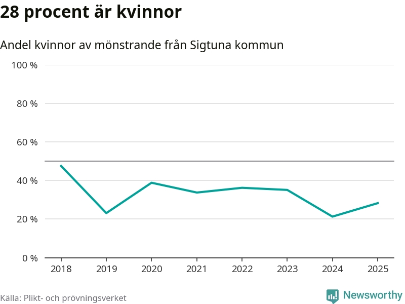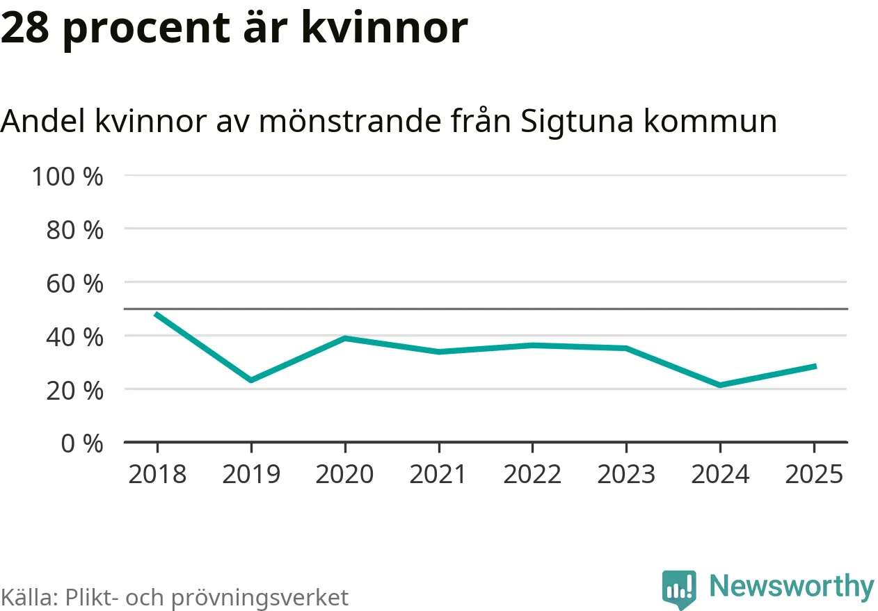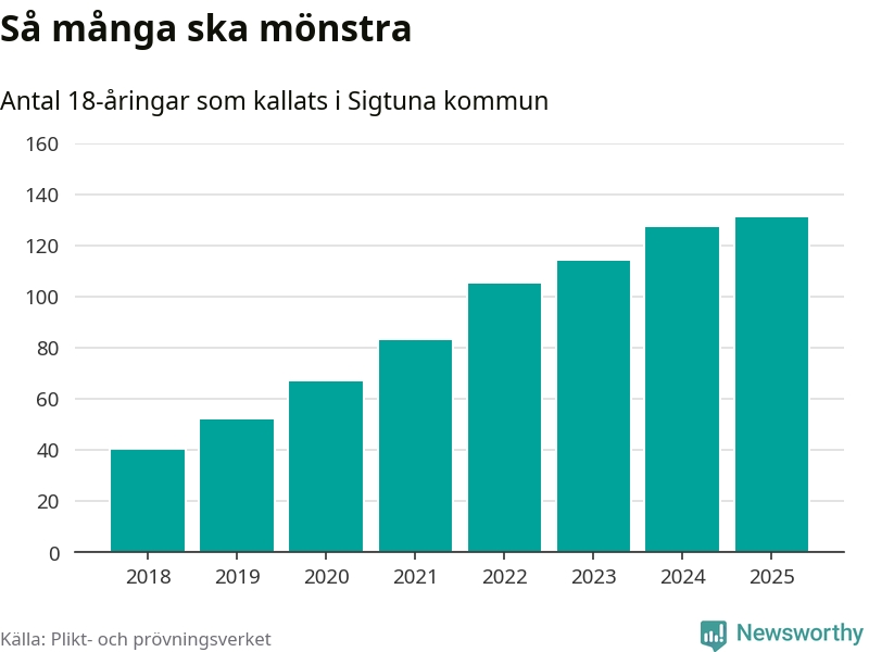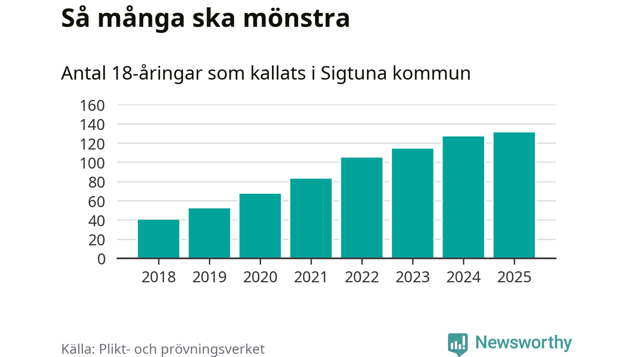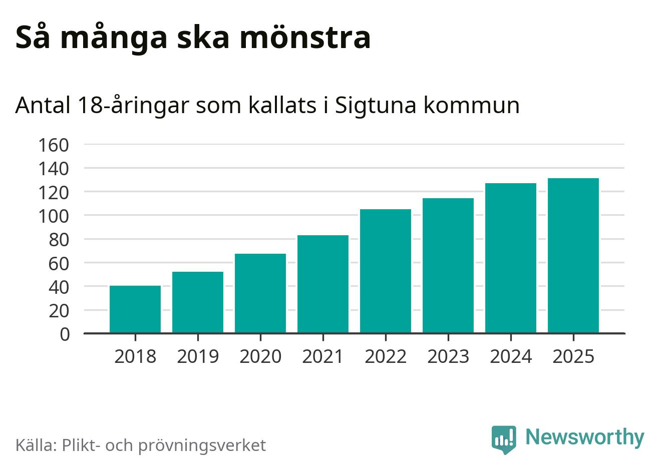 Nu kallas omkring 28 200 svenskar födda 2007 till mönstring. Och 131 av dem kommer från Sigtuna, enligt ny statistik från Plikt- och prövningsverket. Det innebär att var sjätte invånare i åldersgruppen i kommunen kallas till mönstring. Det är en lägre andel än i Stockholms län totalt. I riket som helhet kallas nästan var fjärde person i årskullen.