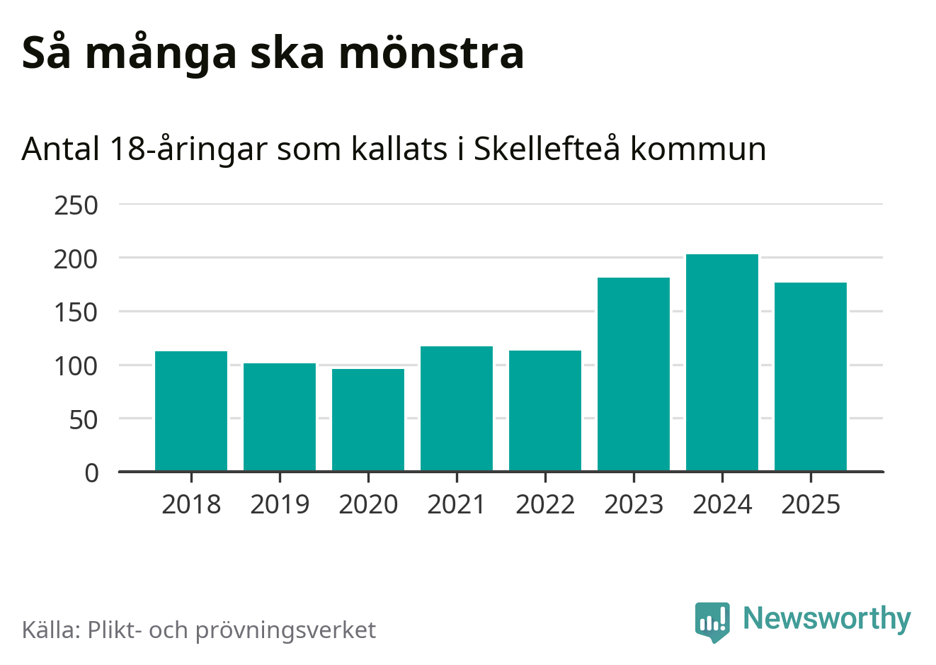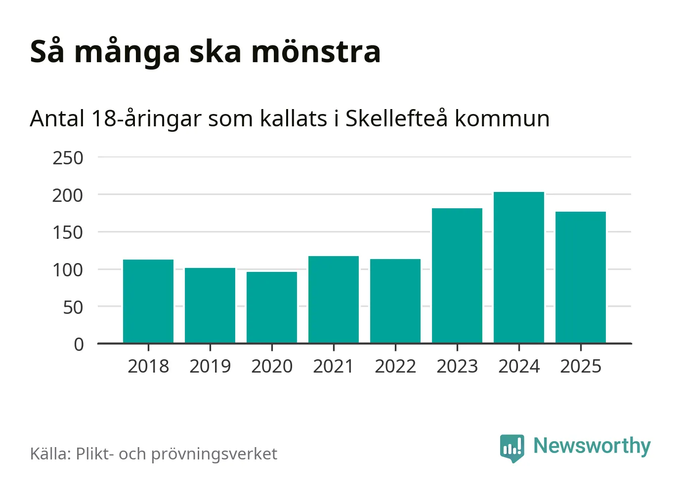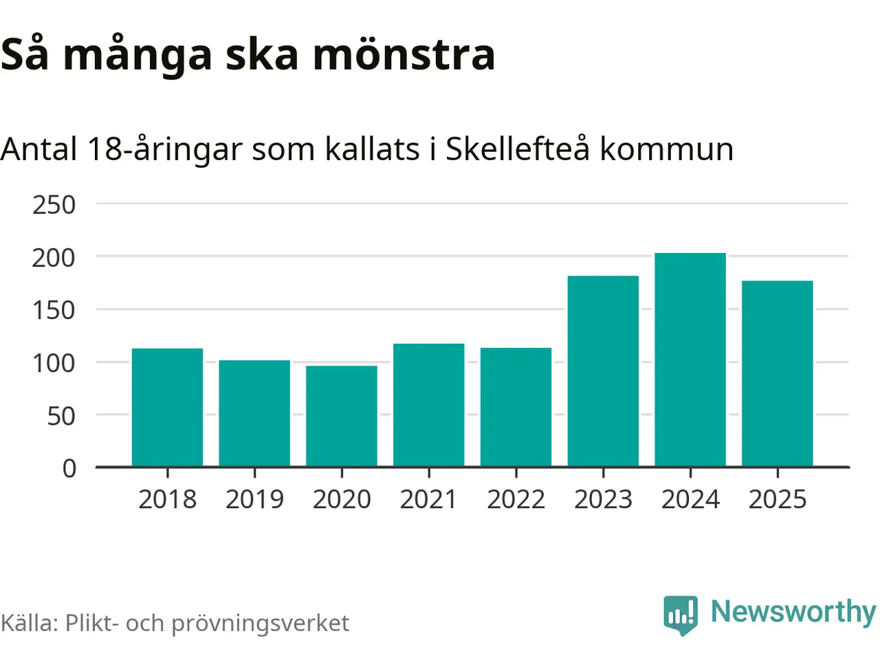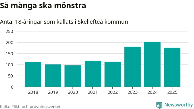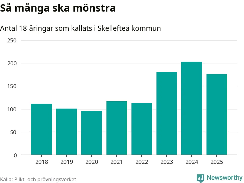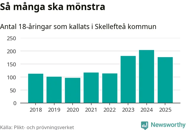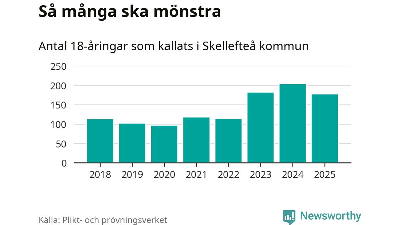 Nu kallas omkring 28 200 svenskar födda 2007 till mönstring. Och 176 av dem kommer från Skellefteå, enligt ny statistik från Plikt- och prövningsverket. Det innebär att var femte invånare i åldersgruppen i kommunen kallas till mönstring. Det är ungefär lika stor andel som i Västerbotten totalt. I riket som helhet kallas nästan var fjärde person i årskullen.