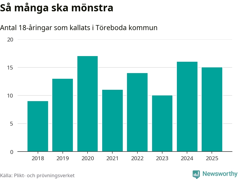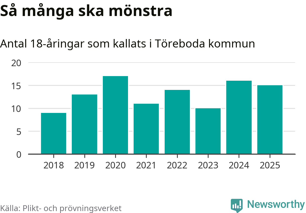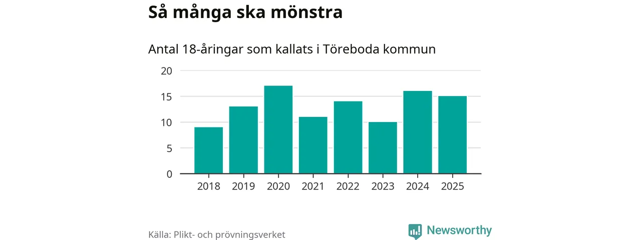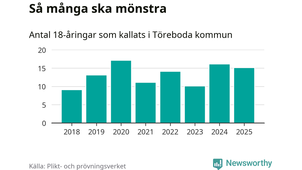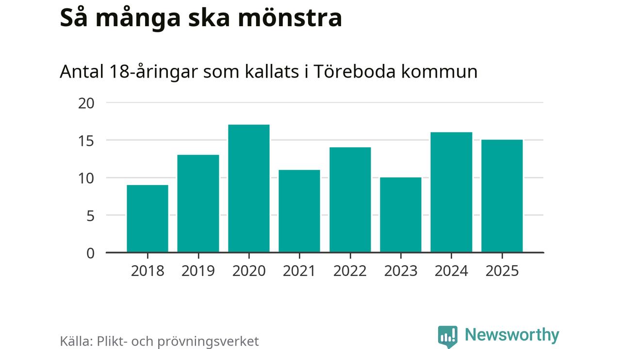 Nu kallas omkring 28 200 svenskar födda 2007 till mönstring. Och 15 av dem kommer från Töreboda, enligt ny statistik från Plikt- och prövningsverket. Det innebär att var åttonde invånare i åldersgruppen i kommunen kallas till mönstring. Det är en lägre andel än i Västra Götaland totalt. I riket som helhet kallas nästan var fjärde person i årskullen.