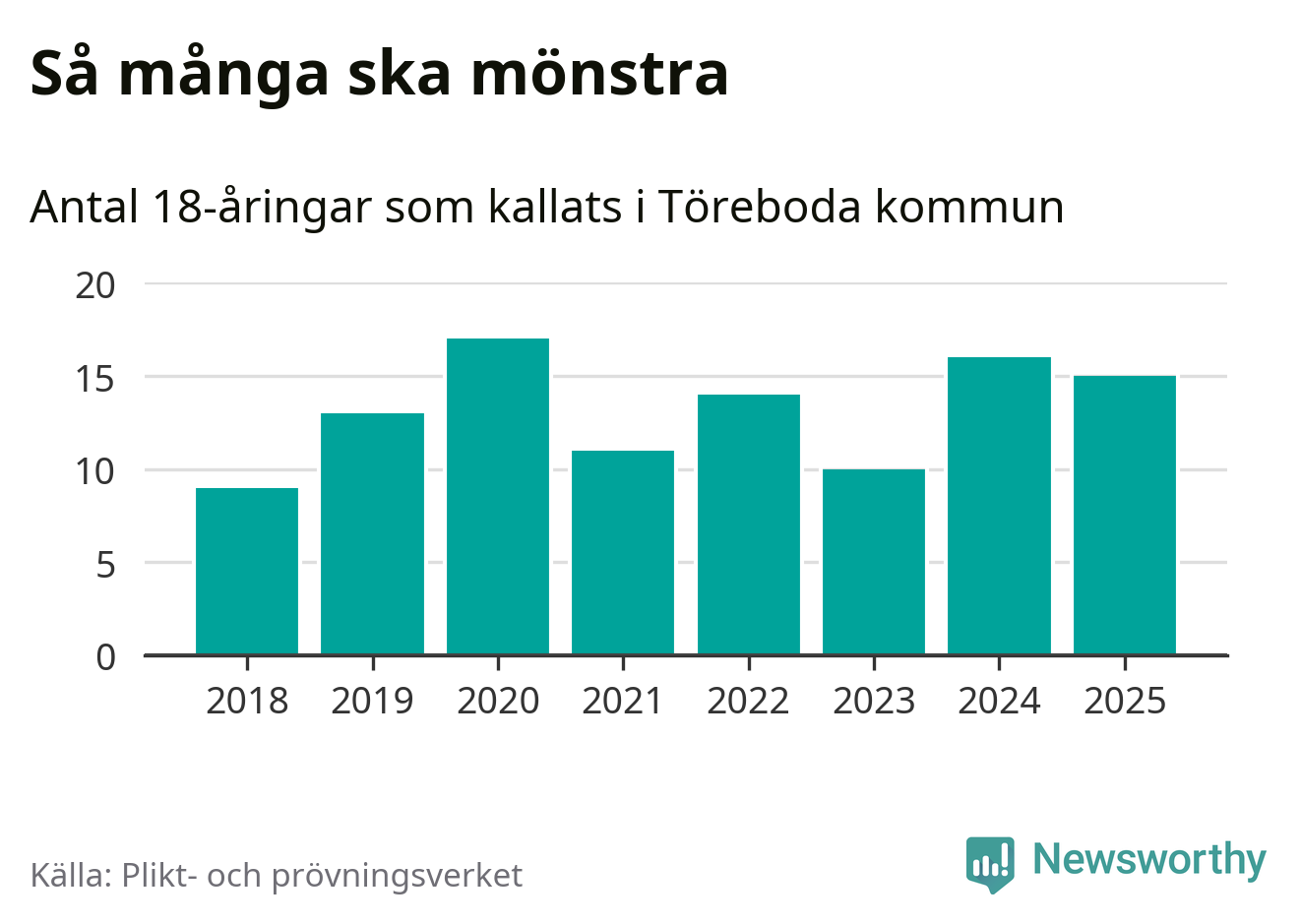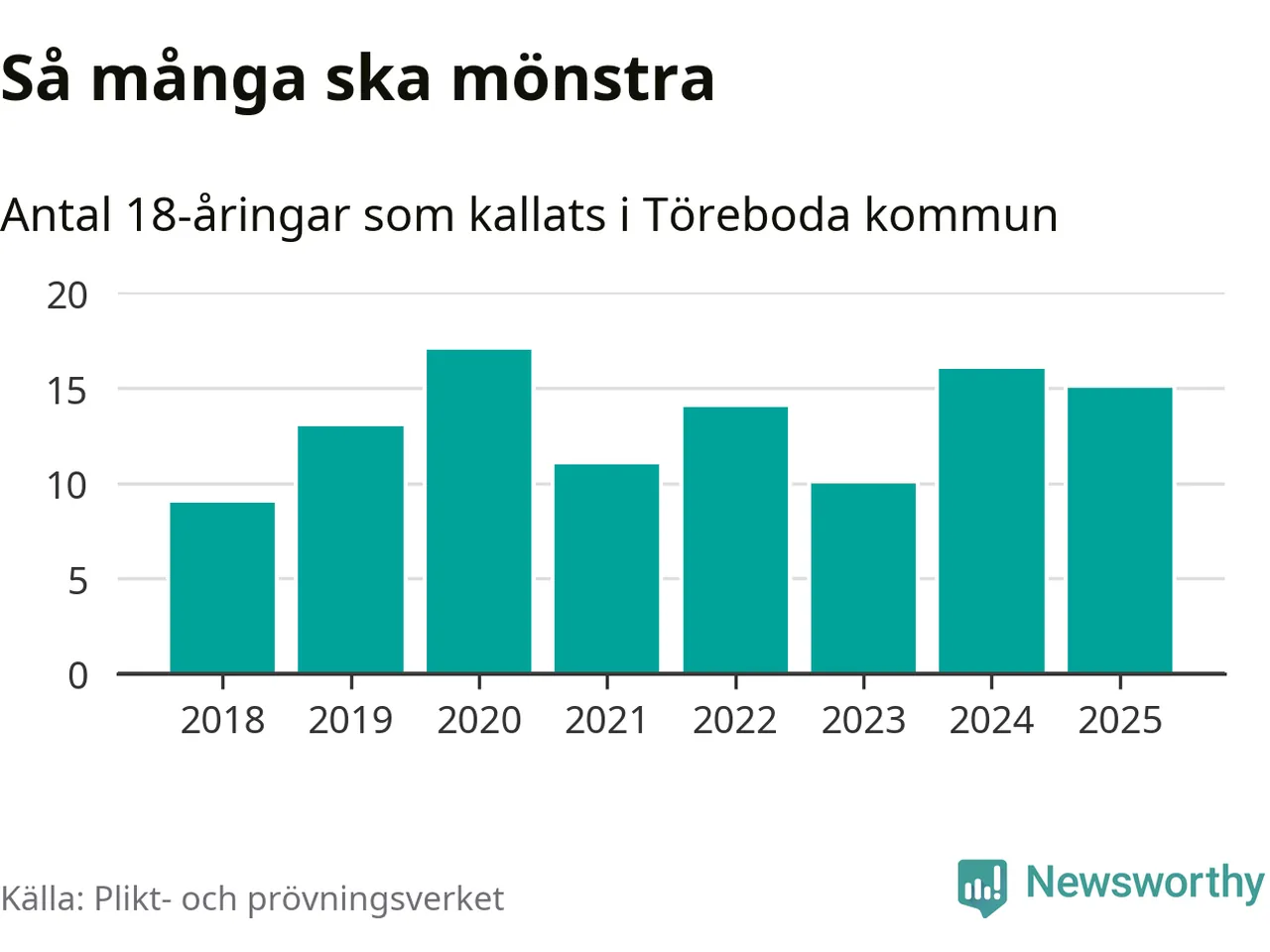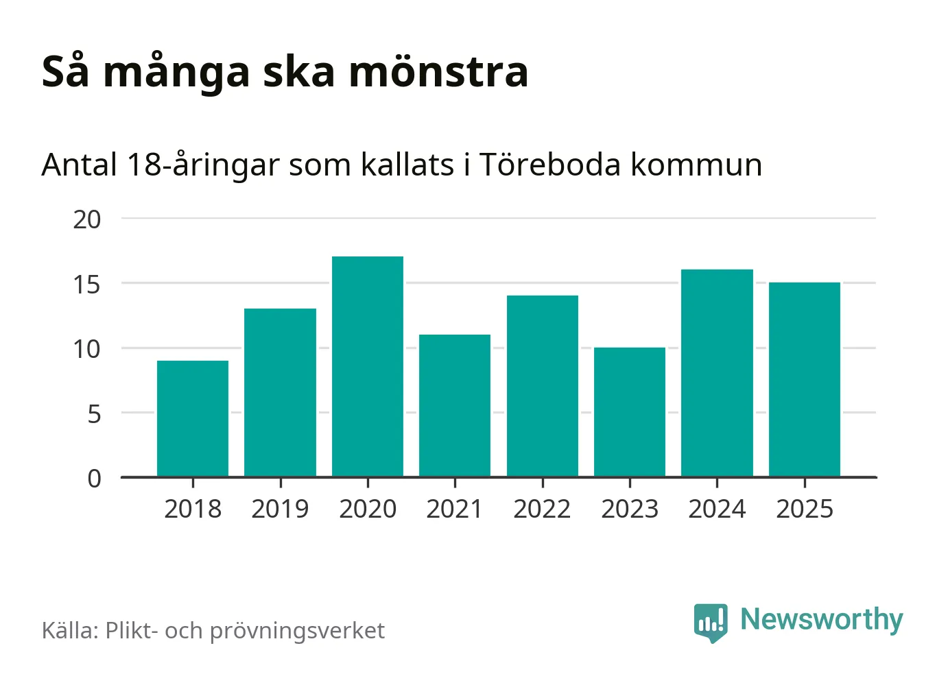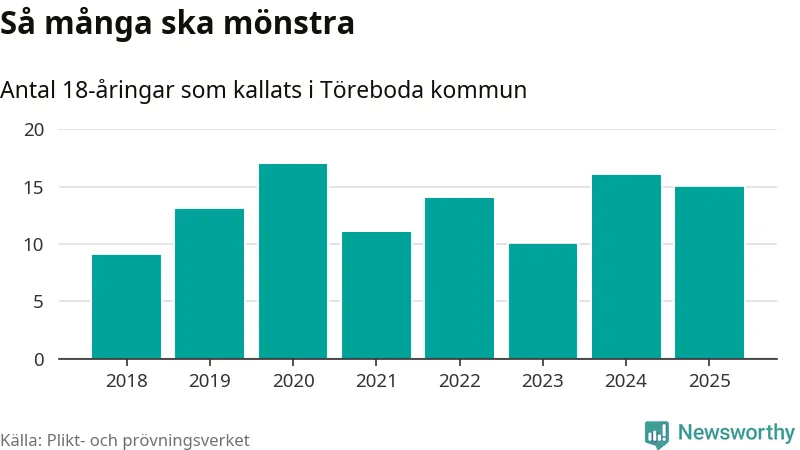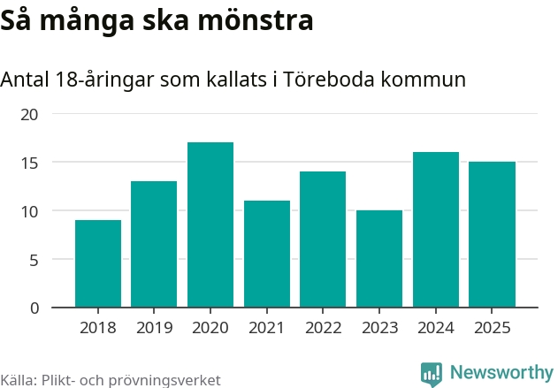Nu kallas omkring 28 200 svenskar födda 2007 till mönstring. Och 15 av dem kommer från Töreboda, enligt ny statistik från Plikt- och prövningsverket. Det innebär att var åttonde invånare i åldersgruppen i kommunen kallas till mönstring. Det är en lägre andel än i Västra Götaland totalt. I riket som helhet kallas nästan var fjärde person i årskullen.