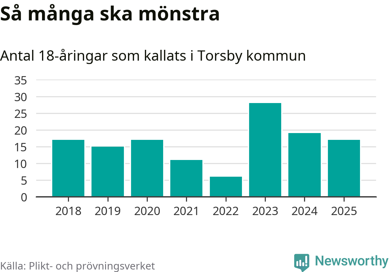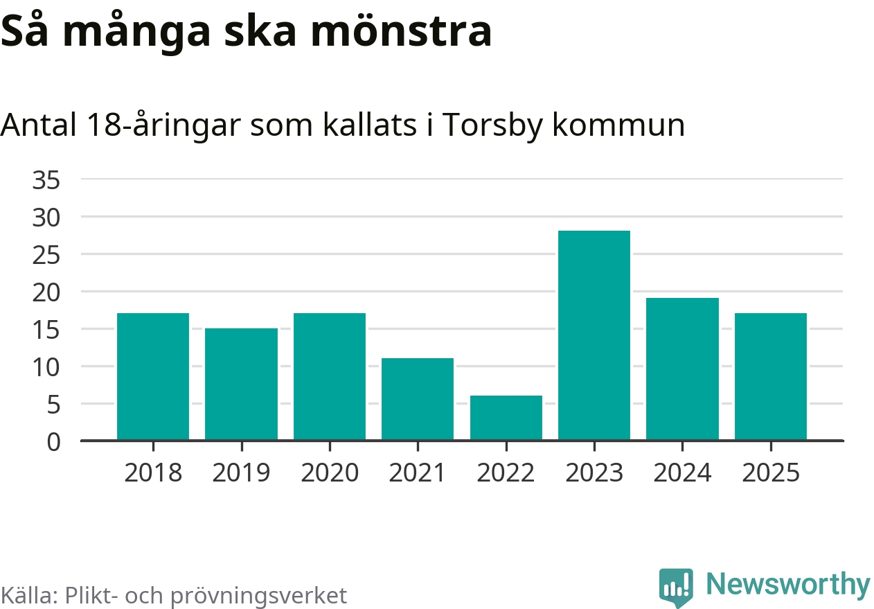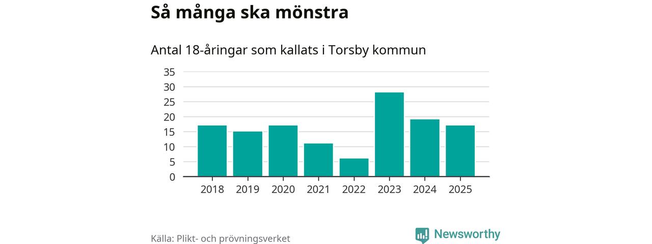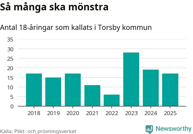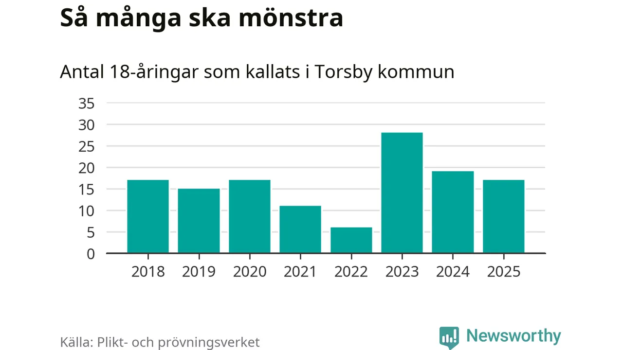 Nu kallas omkring 28 200 svenskar födda 2007 till mönstring. Och 17 av dem kommer från Torsby, enligt ny statistik från Plikt- och prövningsverket. Det innebär att var sjunde invånare i åldersgruppen i kommunen kallas till mönstring. Det är en lägre andel än i Värmland totalt. I riket som helhet kallas nästan var fjärde person i årskullen.