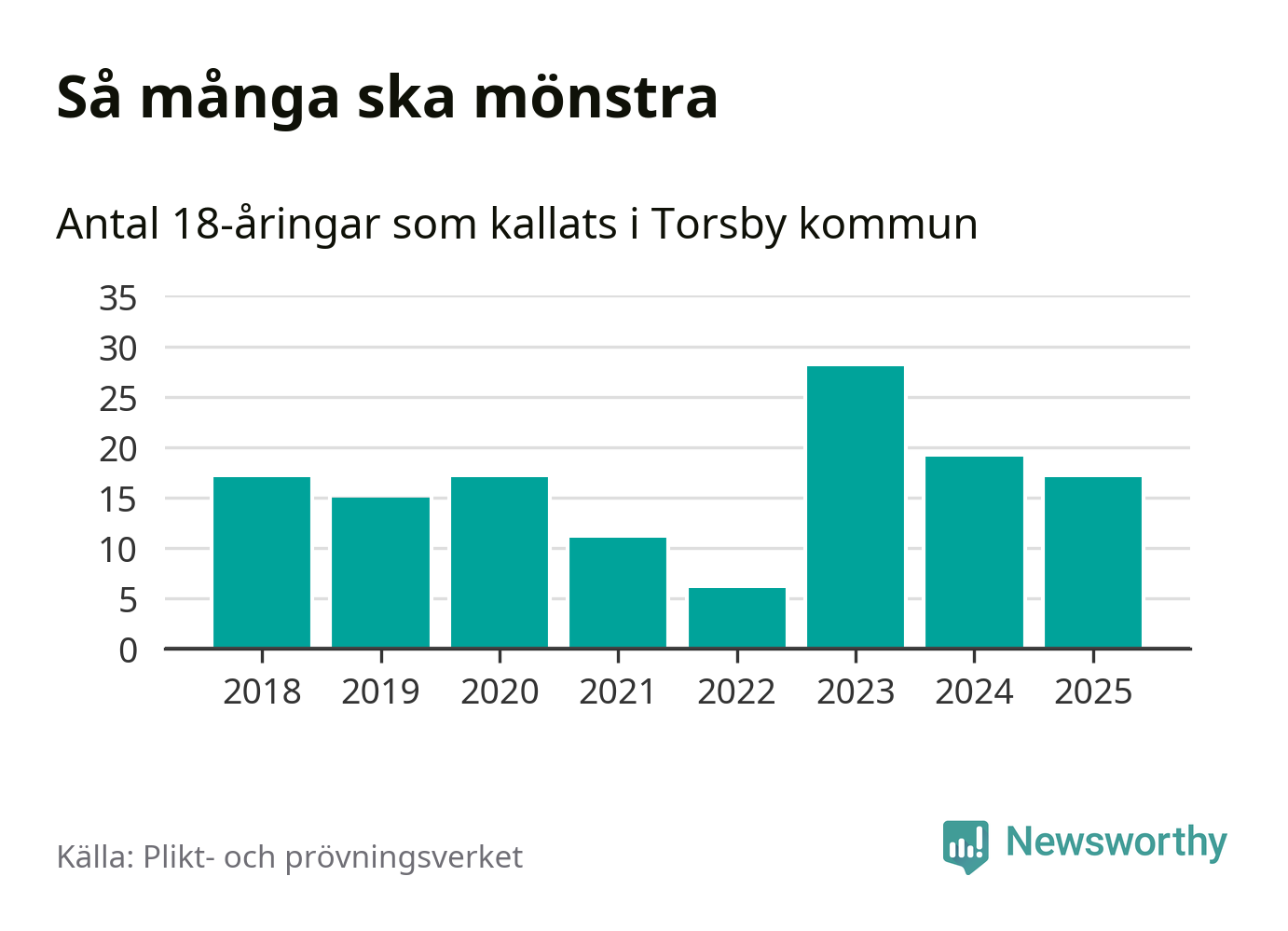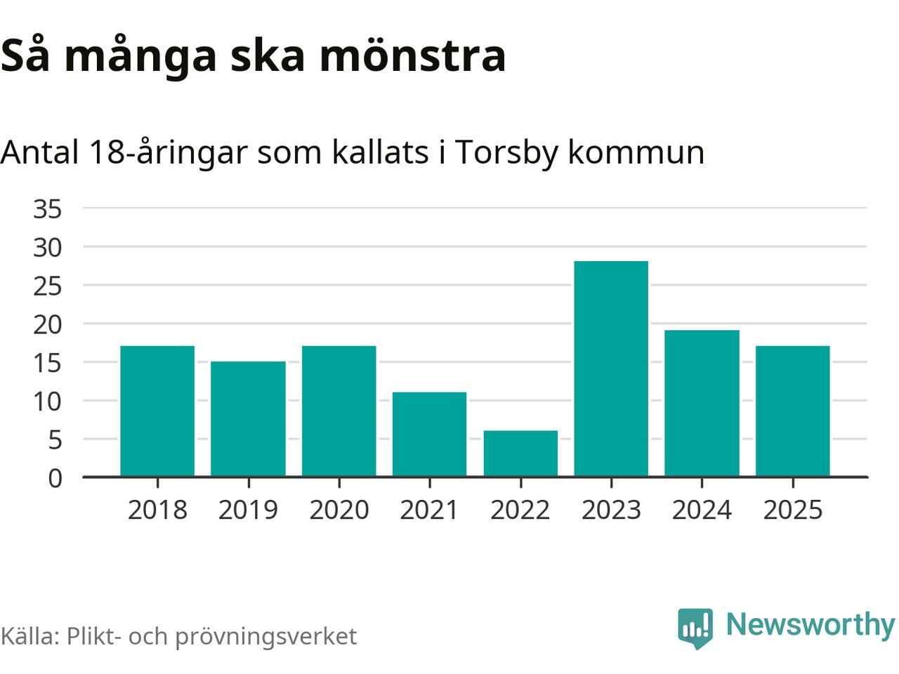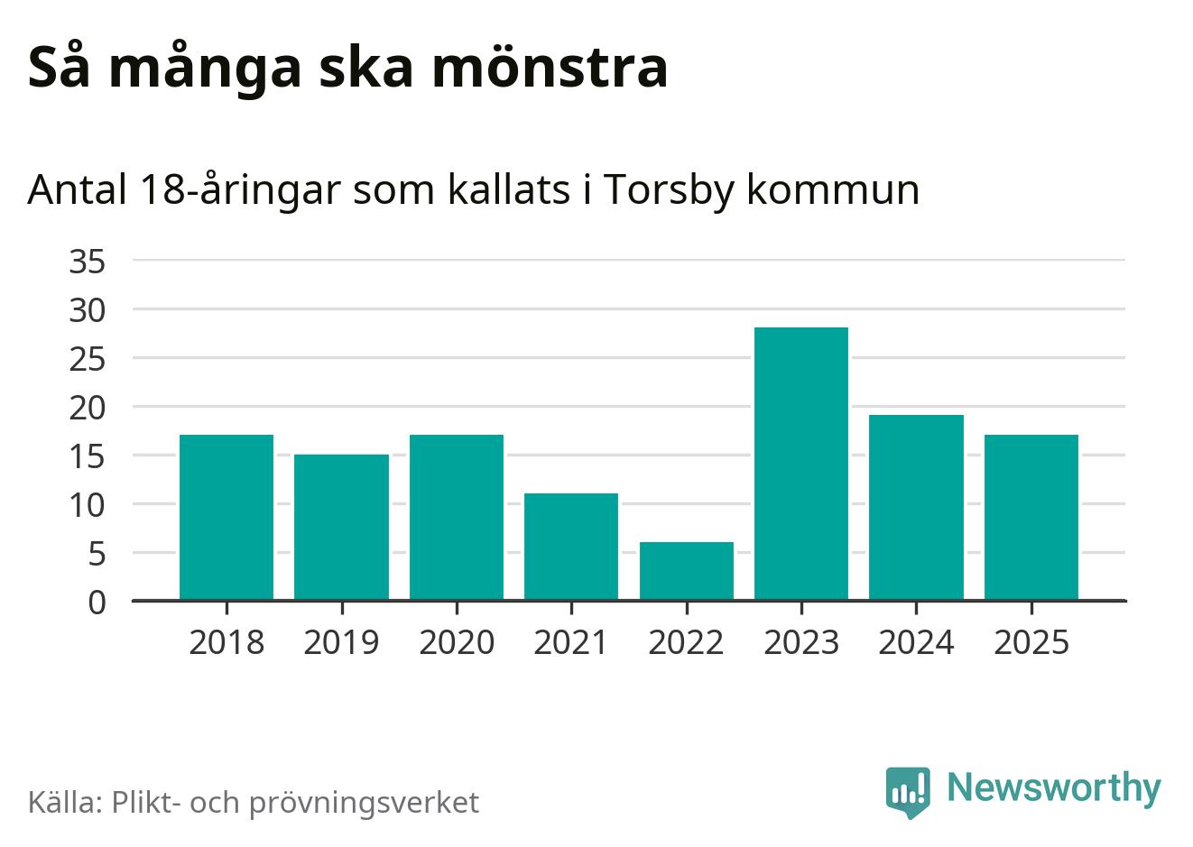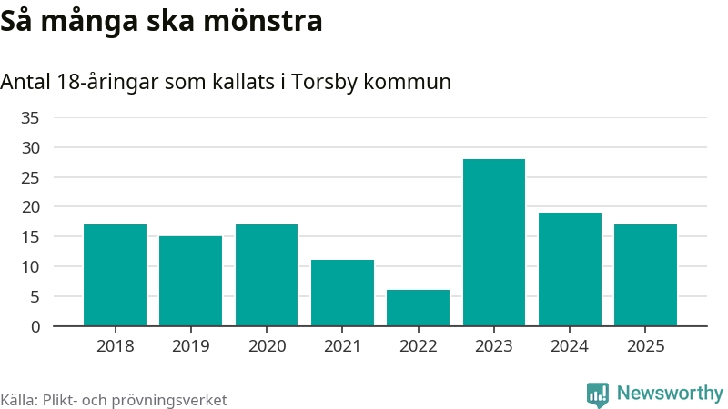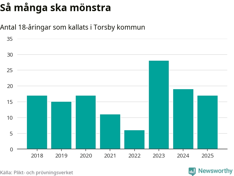 Nu kallas omkring 28 200 svenskar födda 2007 till mönstring. Och 17 av dem kommer från Torsby, enligt ny statistik från Plikt- och prövningsverket. Det innebär att var sjunde invånare i åldersgruppen i kommunen kallas till mönstring. Det är en lägre andel än i Värmland totalt. I riket som helhet kallas nästan var fjärde person i årskullen.