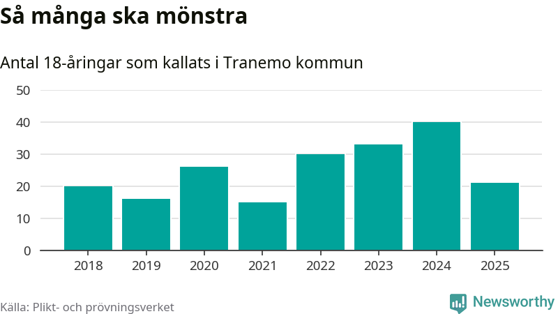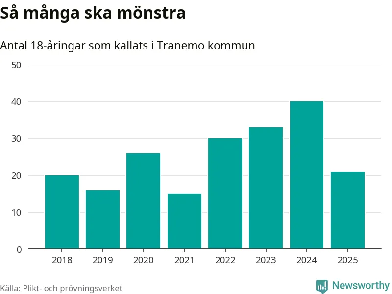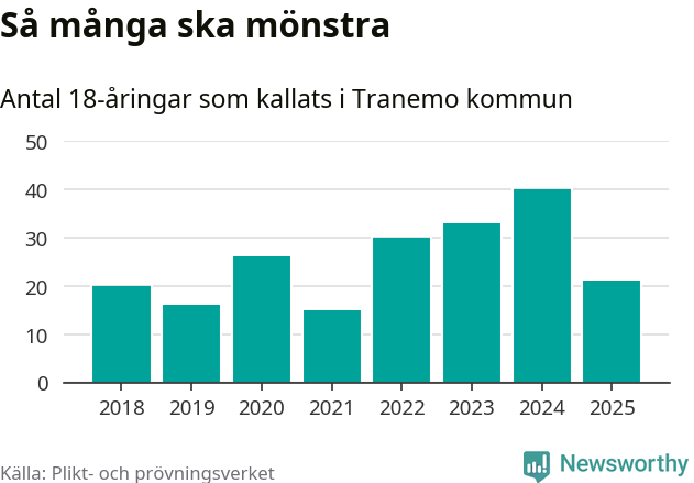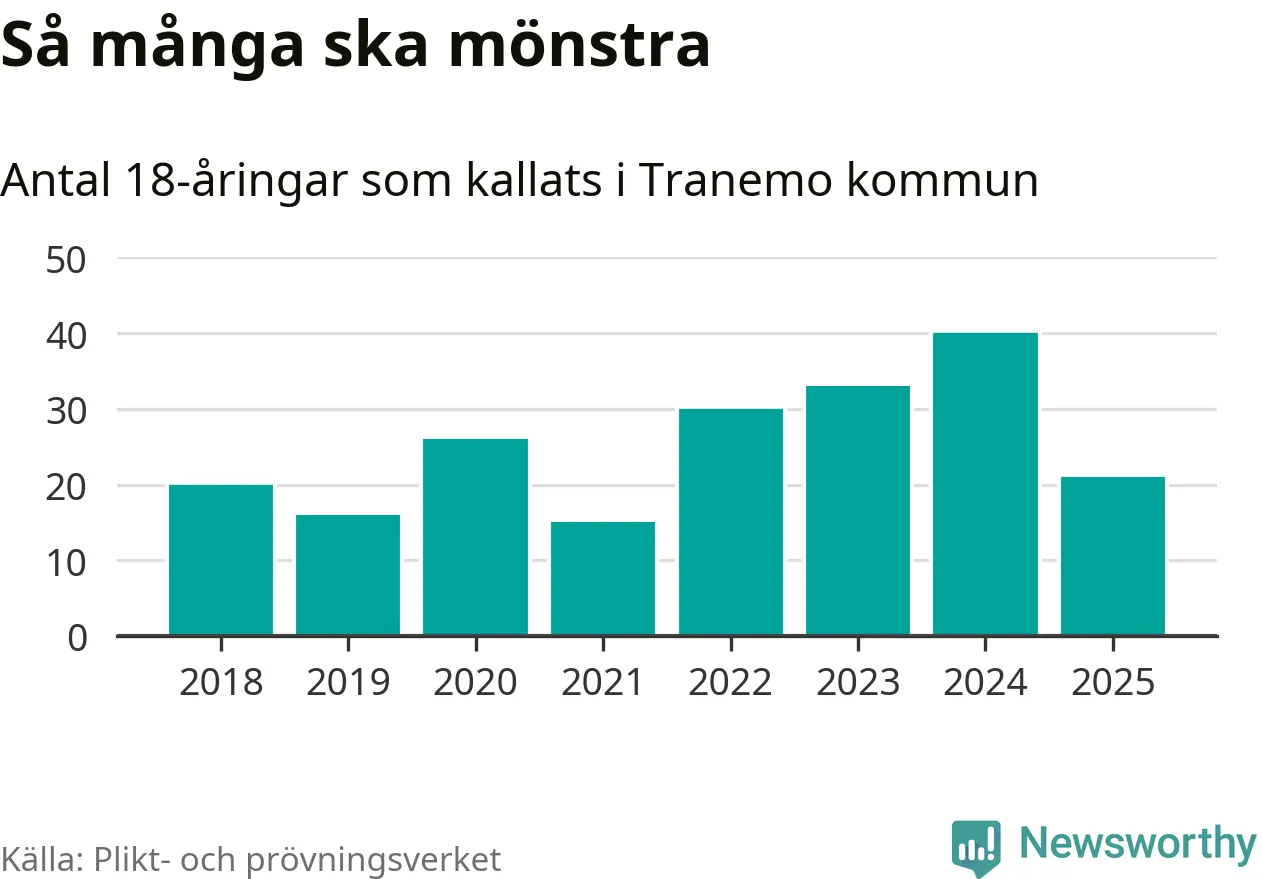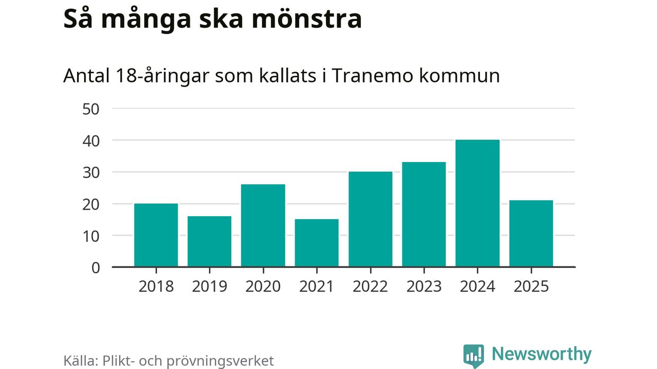 Nu kallas omkring 28 200 svenskar födda 2007 till mönstring. Och 21 av dem kommer från Tranemo, enligt ny statistik från Plikt- och prövningsverket. Det innebär att var sjunde invånare i åldersgruppen i kommunen kallas till mönstring. Det är en lägre andel än i Västra Götaland totalt. I riket som helhet kallas nästan var fjärde person i årskullen.