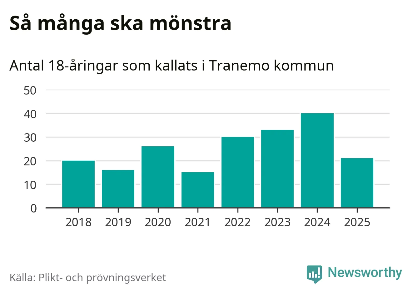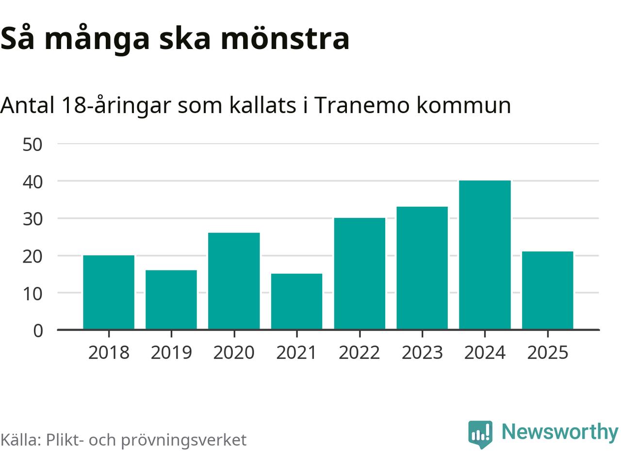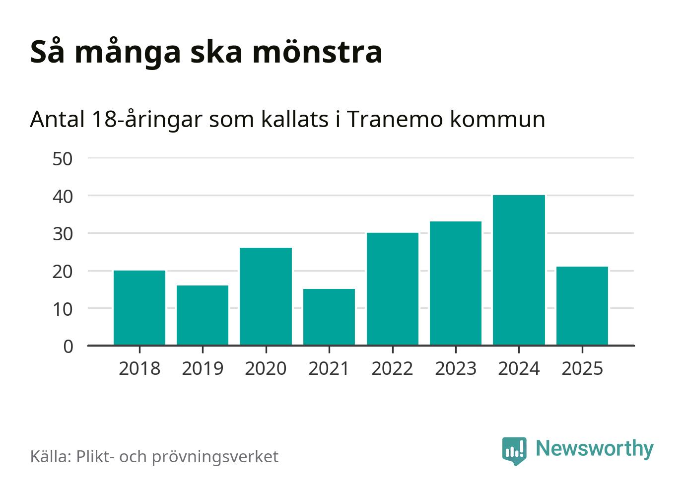 Nu kallas omkring 28 200 svenskar födda 2007 till mönstring. Och 21 av dem kommer från Tranemo, enligt ny statistik från Plikt- och prövningsverket. Det innebär att var sjunde invånare i åldersgruppen i kommunen kallas till mönstring. Det är en lägre andel än i Västra Götaland totalt. I riket som helhet kallas nästan var fjärde person i årskullen.