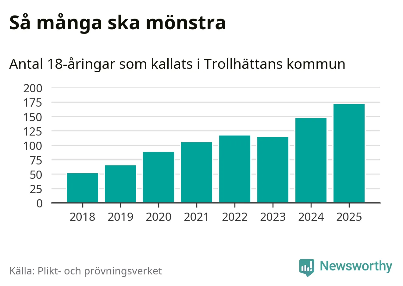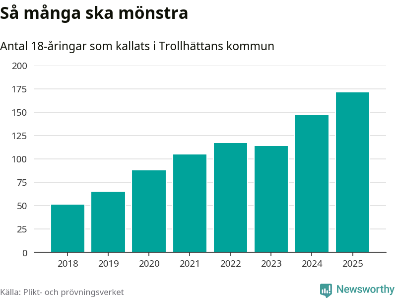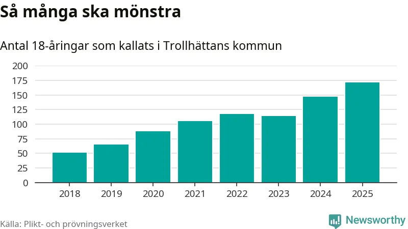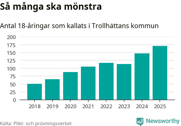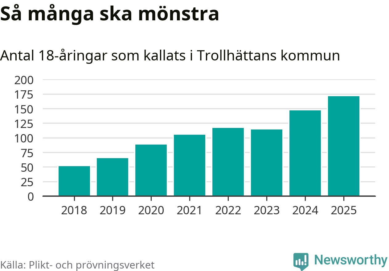 171 personer är det högsta antalet kallade i Trollhättan sedan 2018, som är första året med statistik på kommunnivå (värnplikten återinfördes 2017), och 24 mönstrande fler än 2024. Totalt från Västra Götalands län kallas 4 523 personer i år.
