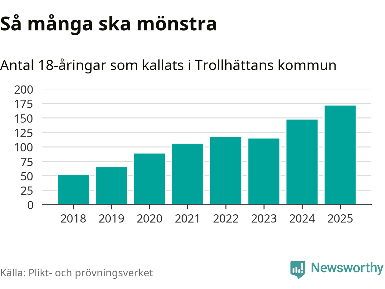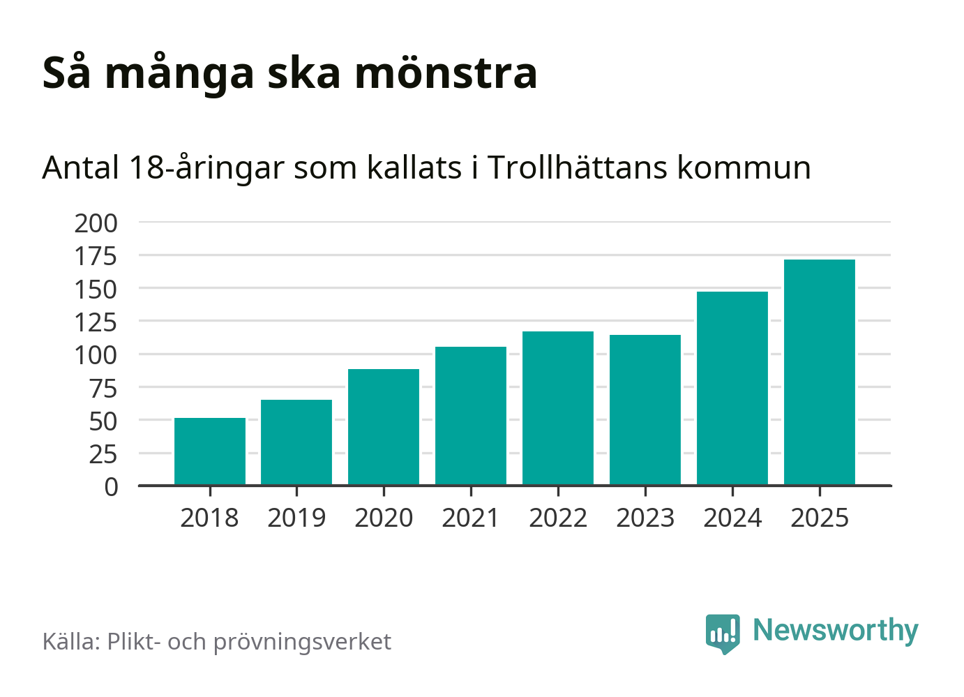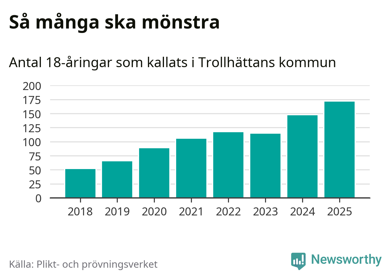 171 personer är det högsta antalet kallade i Trollhättan sedan 2018, som är första året med statistik på kommunnivå (värnplikten återinfördes 2017), och 24 mönstrande fler än 2024. Totalt från Västra Götalands län kallas 4 523 personer i år.