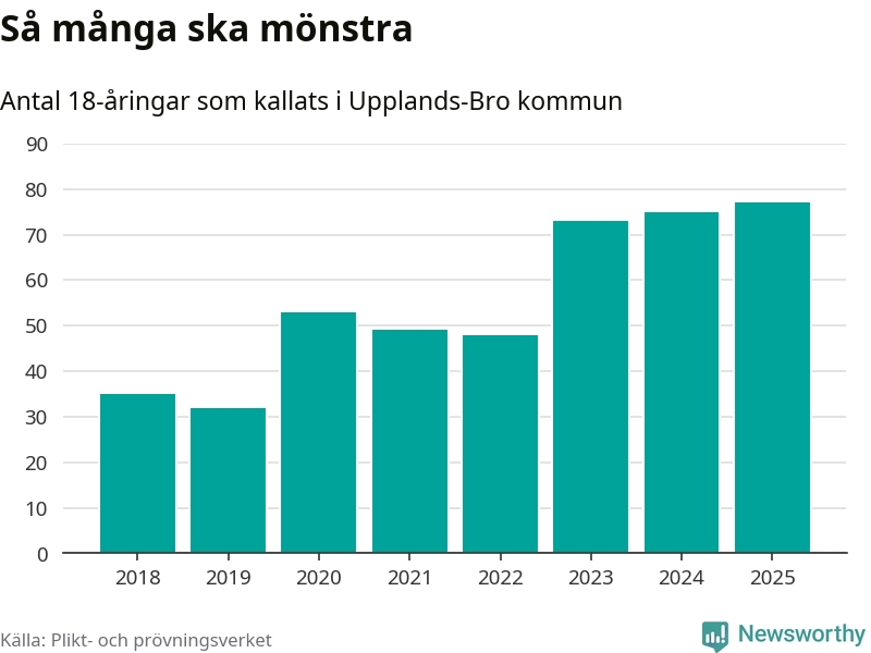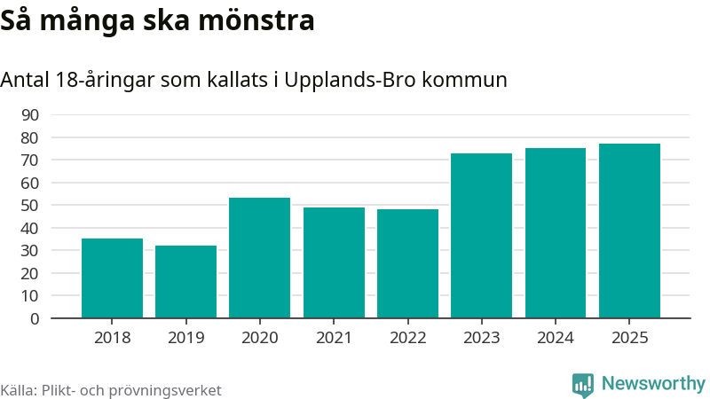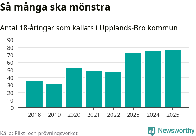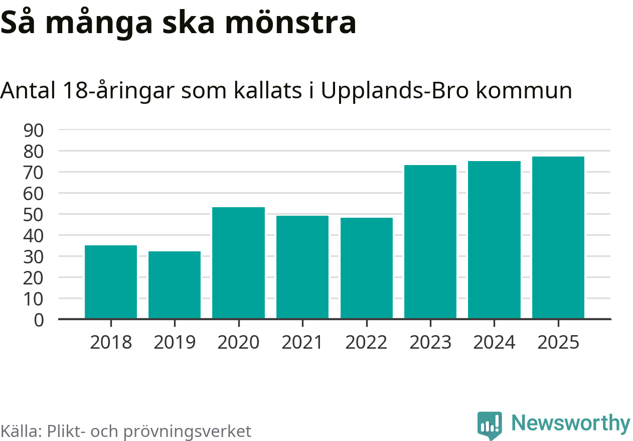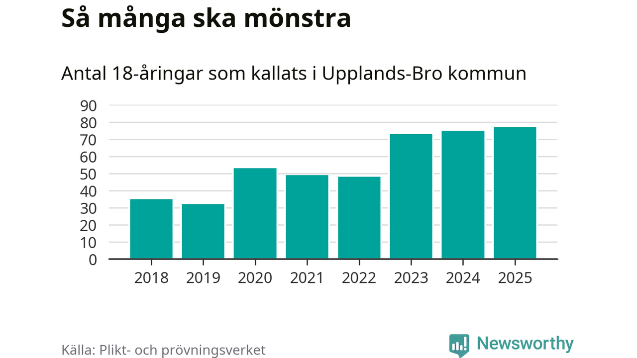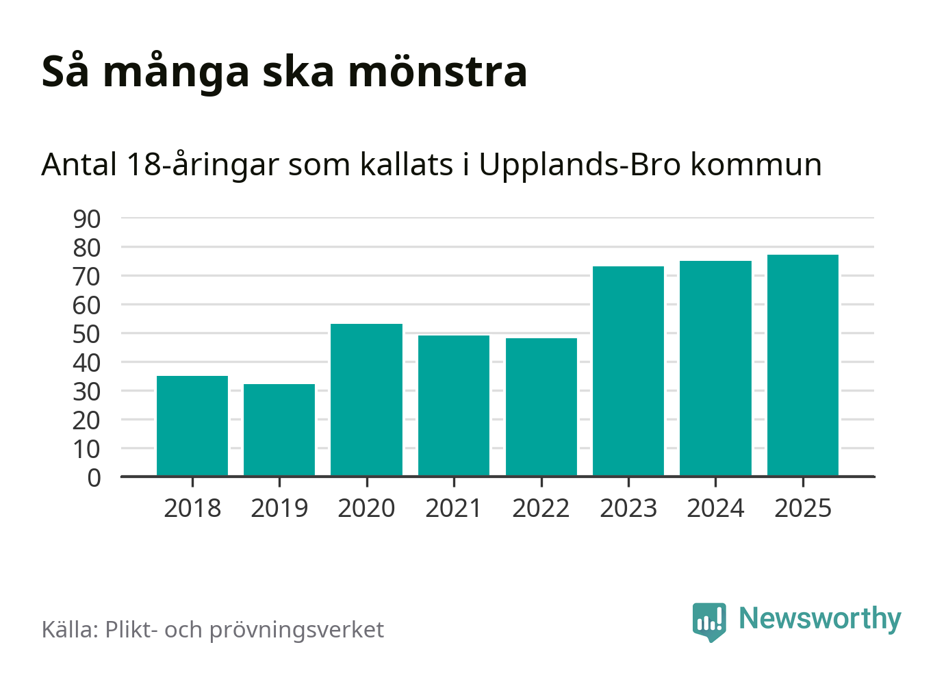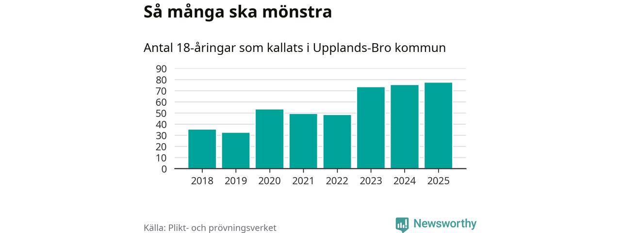 77 personer är det högsta antalet kallade i Upplands-Bro sedan 2018, som är första året med statistik på kommunnivå (värnplikten återinfördes 2017), och två mönstrande fler än 2024. Totalt från Stockholms län kallas 6 801 personer i år.