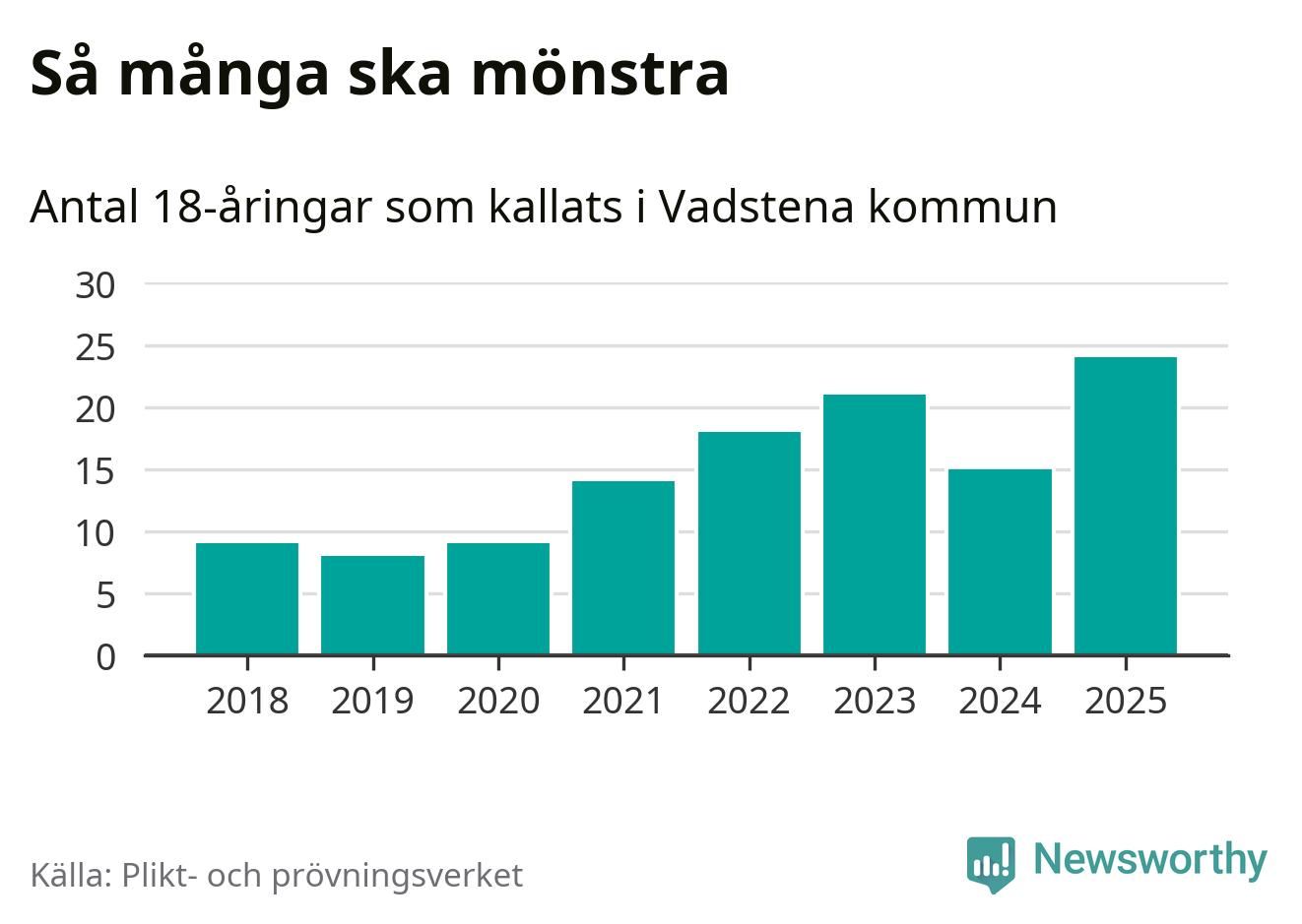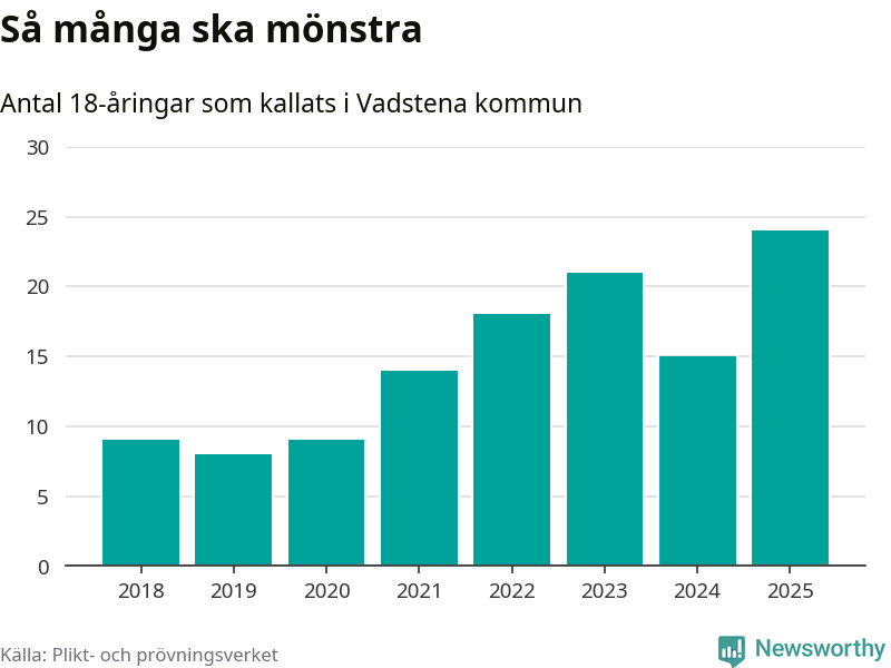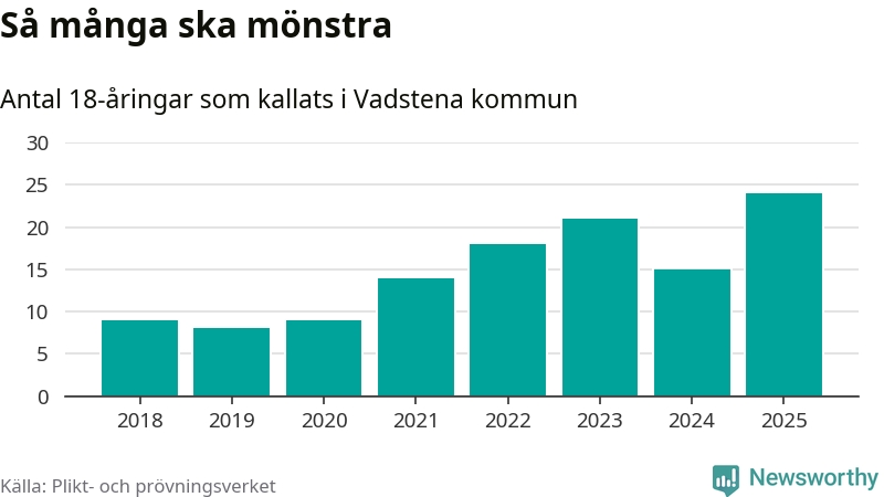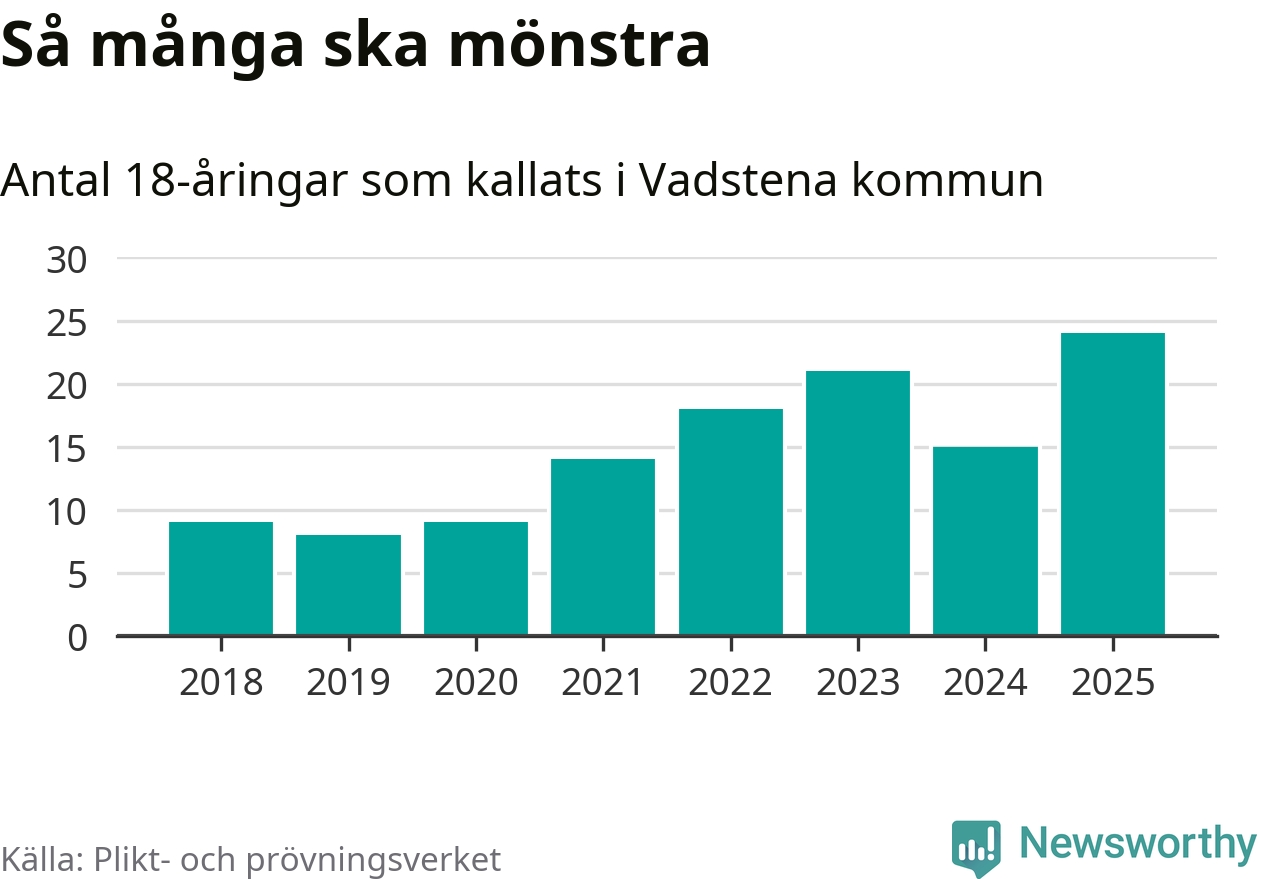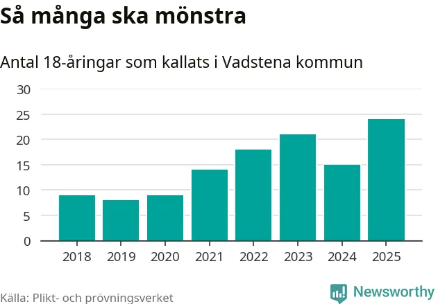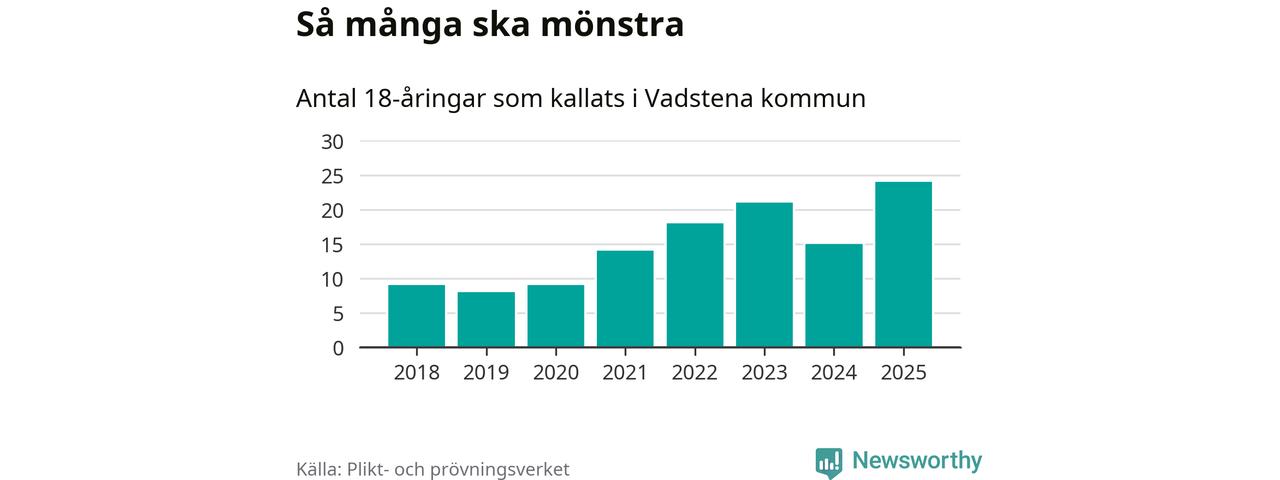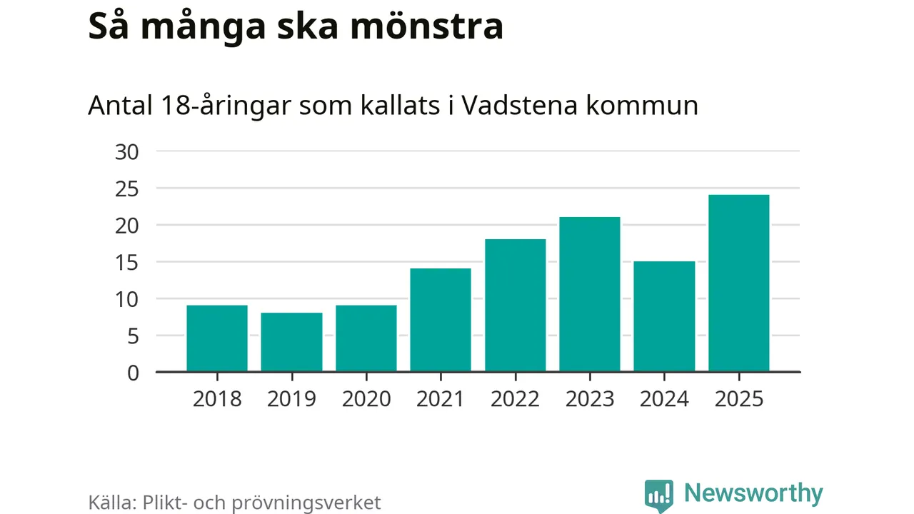 24 personer är det högsta antalet kallade i Vadstena sedan 2018, som är första året med statistik på kommunnivå (värnplikten återinfördes 2017), och nio mönstrande fler än 2024. Totalt från Östergötlands län kallas 1 306 personer i år.