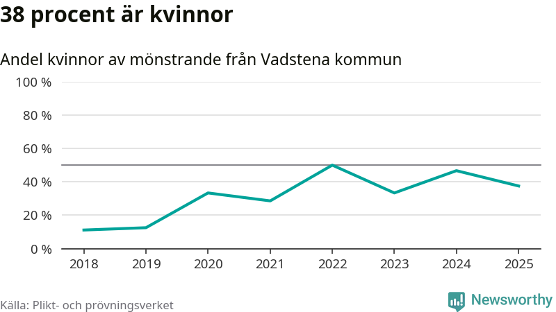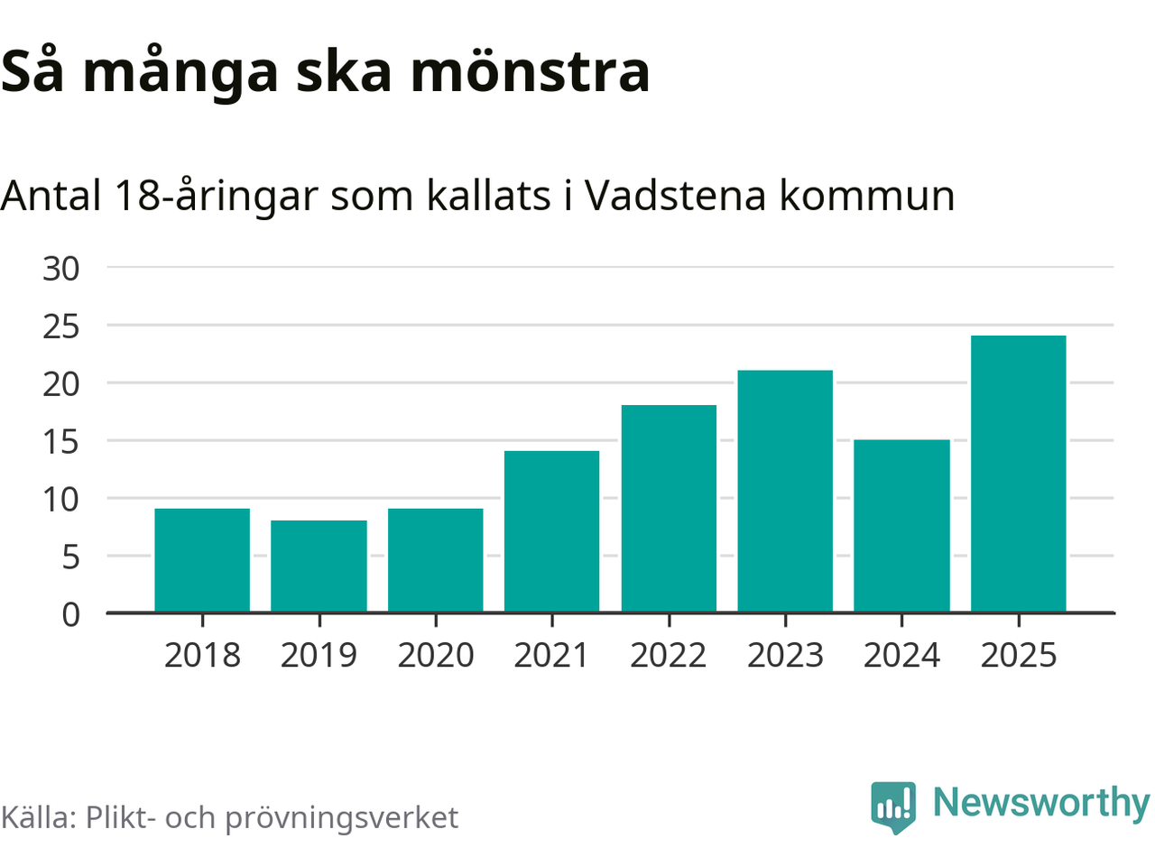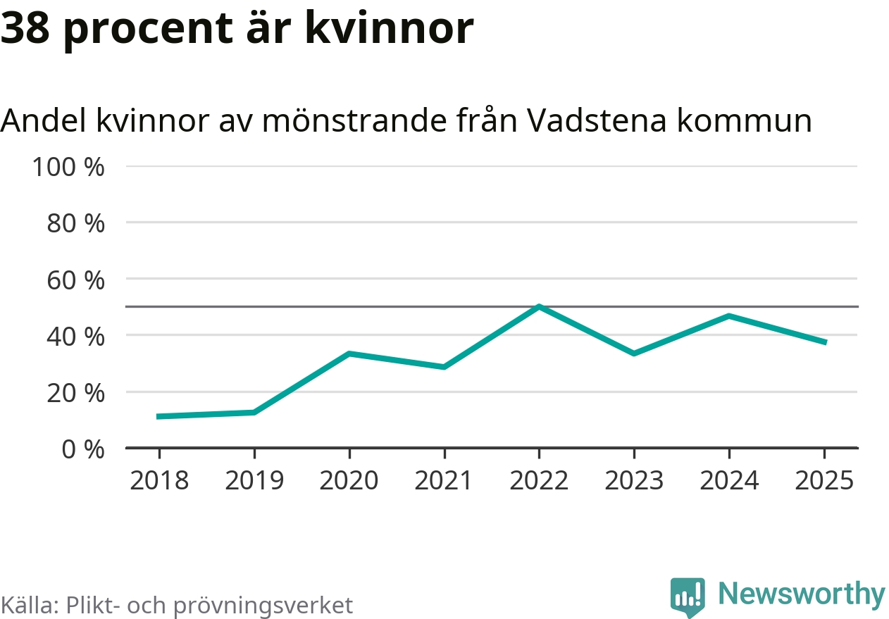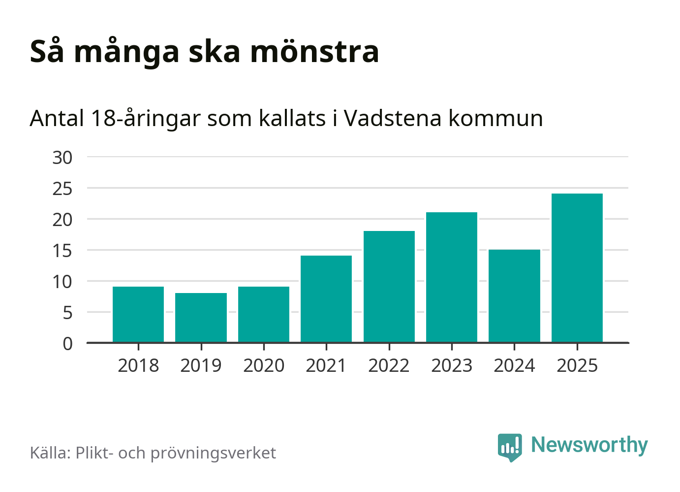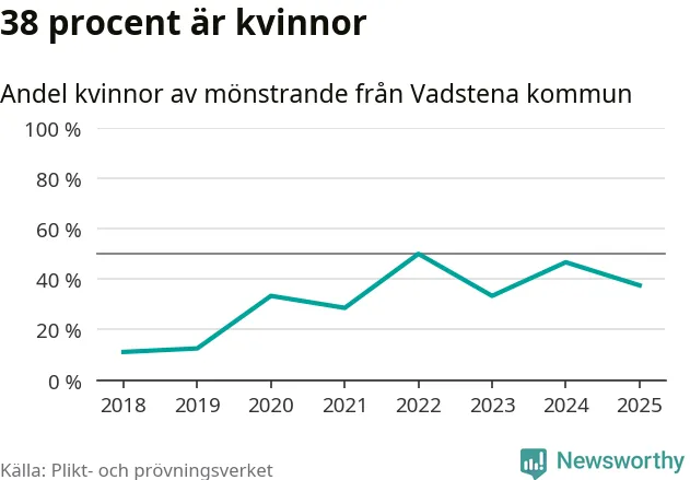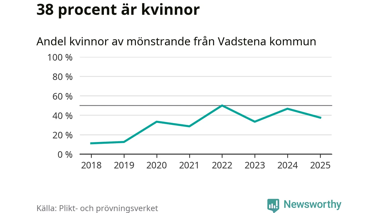 24 personer är det högsta antalet kallade i Vadstena sedan 2018, som är första året med statistik på kommunnivå (värnplikten återinfördes 2017), och nio mönstrande fler än 2024. Totalt från Östergötlands län kallas 1 306 personer i år.
