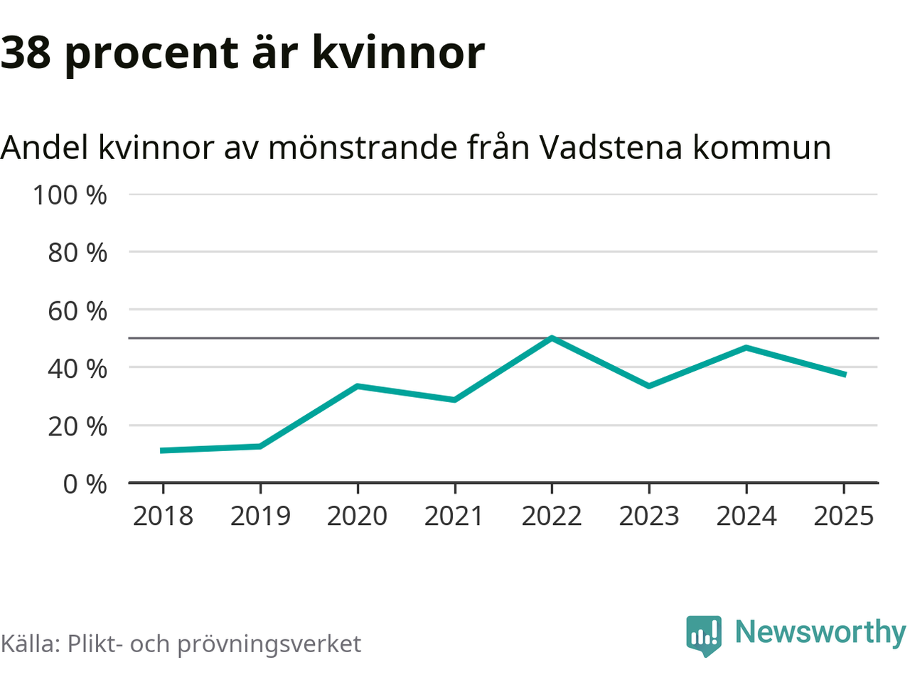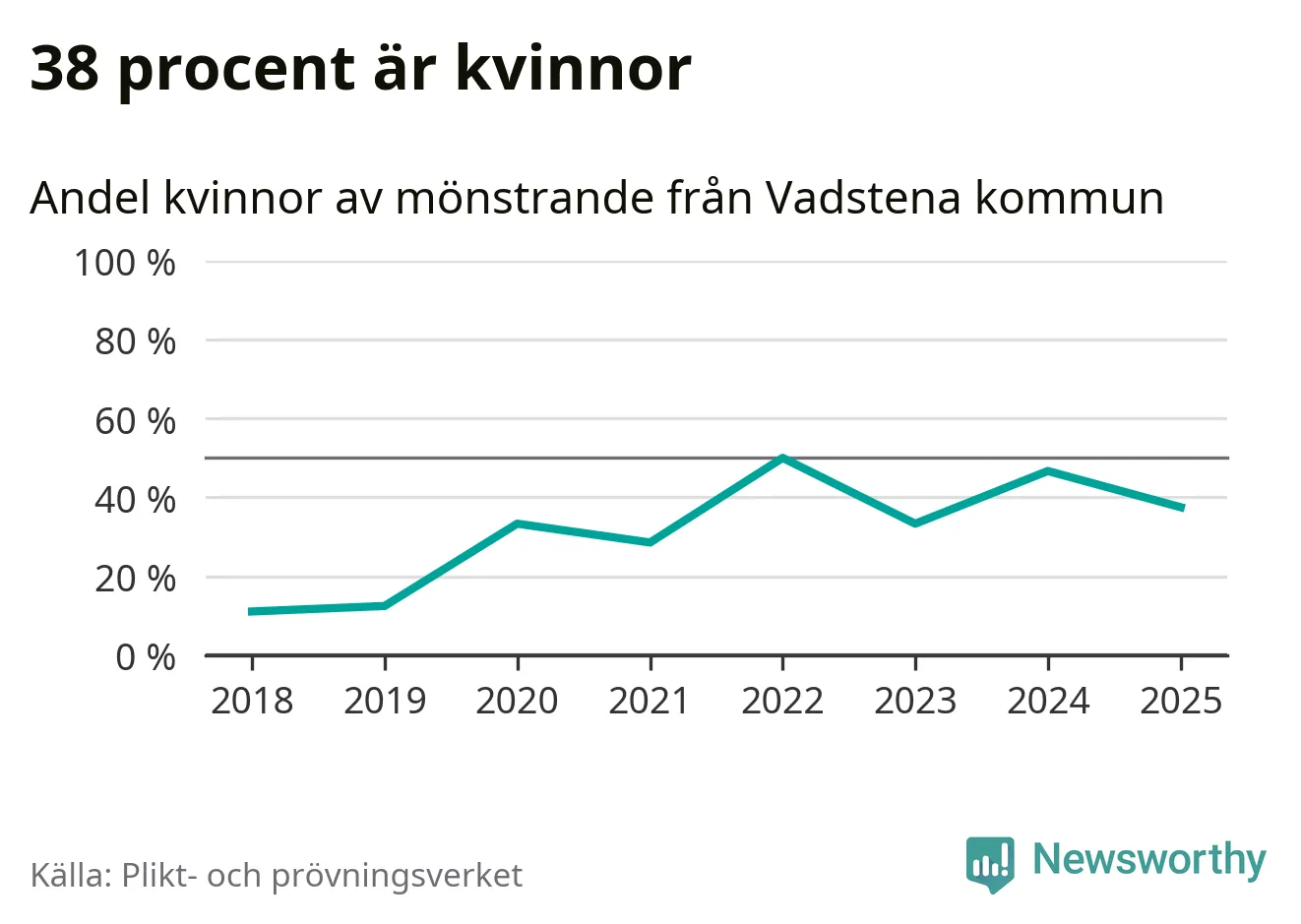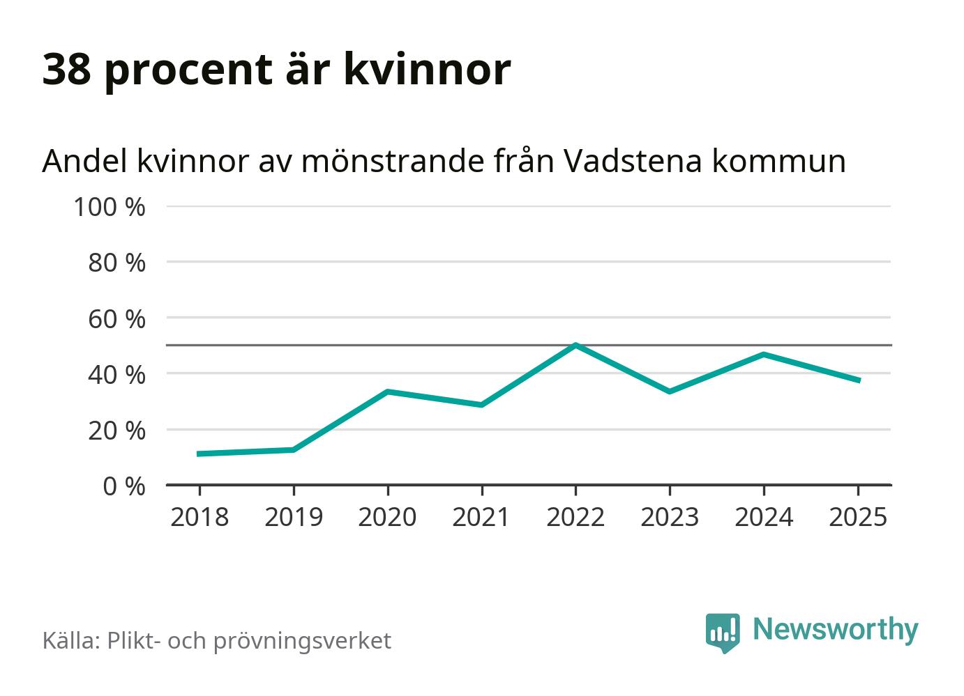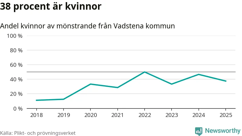 Nio av de som kallats till mönstring från Vadstena är kvinnor, vilket motsvarar 38 procent av de mönstrande. I absoluta tal är det fler kvinnor än något år sedan värnplikten återinfördes, men 2022 var en större andel av de mönstrande från kommunen kvinnor (50 procent). I riket som helhet är 28 procent av de mönstrande tjejer.