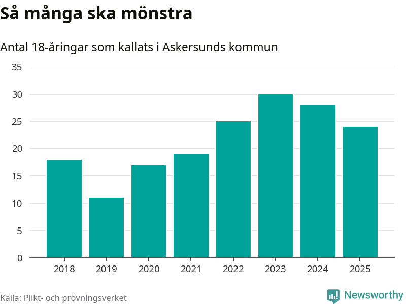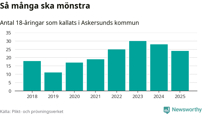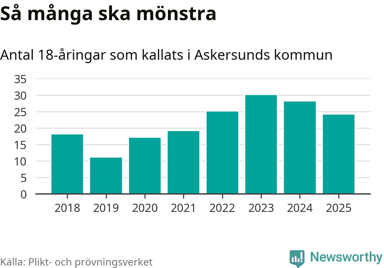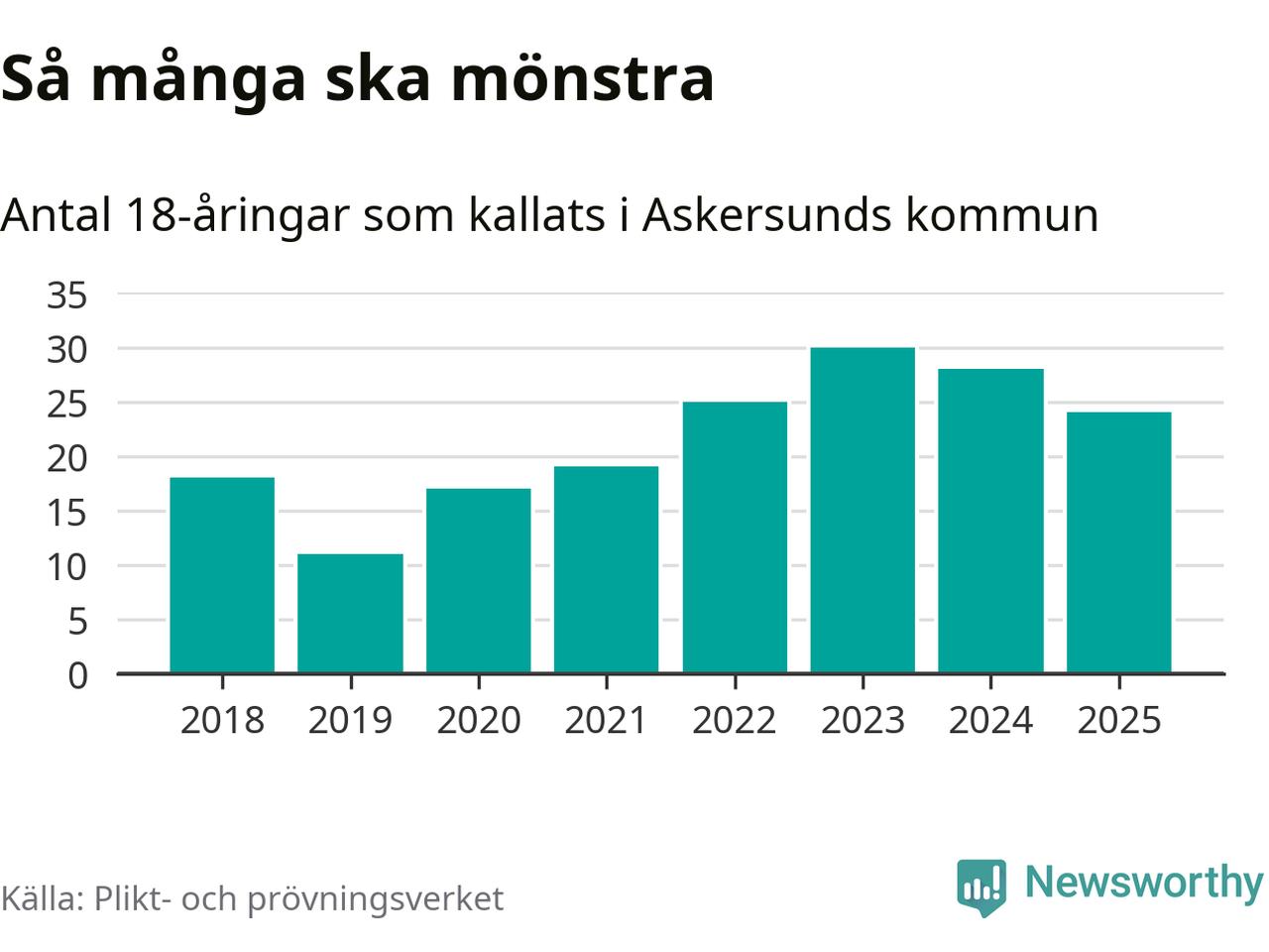 Nu kallas omkring 28 200 svenskar födda 2007 till mönstring. Och 24 av dem kommer från Askersund, enligt ny statistik från Plikt- och prövningsverket. Det innebär att var femte invånare i åldersgruppen i kommunen kallas till mönstring. Det är ungefär lika stor andel som i Örebro län totalt. I riket som helhet kallas nästan var fjärde person i årskullen.