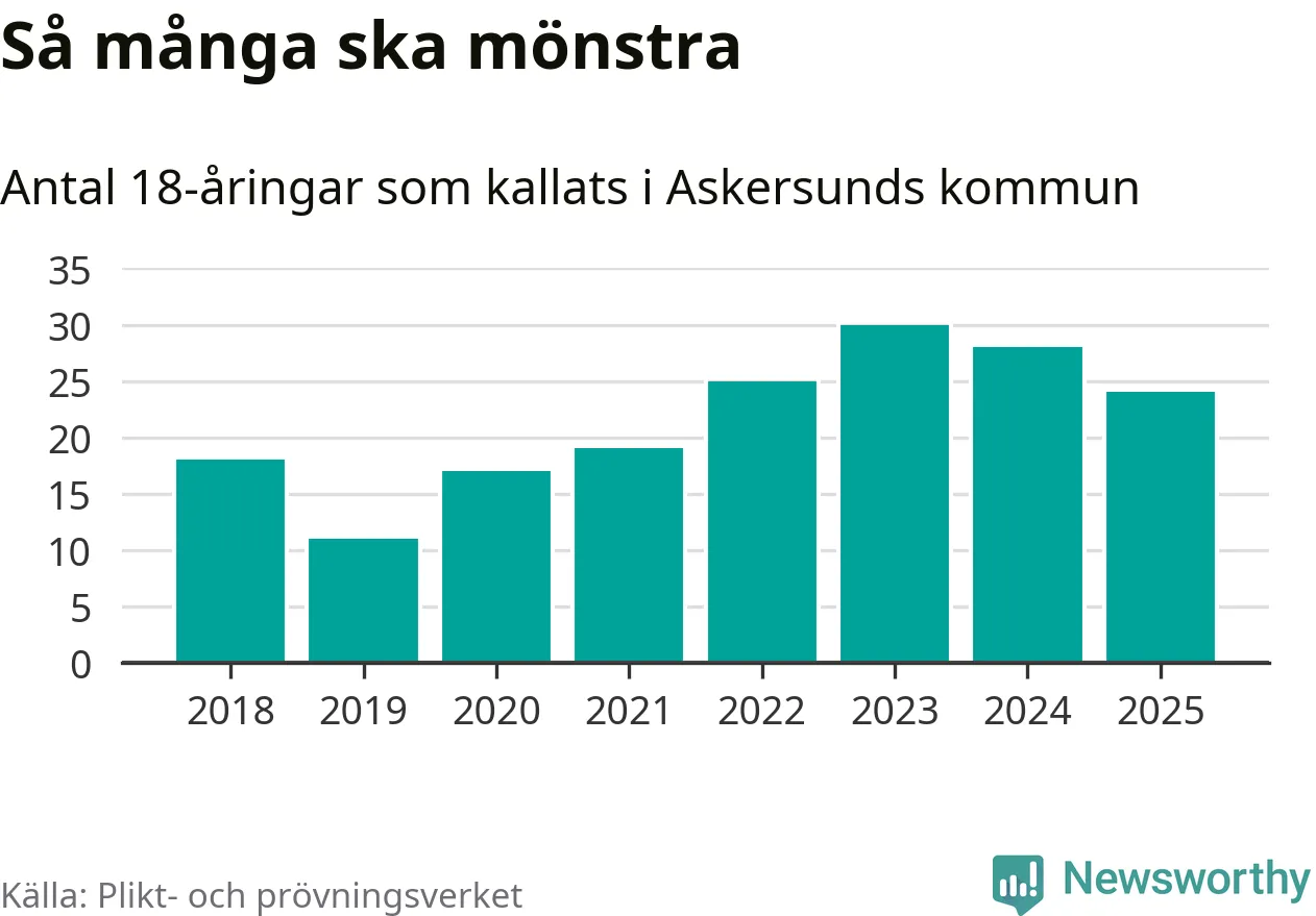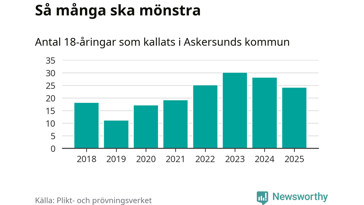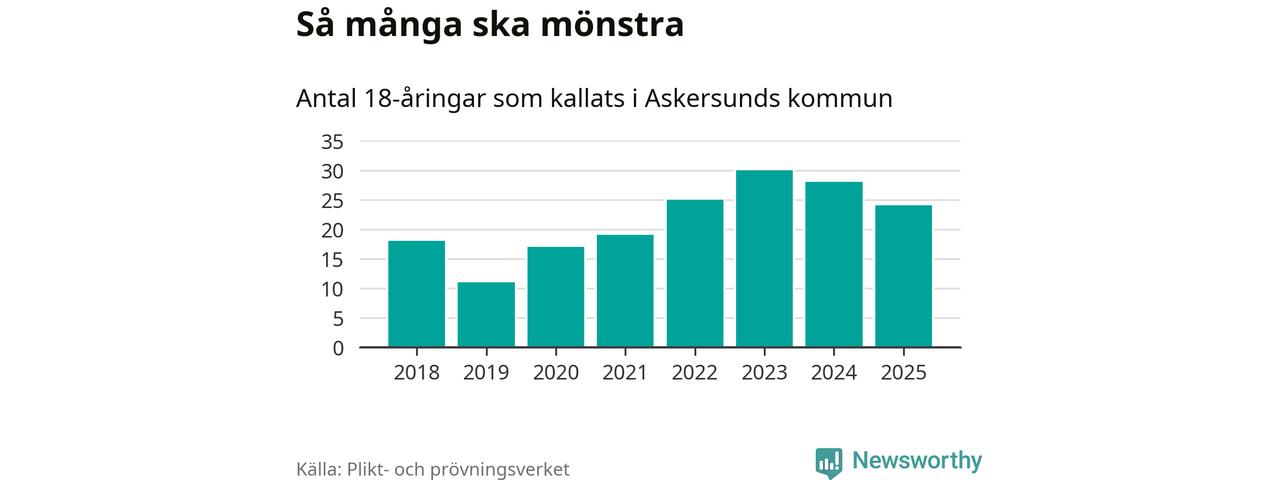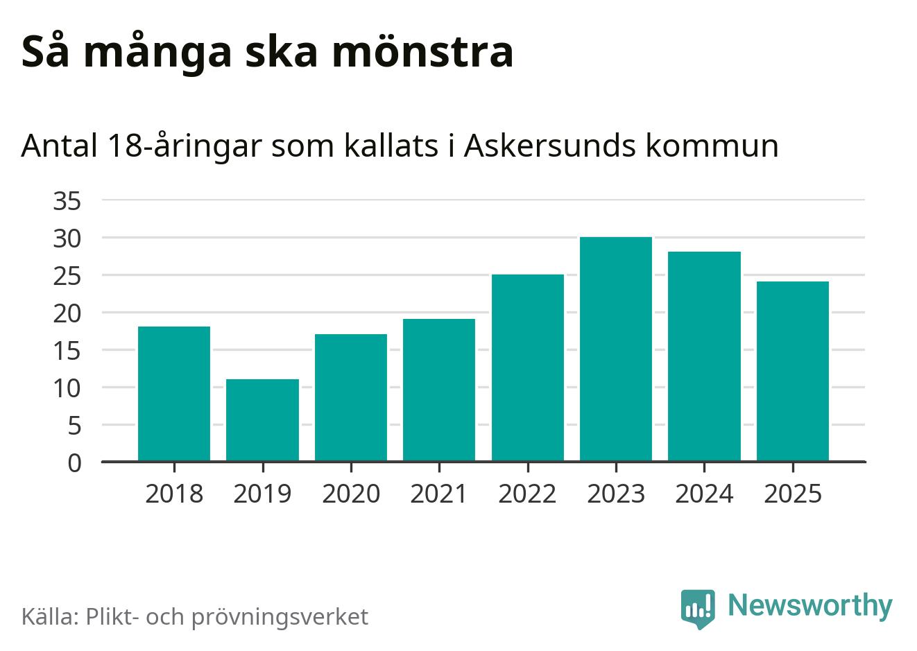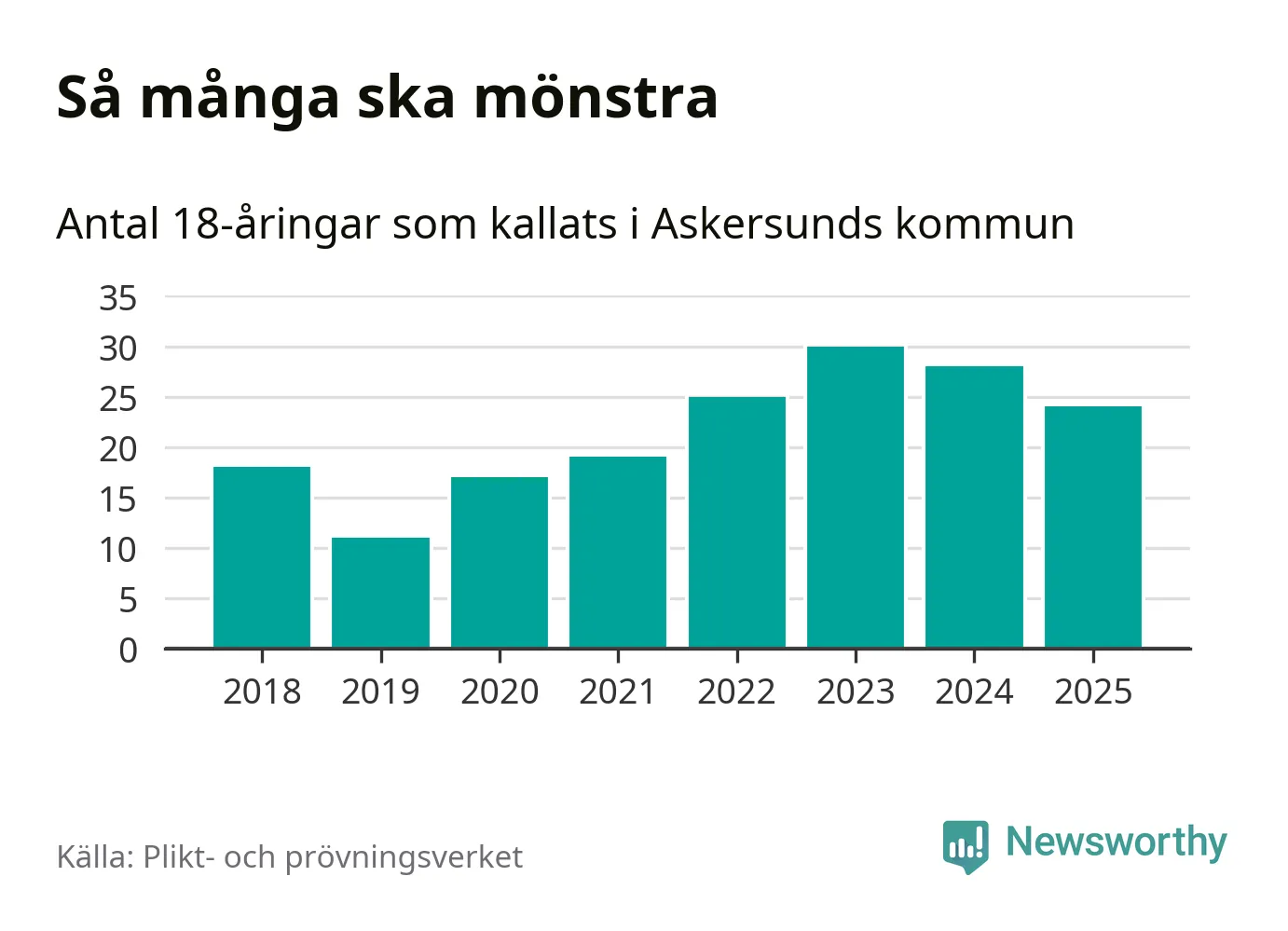 Av de som skrivits in till någon av Försvarmaktens grundutbildningar det senaste året, från juni 2024 till mars i år, kommer sju (fyra män och tre kvinnor) från Askersund. Sex av dessa antogs efter att ha kallats till mönstring.