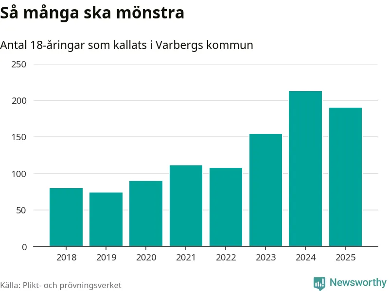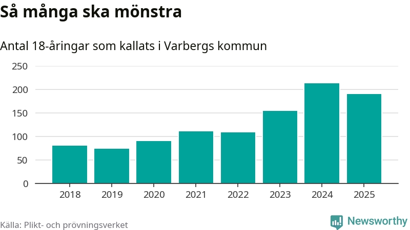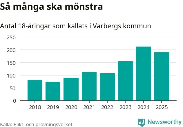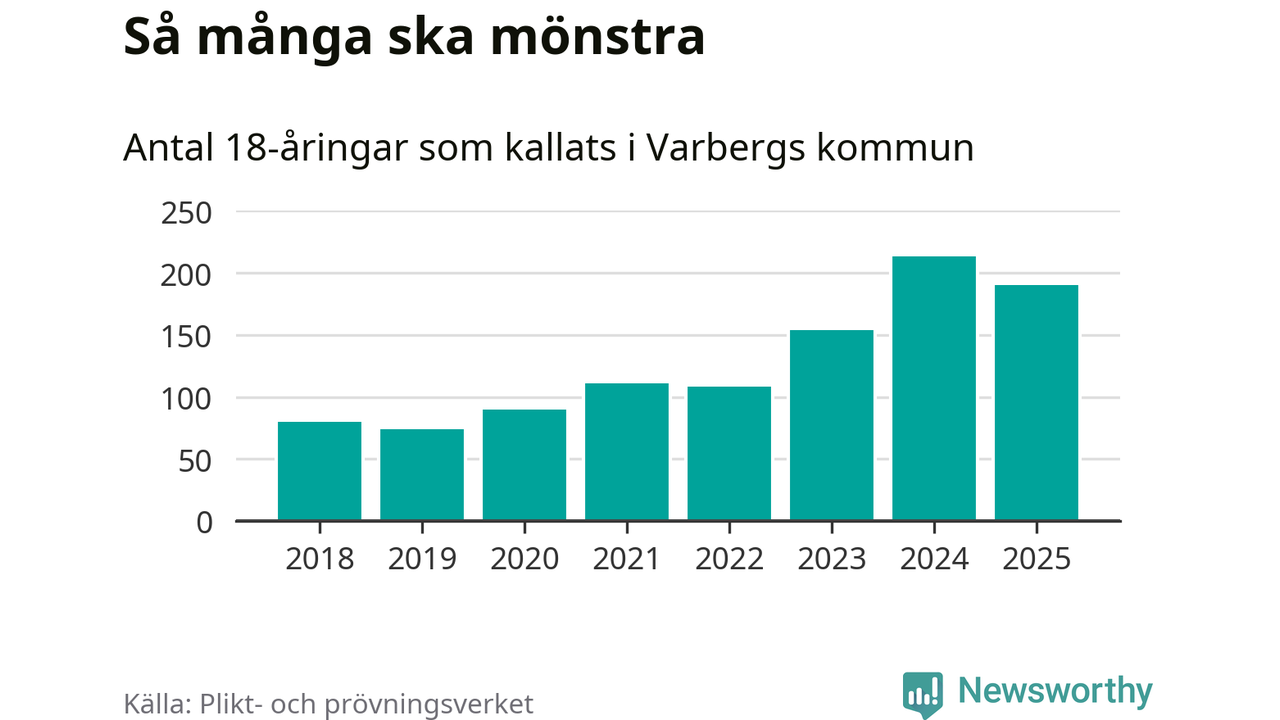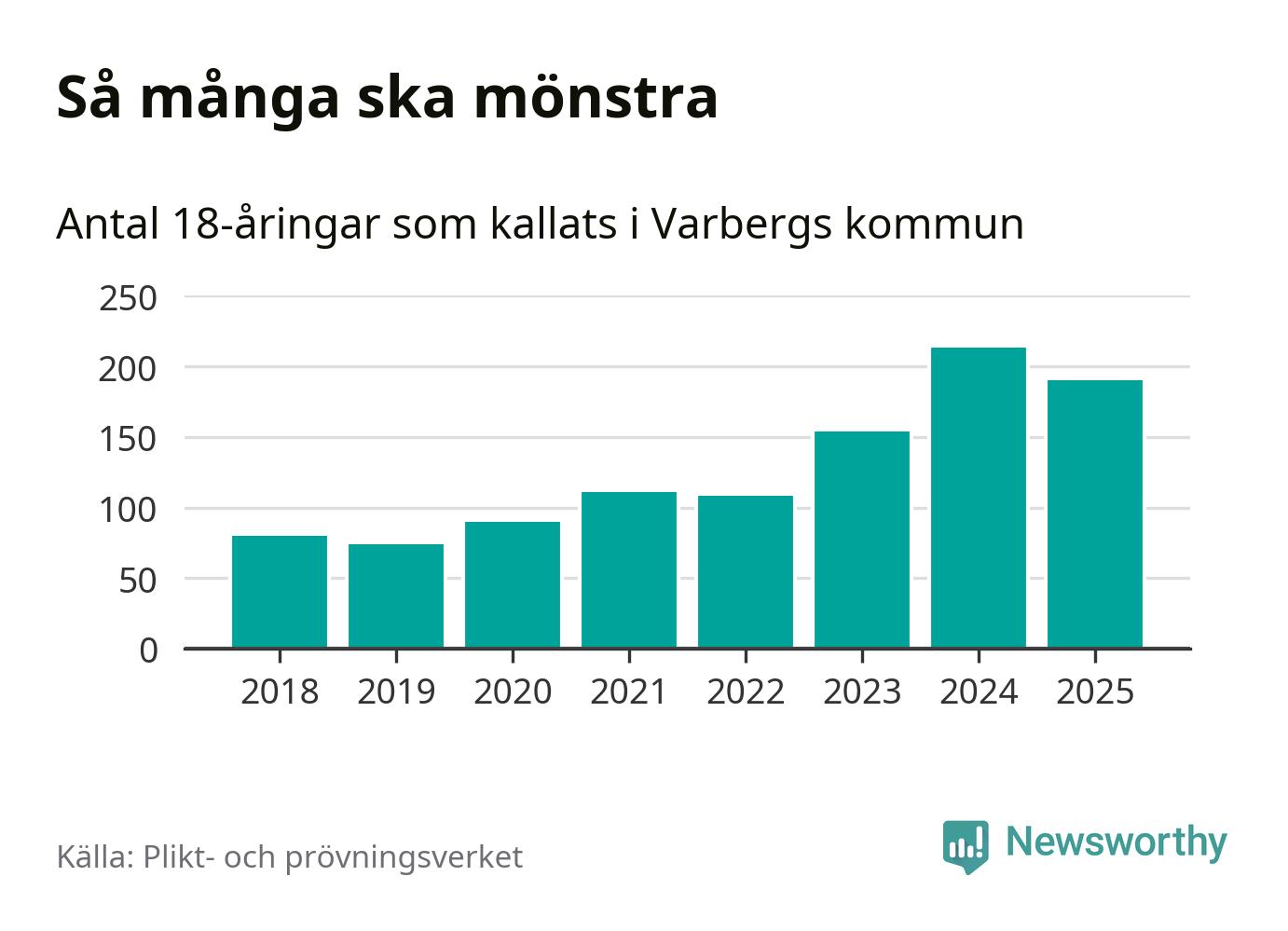 Nu kallas omkring 28 200 svenskar födda 2007 till mönstring. Och 190 av dem kommer från Varberg, enligt ny statistik från Plikt- och prövningsverket. Det innebär att var fjärde invånare i åldersgruppen i kommunen kallas till mönstring. Det är ungefär lika stor andel som i Halland totalt. I riket som helhet kallas nästan var fjärde person i årskullen.