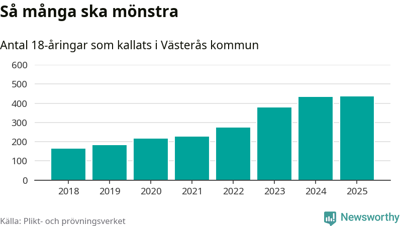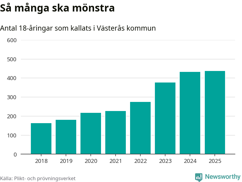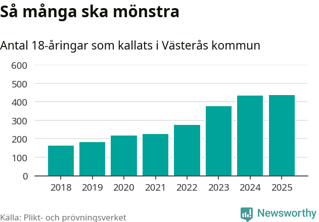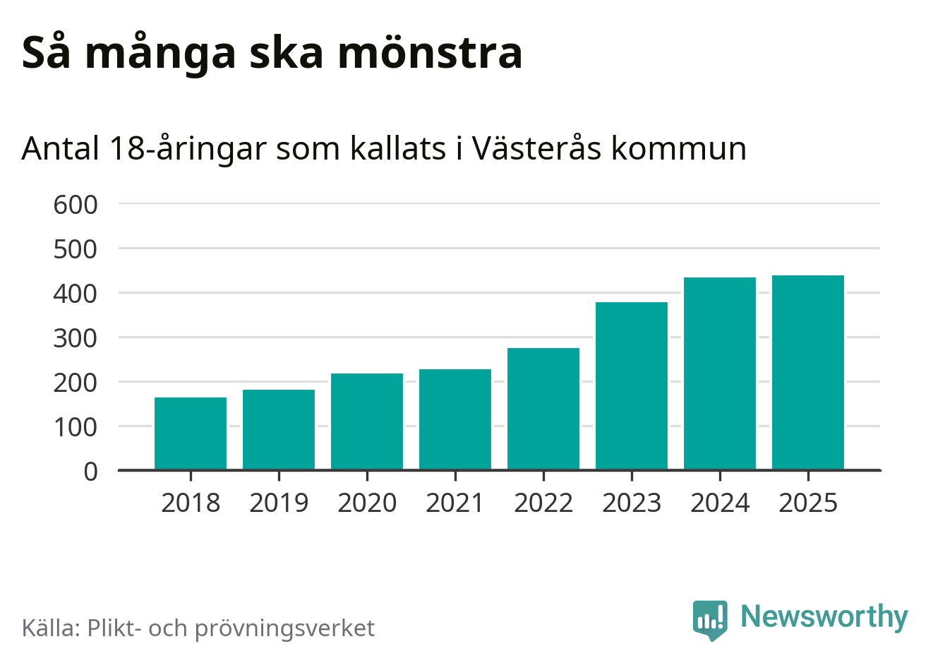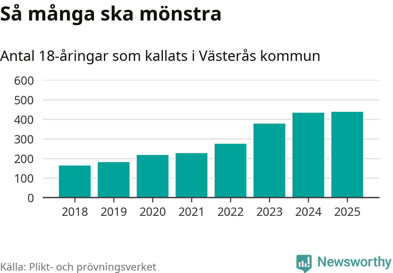 Nu kallas omkring 28 200 svenskar födda 2007 till mönstring. Och 437 av dem kommer från Västerås, enligt ny statistik från Plikt- och prövningsverket. Det innebär att nästan var fjärde invånare i åldersgruppen i kommunen kallas till mönstring. Det är ungefär lika stor andel som i Västmanland totalt. Även i riket som helhet kallas nästan var fjärde person i årskullen.