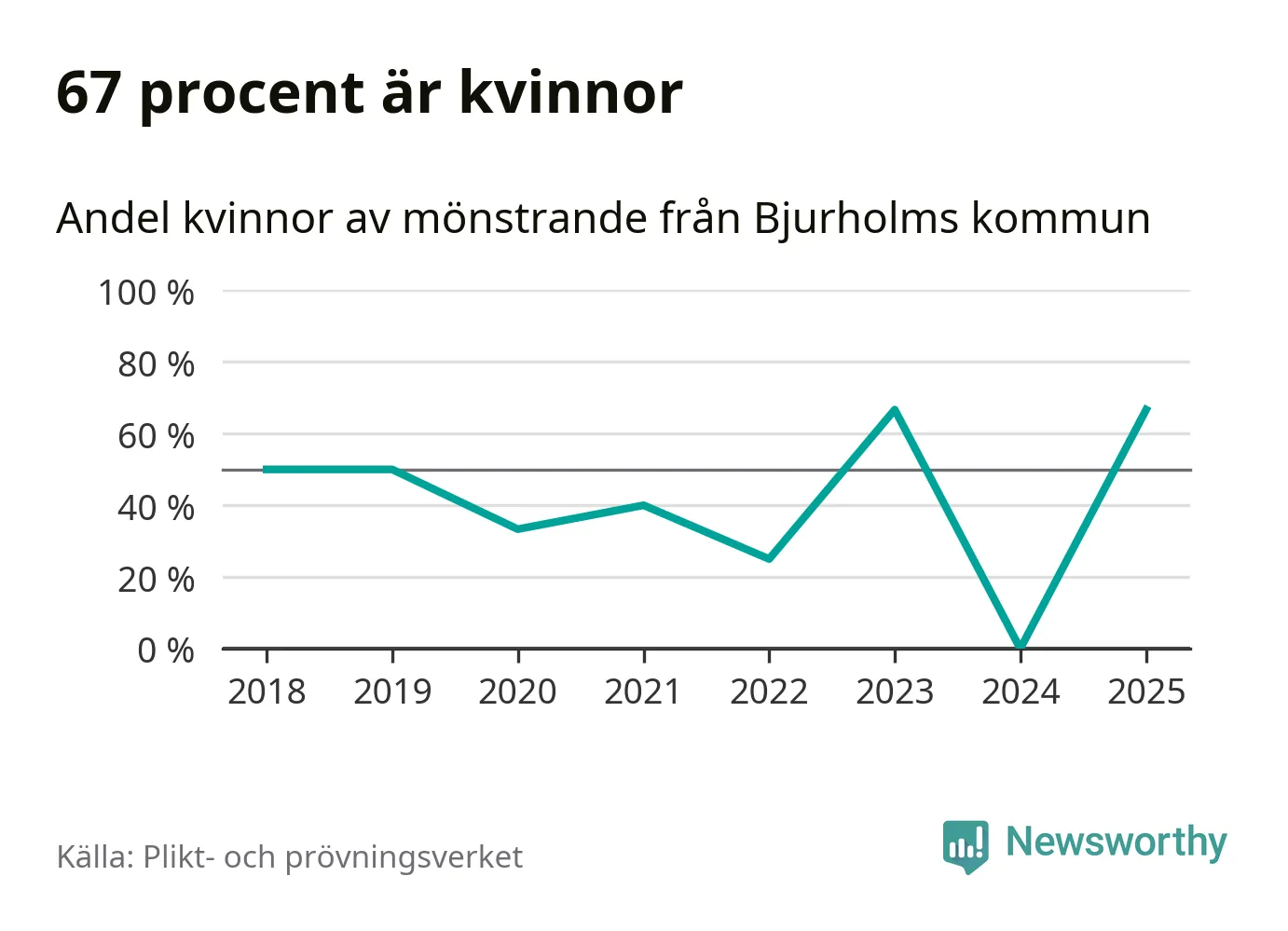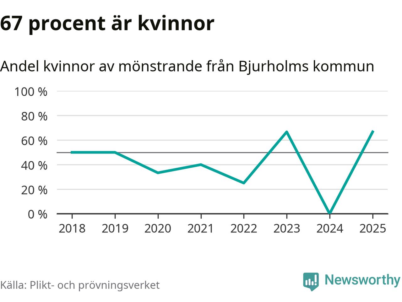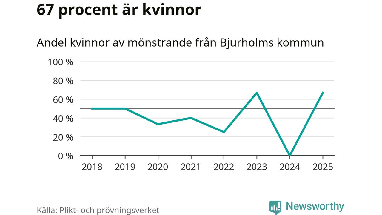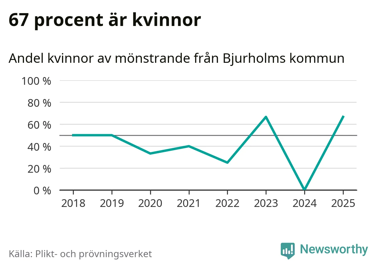 Två av de som kallats till mönstring från Bjurholm är kvinnor, vilket motsvarar 67 procent av de mönstrande. Det är en rekordstor andel av de mönstrande, men 2023 och 2019 var det fler kvinnor från kommunen – fyra stycken – som mönstrade. I riket som helhet är 28 procent av de mönstrande tjejer.